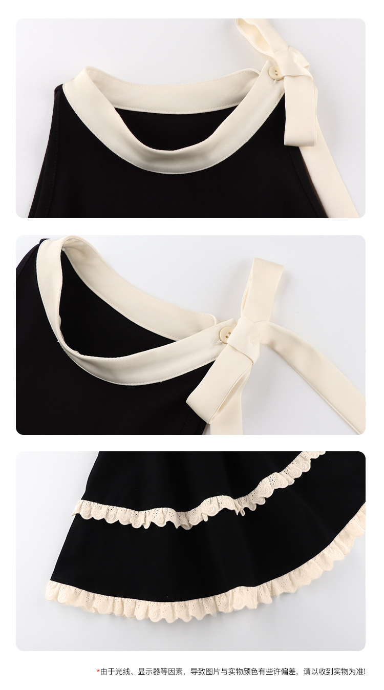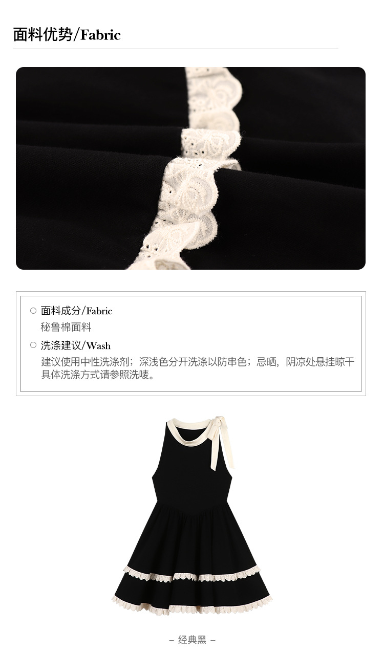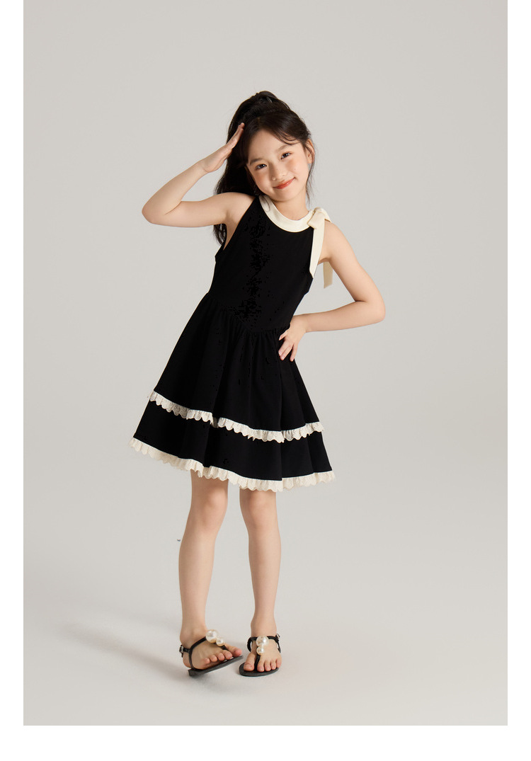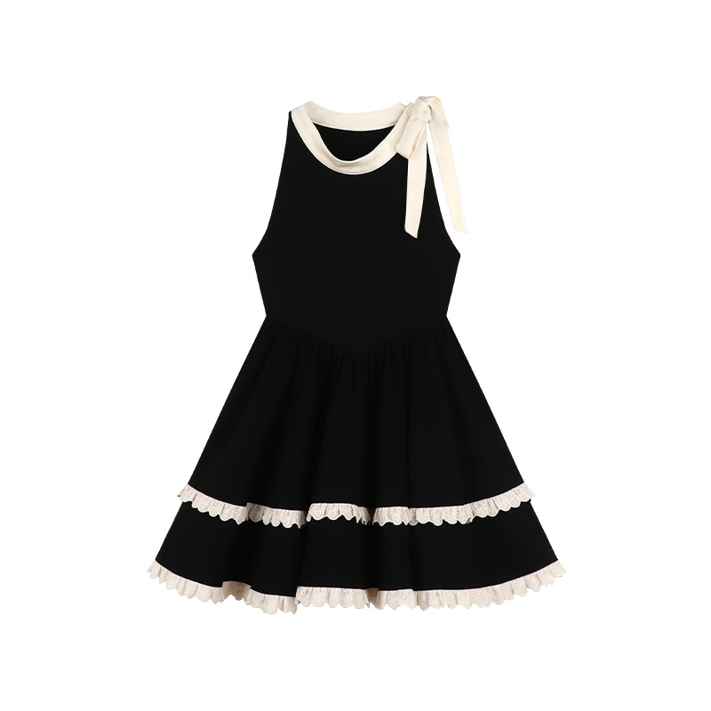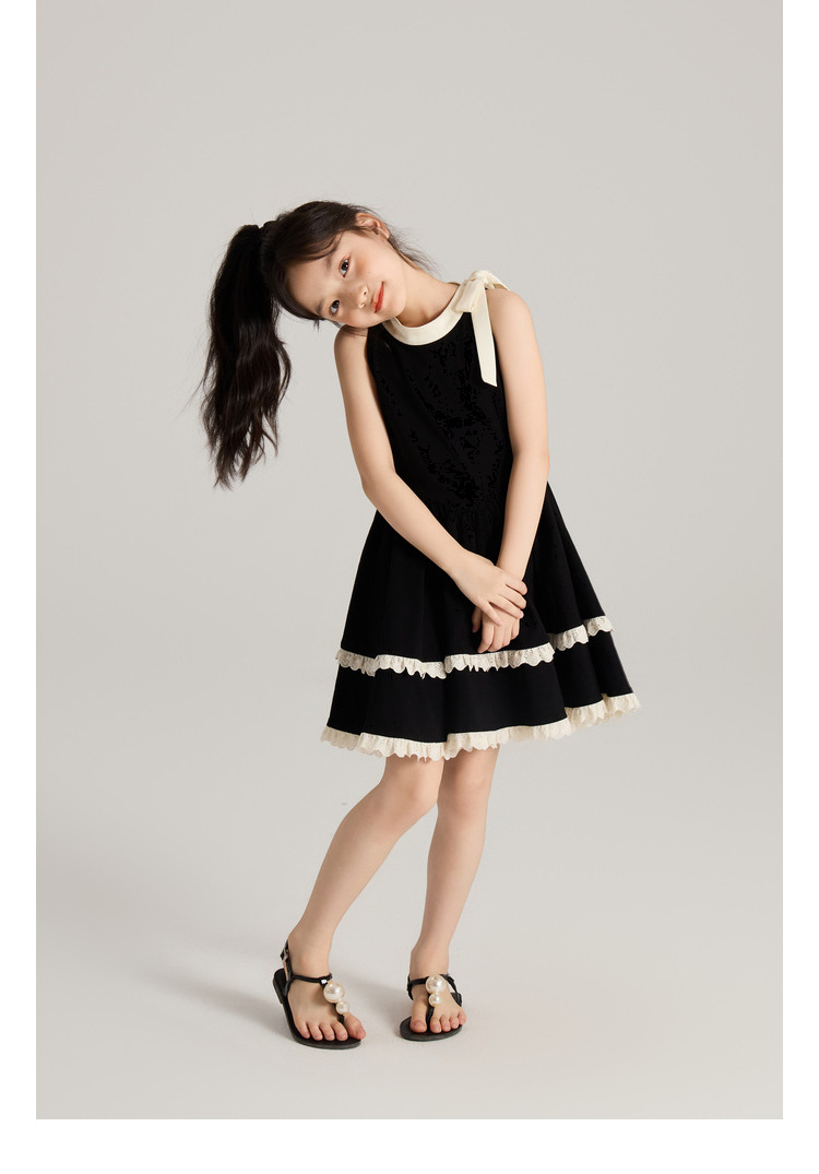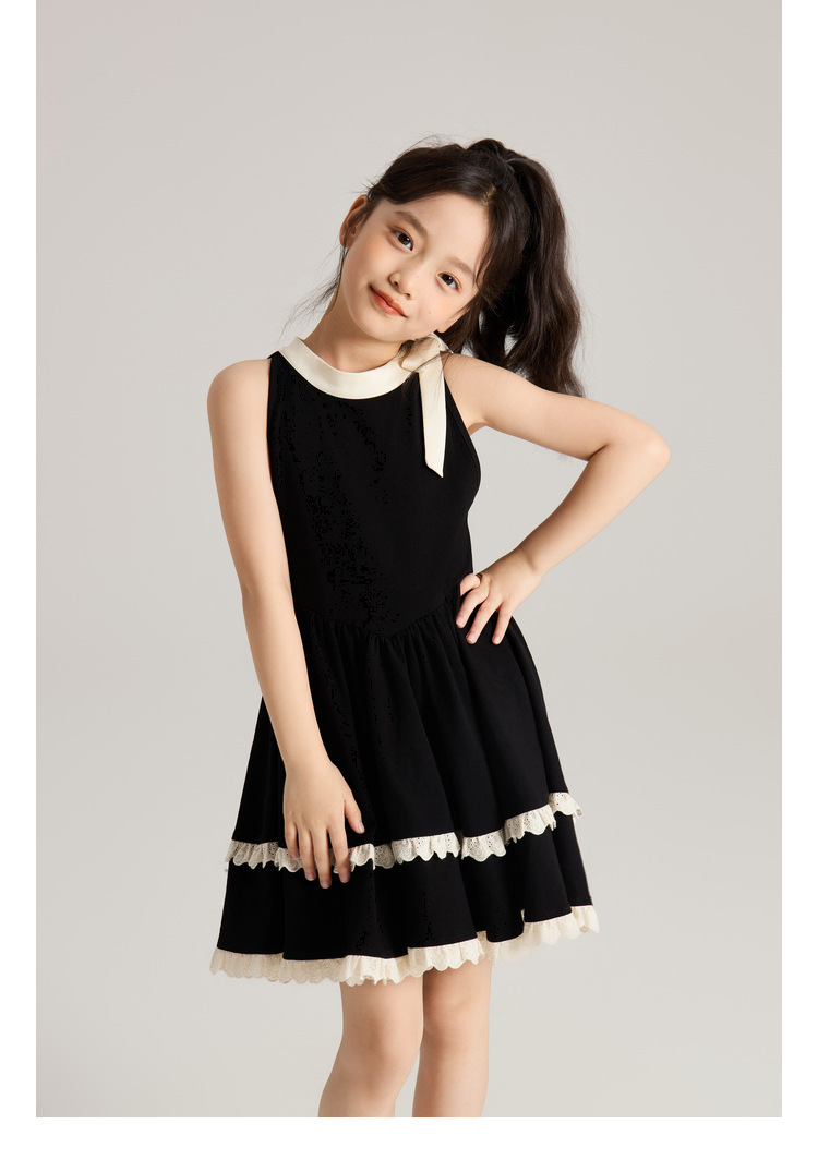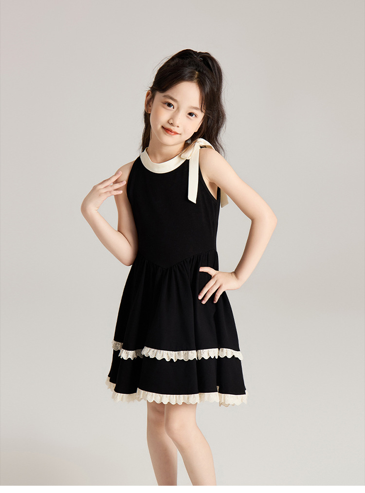 Amybaby Girls 원피스 2024 새로운 여름 레트로 코트 스타일 스티칭 레이스 프렌치 A-라인 원피스