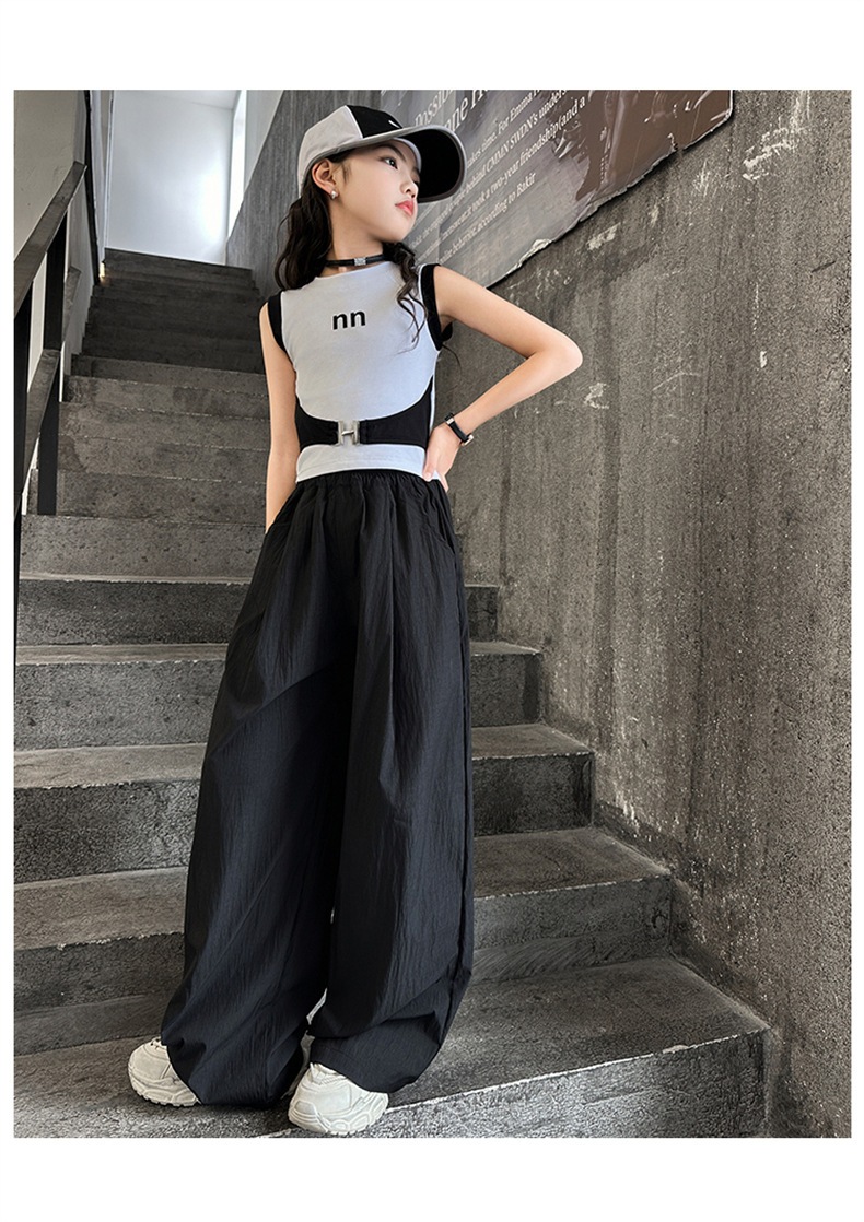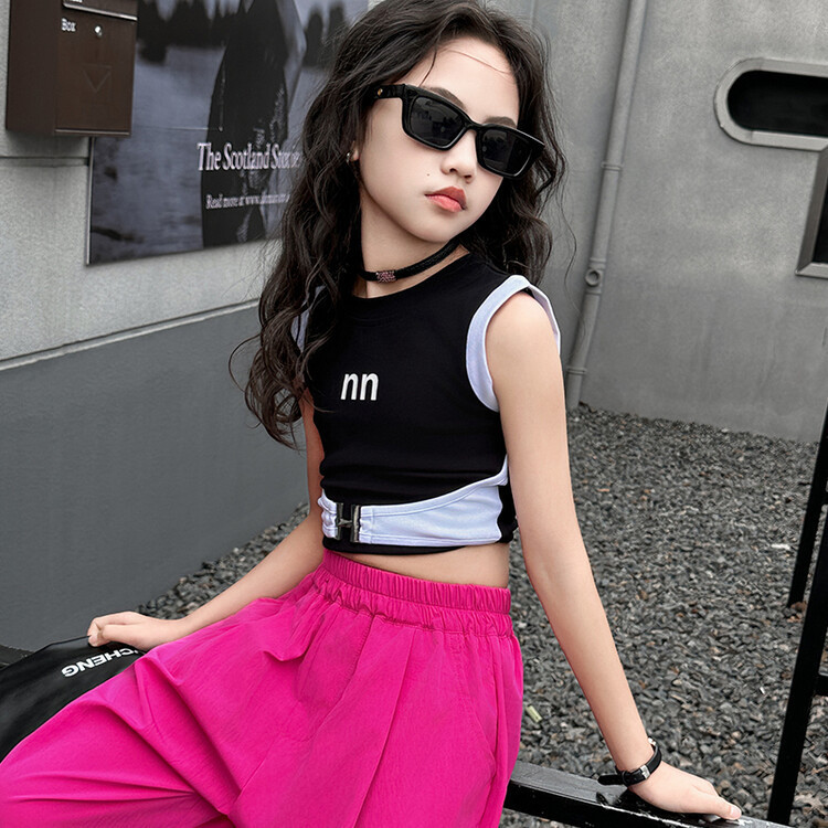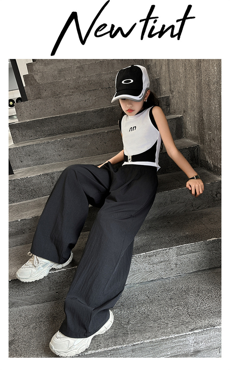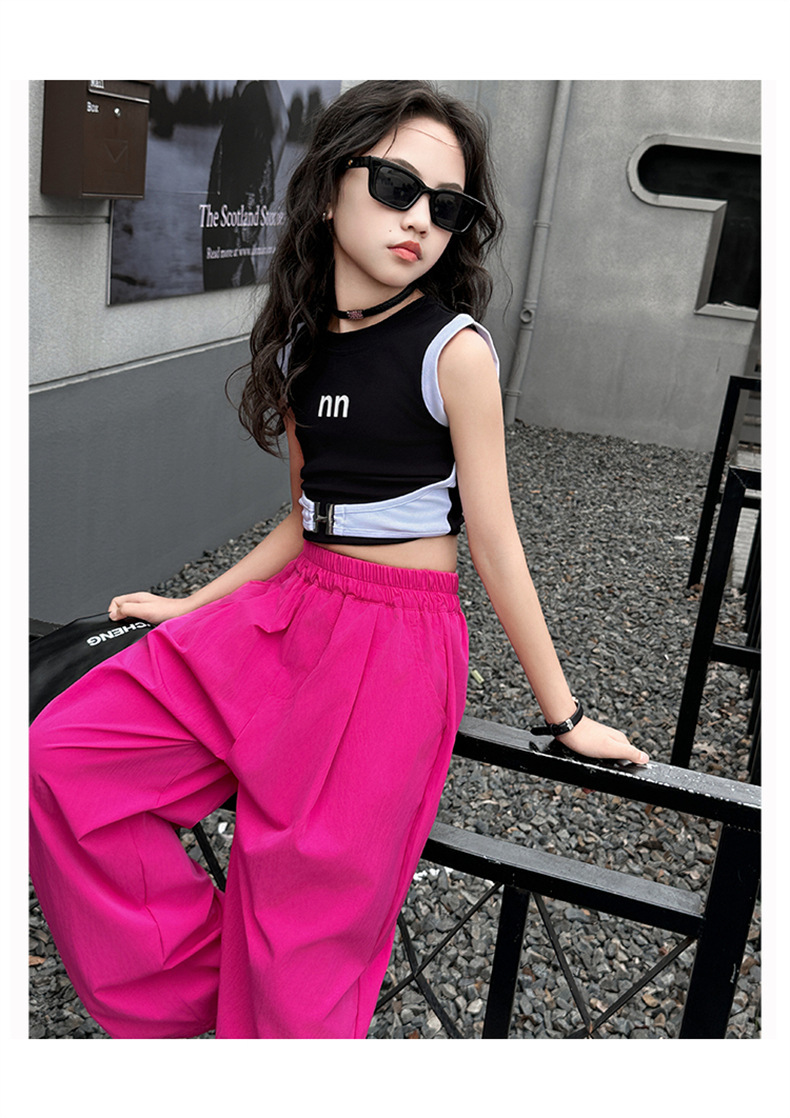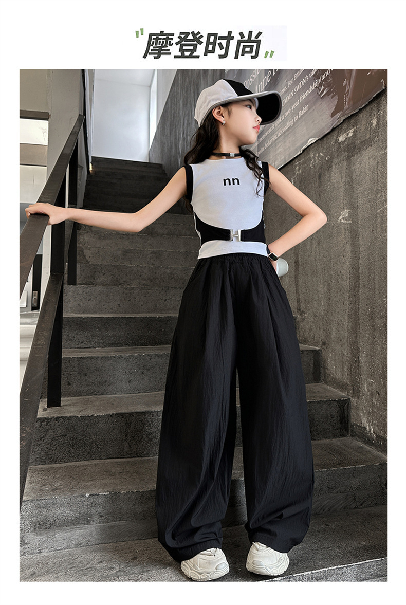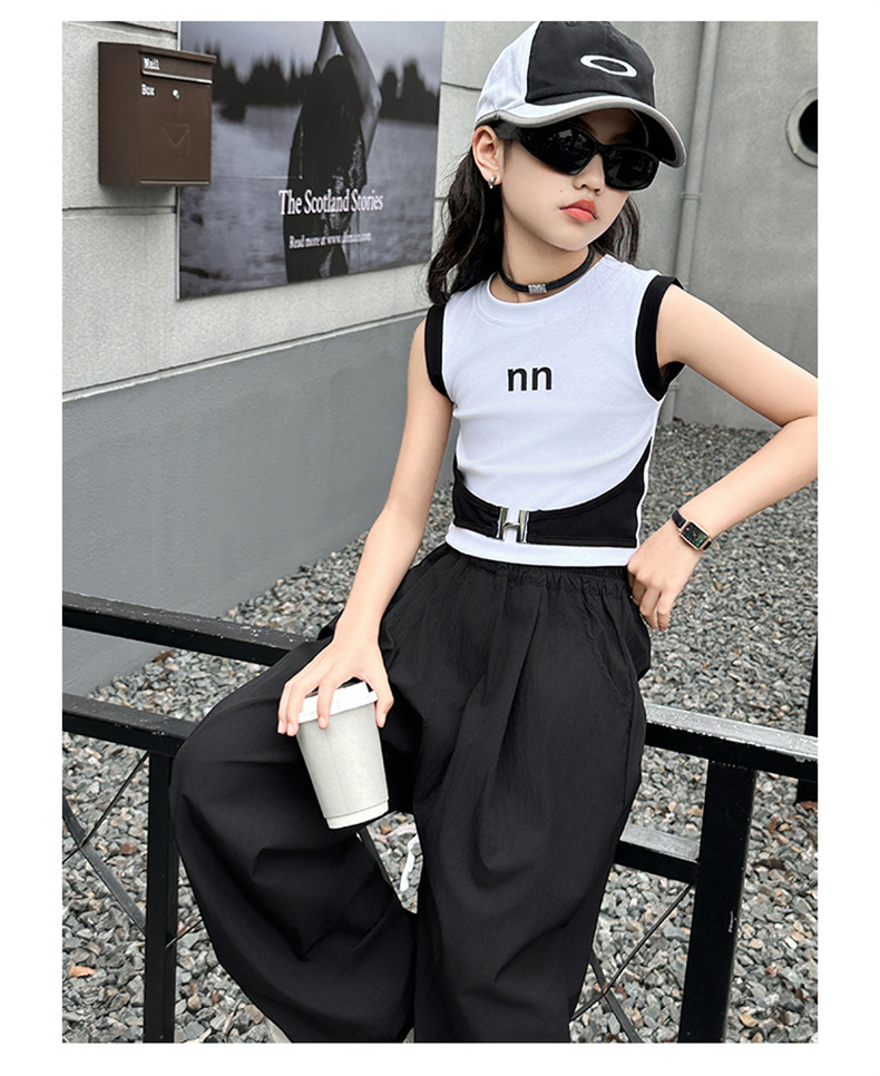 소녀 컬러 블록 조끼 세트 여름 2024 여름 새로운 스타일 중대형 어린이 편지 티셔츠 느슨한 넓은 다리 바지 야마모토 바지스토어 가기