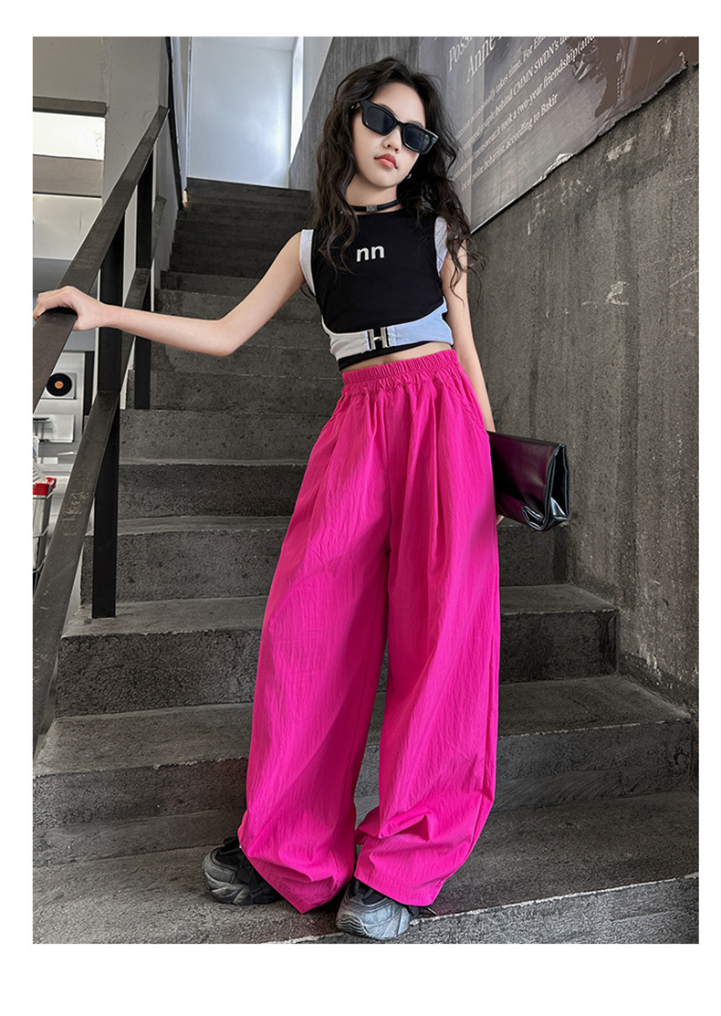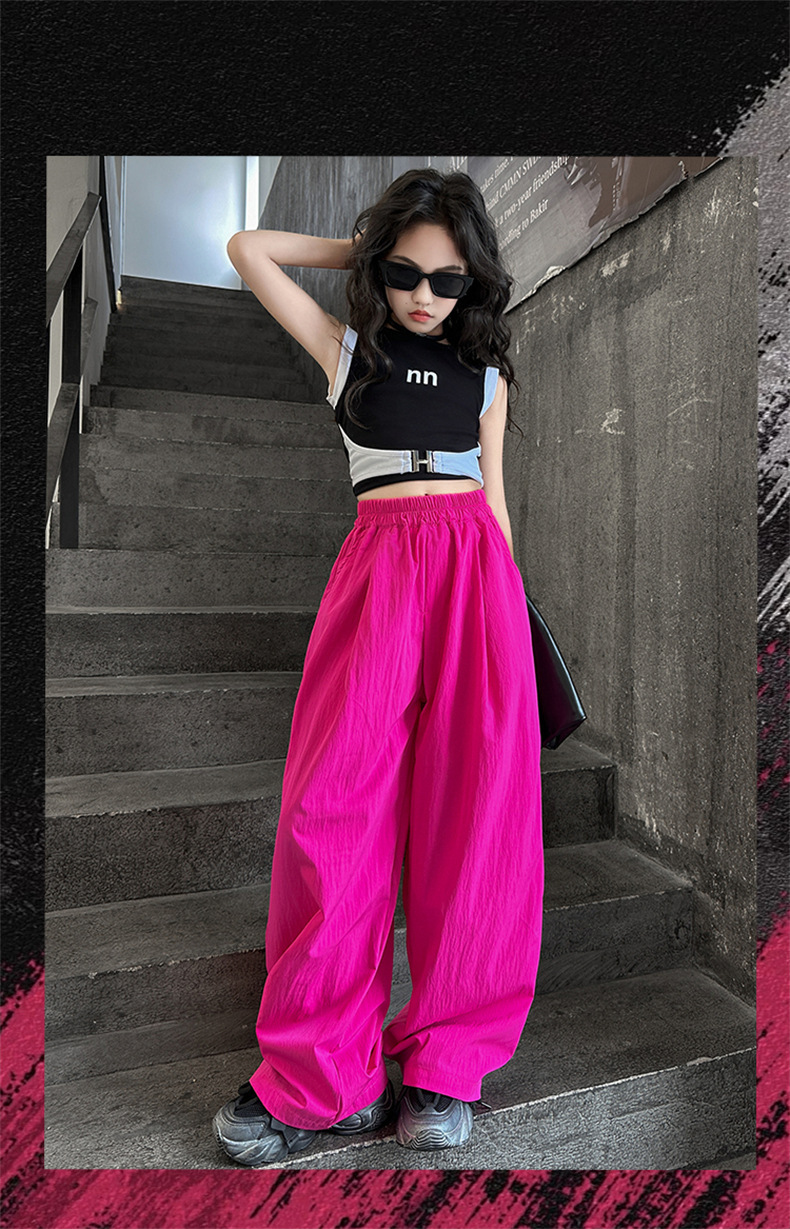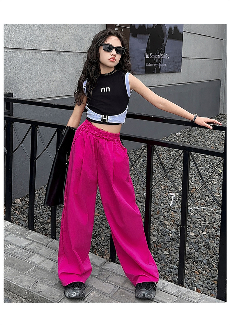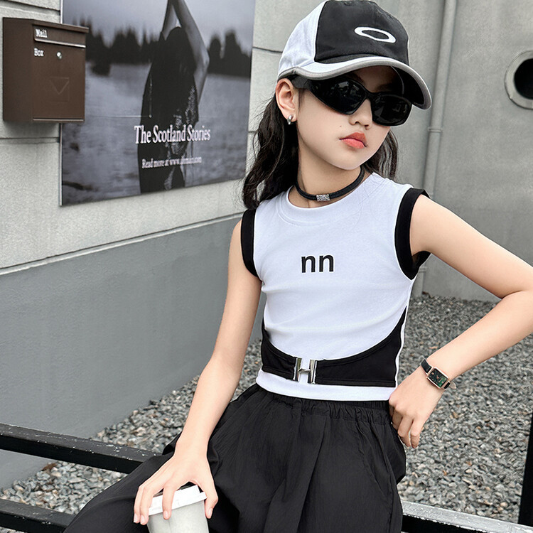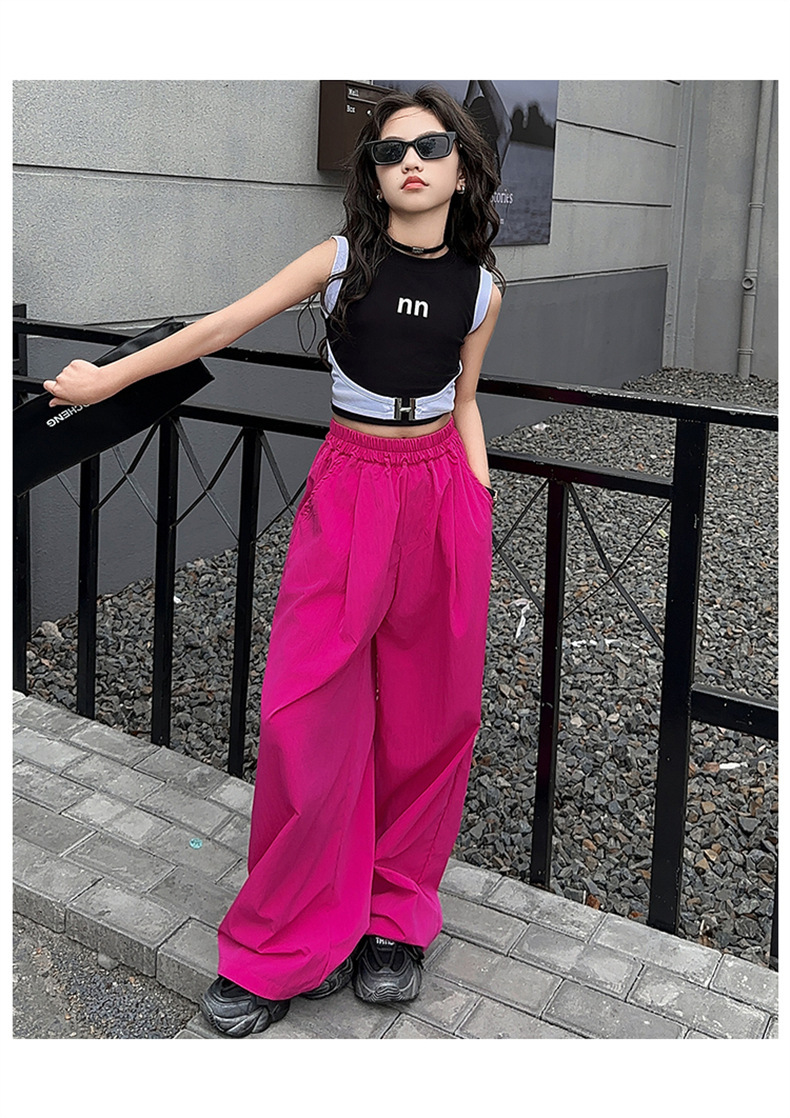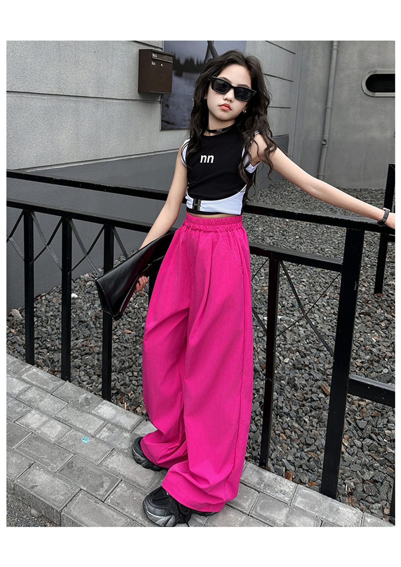 소녀 컬러 블록 조끼 세트 여름 2024 여름 새로운 스타일 중대형 어린이 편지 티셔츠 느슨한 넓은 다리 바지 야마모토 바지스토어 가기