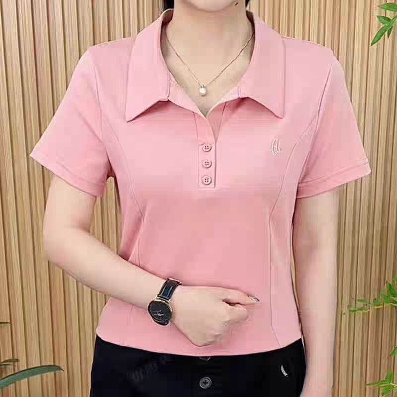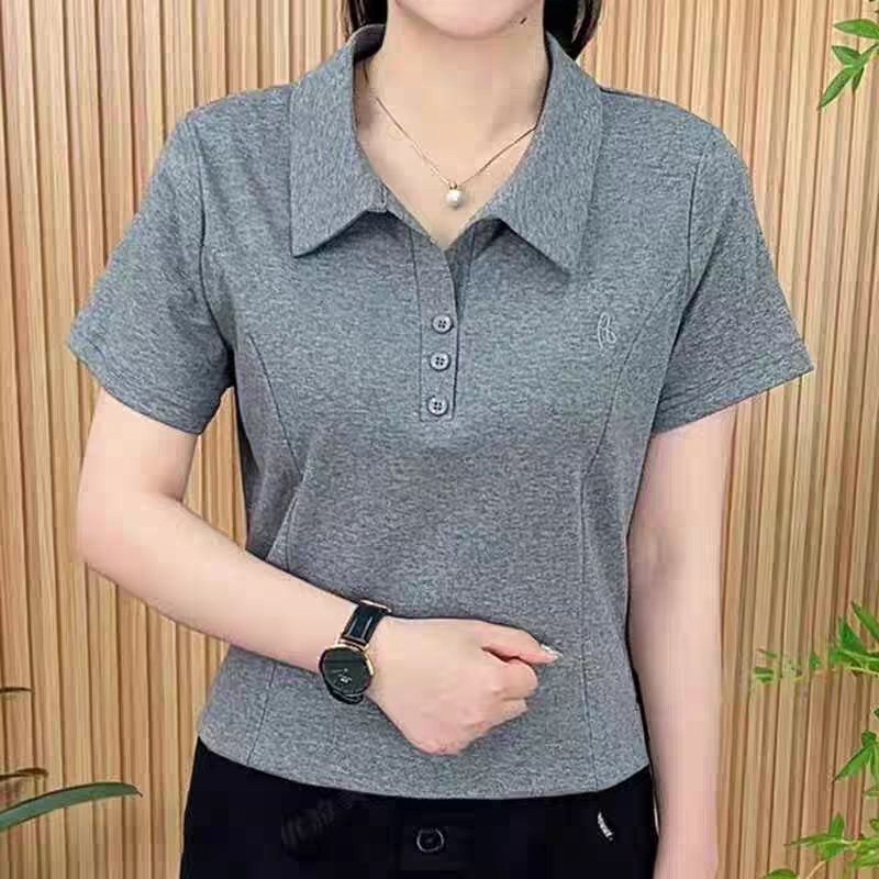 여름 새로운 디자인 간단한 대기 폴로 칼라 반팔 여성 하이 엔드 솔리드 컬러 올 매치 슬리밍 여성용 티셔츠 트렌디