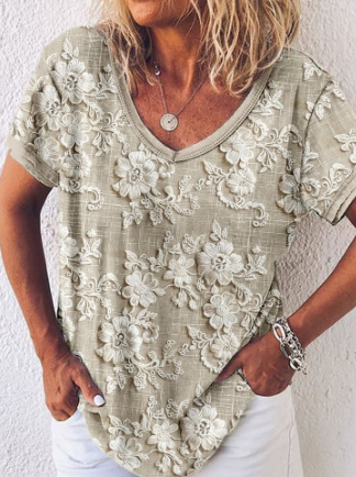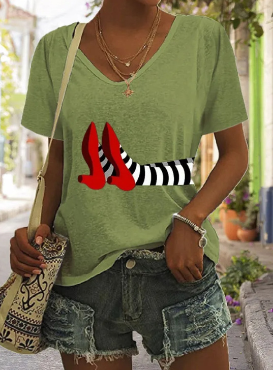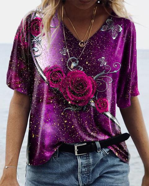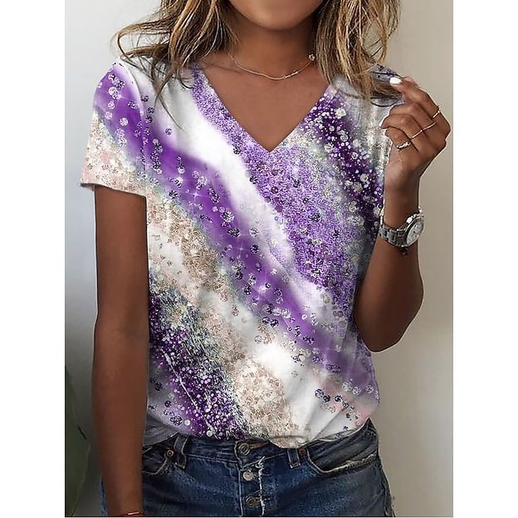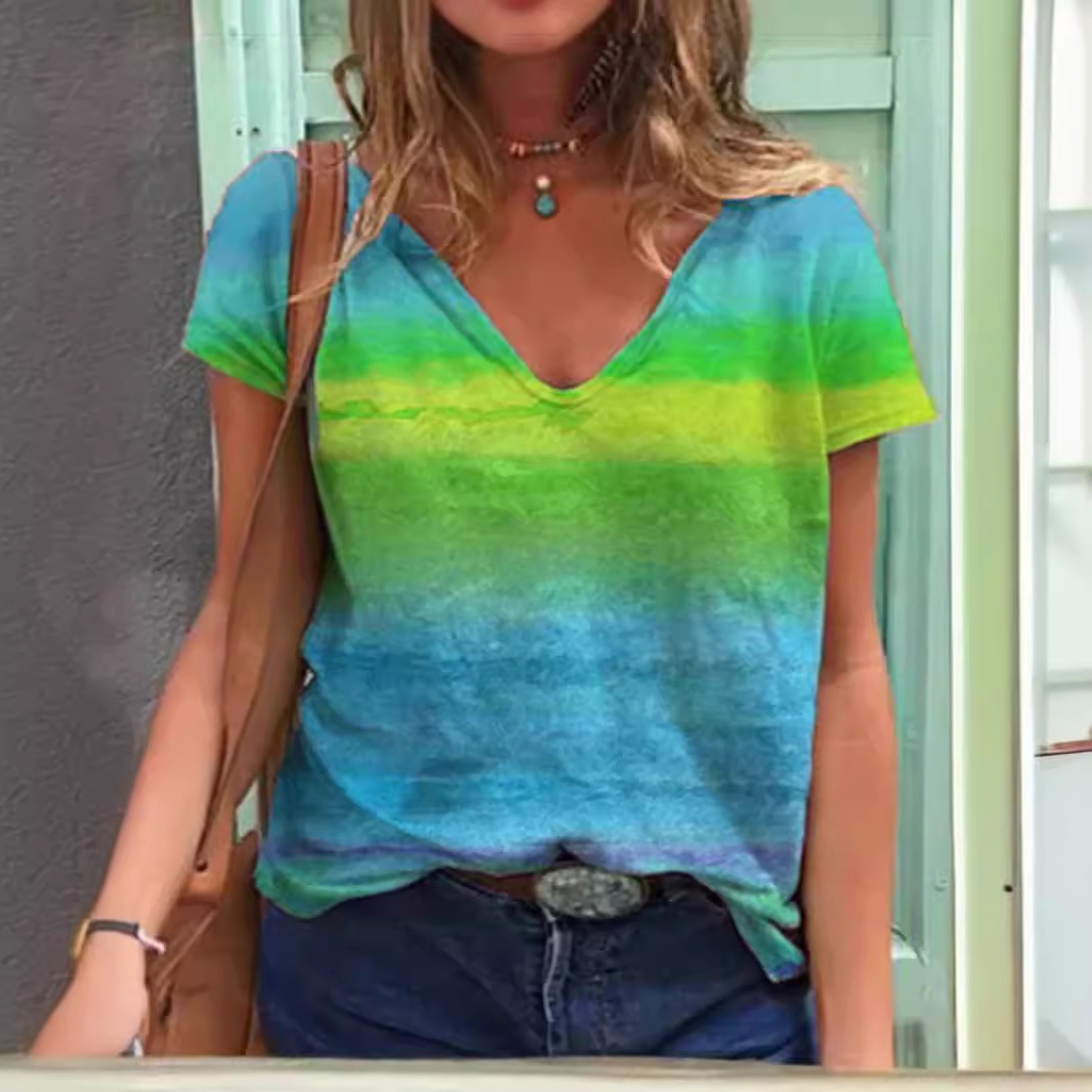 대외 무역 2024 국경 독립 역은 유럽과 미국의 여름 캐주얼 V 넥 레인보우 인쇄 반팔 여성용 티셔츠 탑스토어 가기