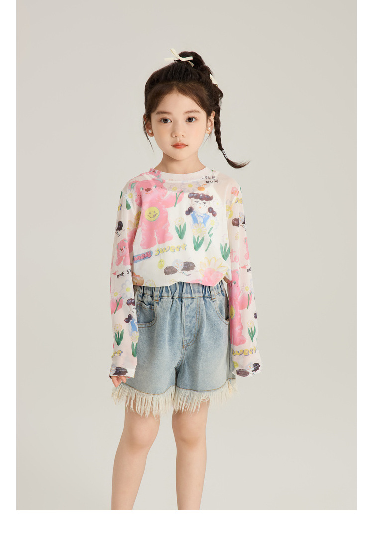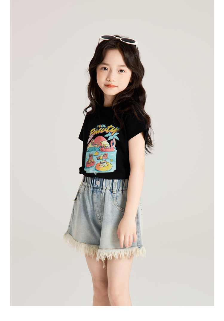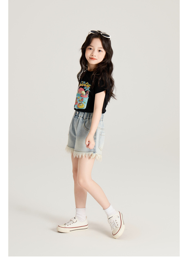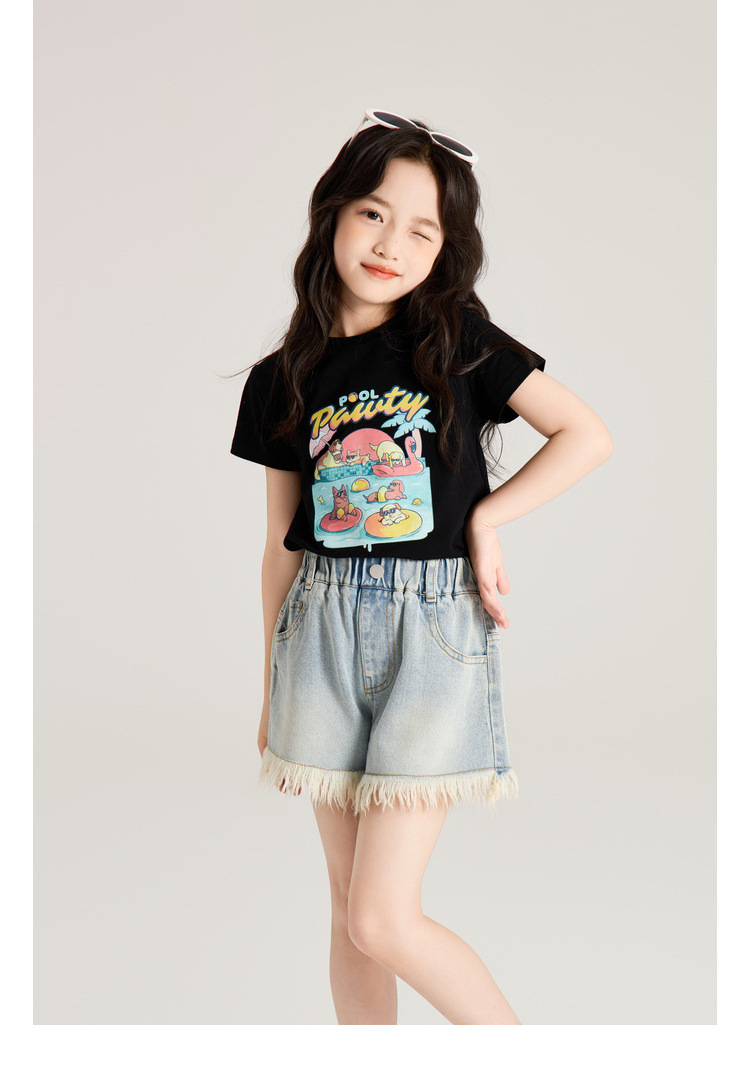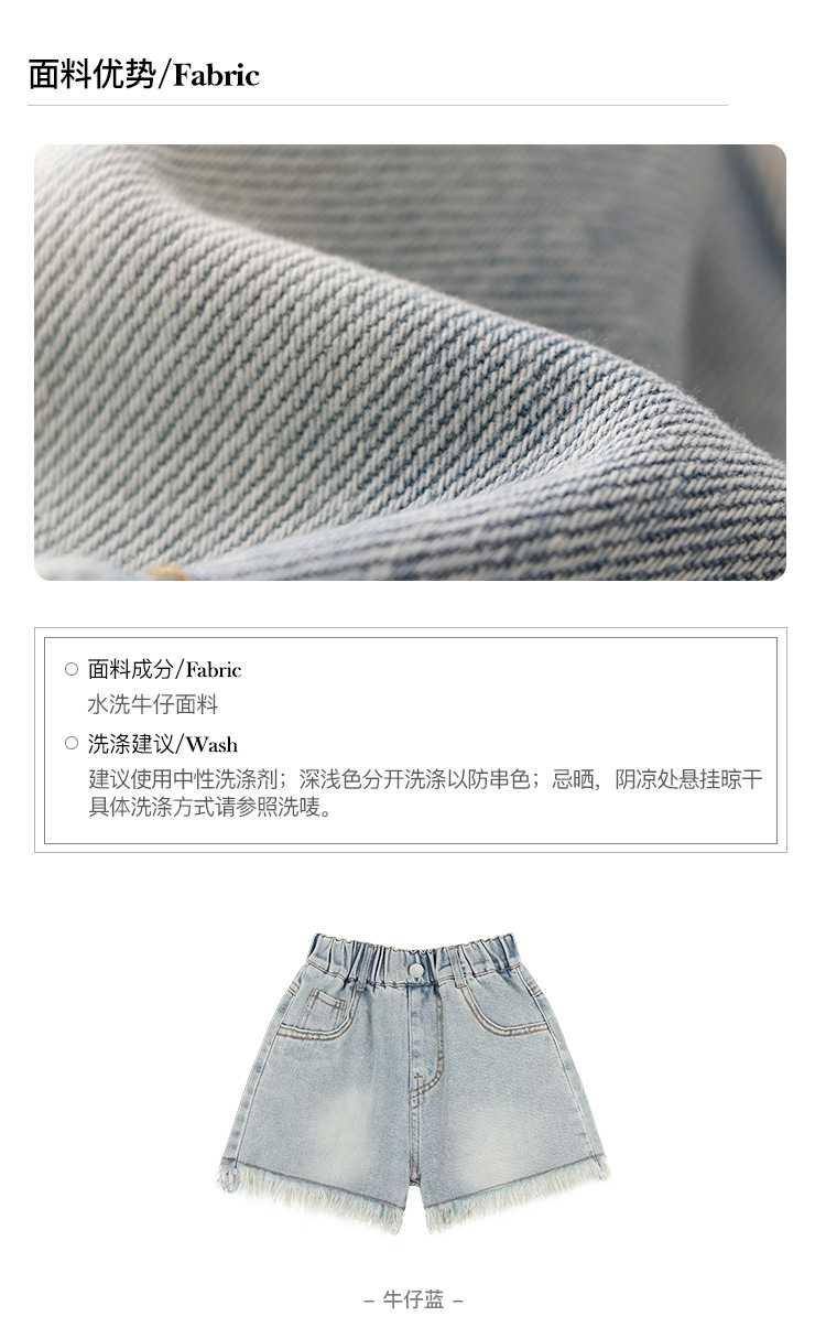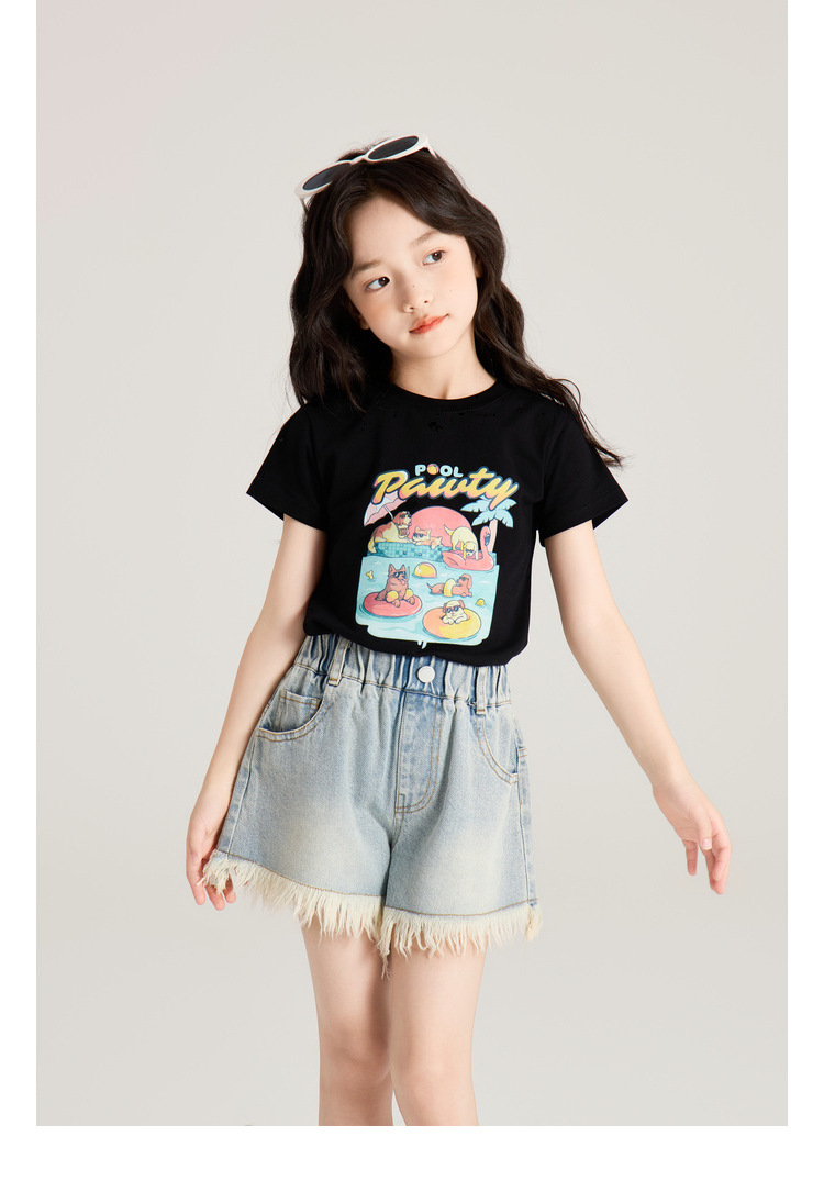 Amybaby Girl's Pants 2024 새로운 여름 한국 스타일 느슨한 올 매치 패션 술 데님 반바지