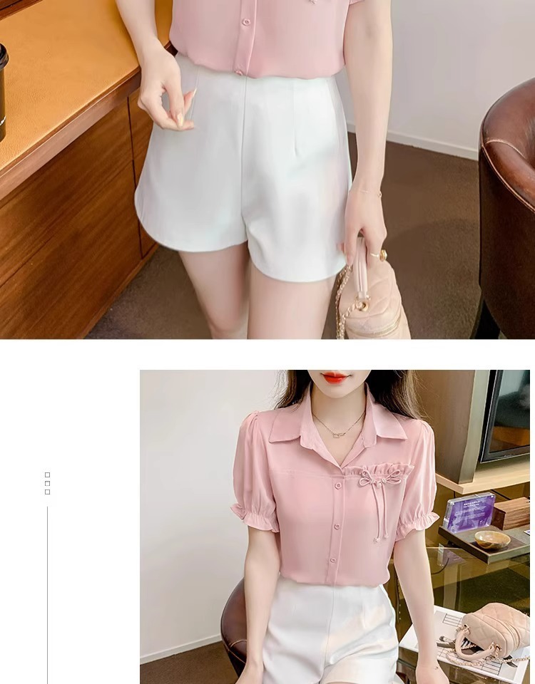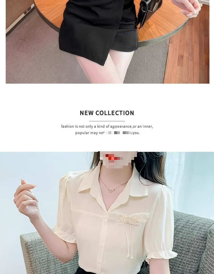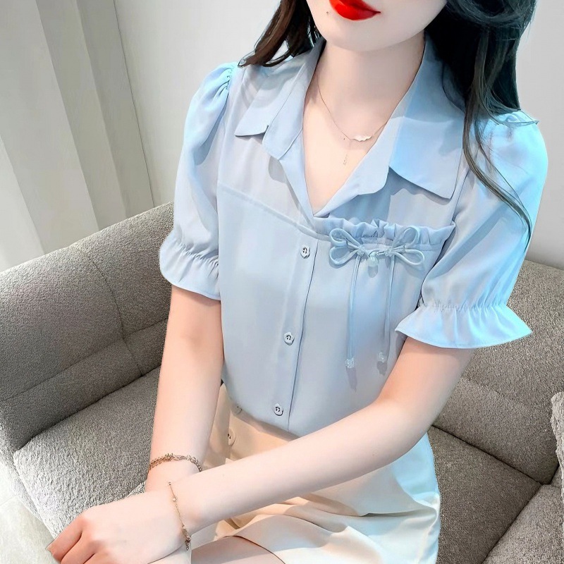 2024 년 새로운 여름 캐주얼 올 매치 쉬폰 셔츠 여성 슬림 룩 배를 덮고있는 나이 감소 웨스턴 스타일 틈새 디자인 탑스토어 가기