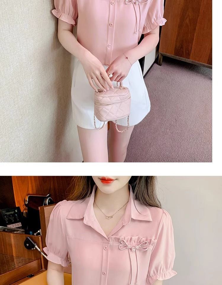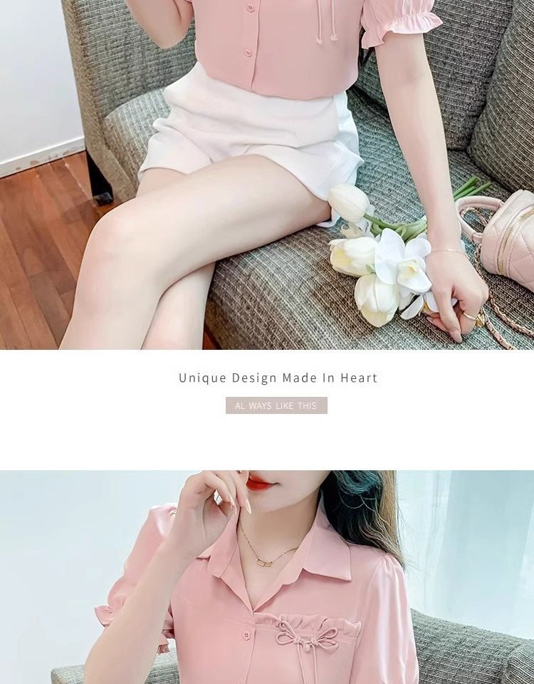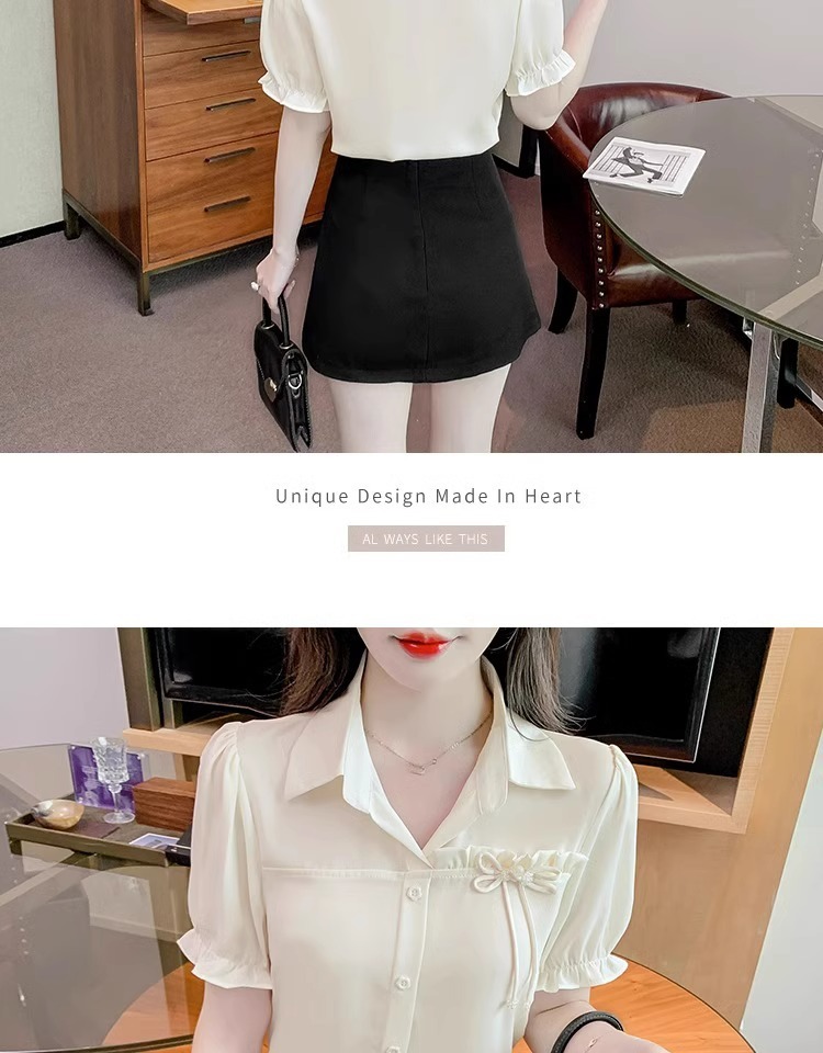2024 년 새로운 여름 캐주얼 올 매치 쉬폰 셔츠 여성 슬림 룩 배를 덮고있는 나이 감소 웨스턴 스타일 틈새 디자인 탑