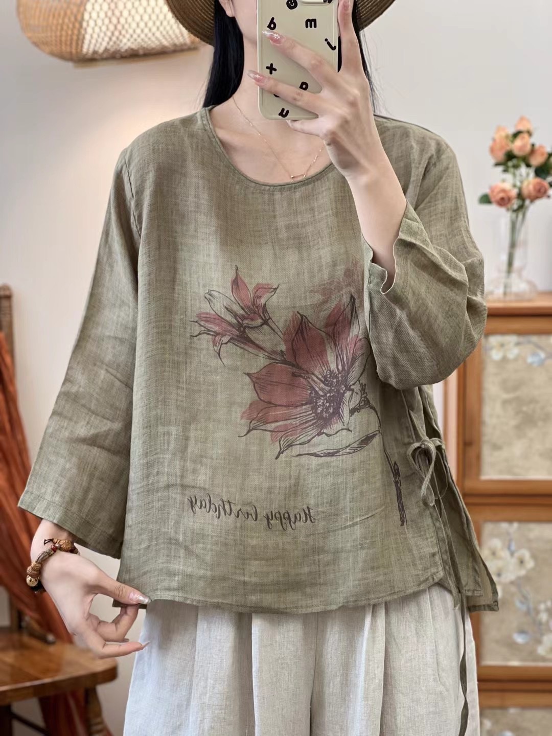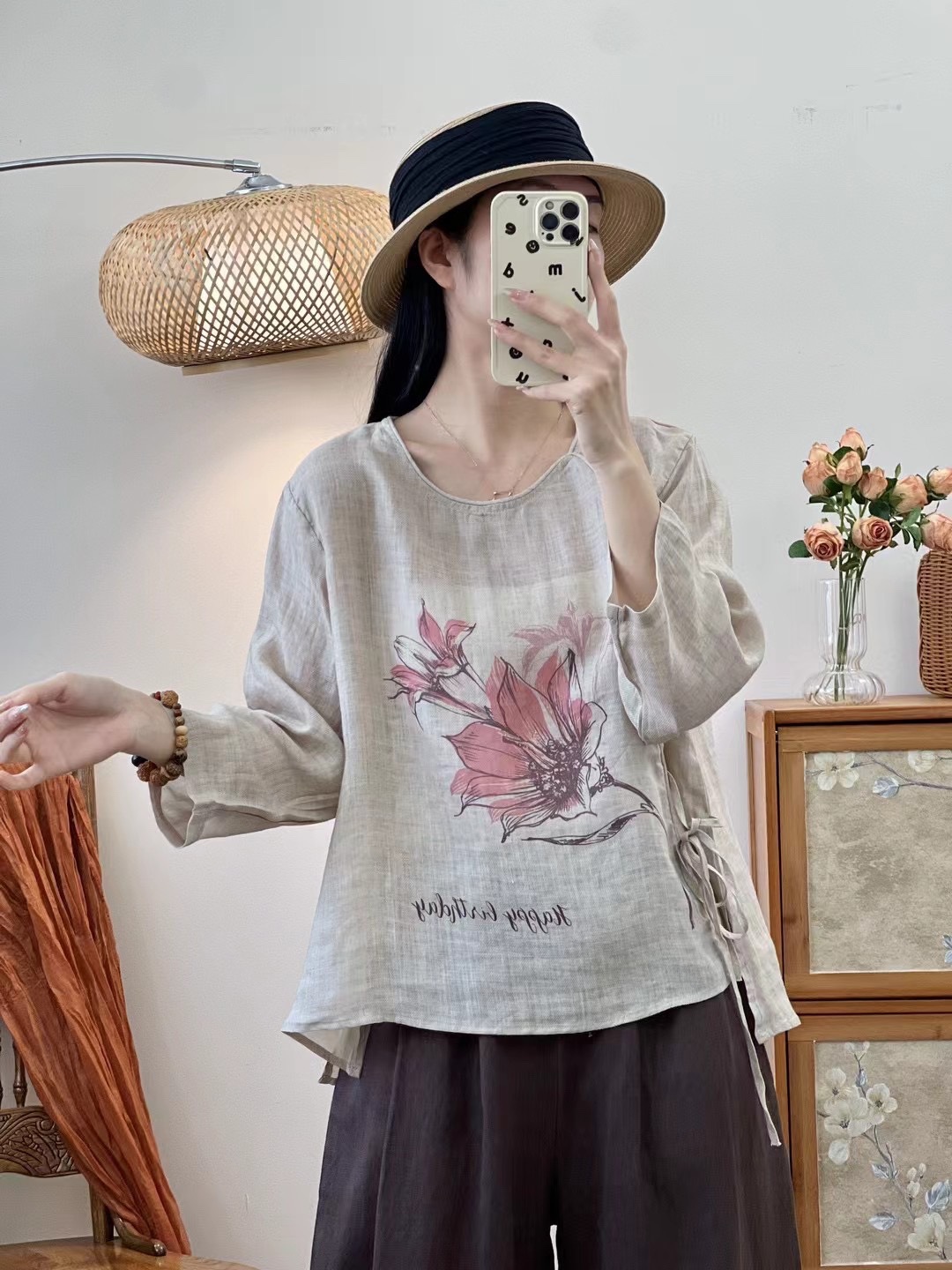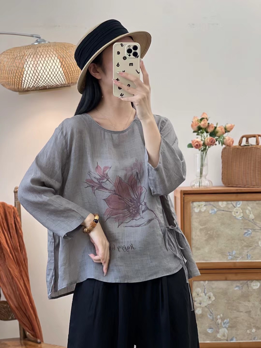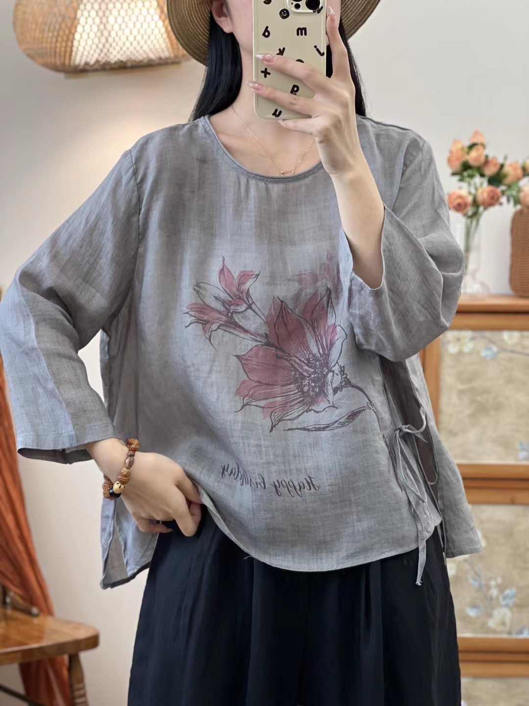 2024 봄과 여름 새로운 라운드 넥 풀오버 프린트 셔츠 여성용 예술적 티셔츠 캐주얼 탑 루즈 버전