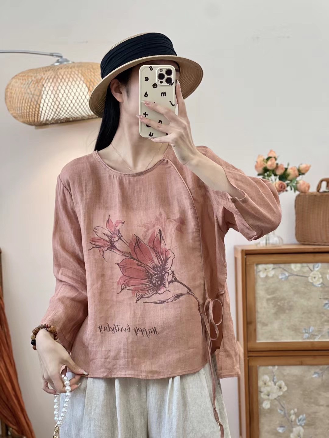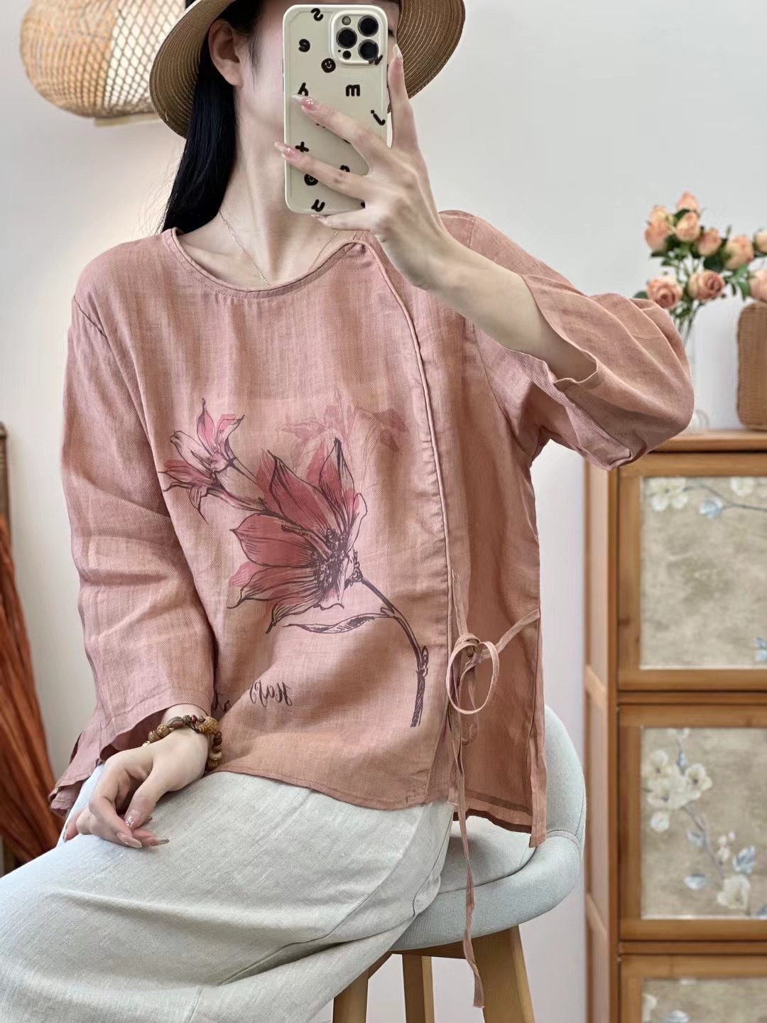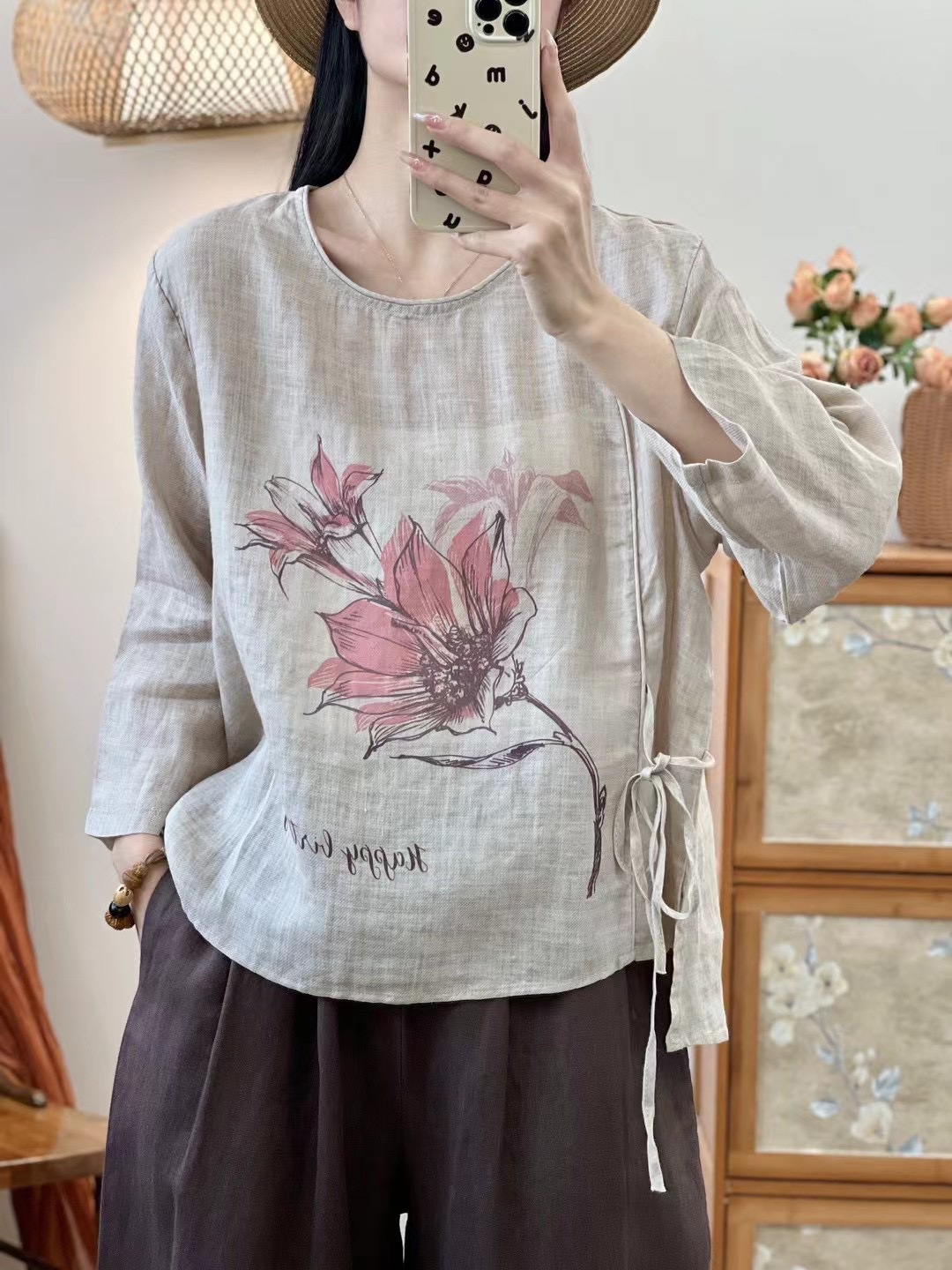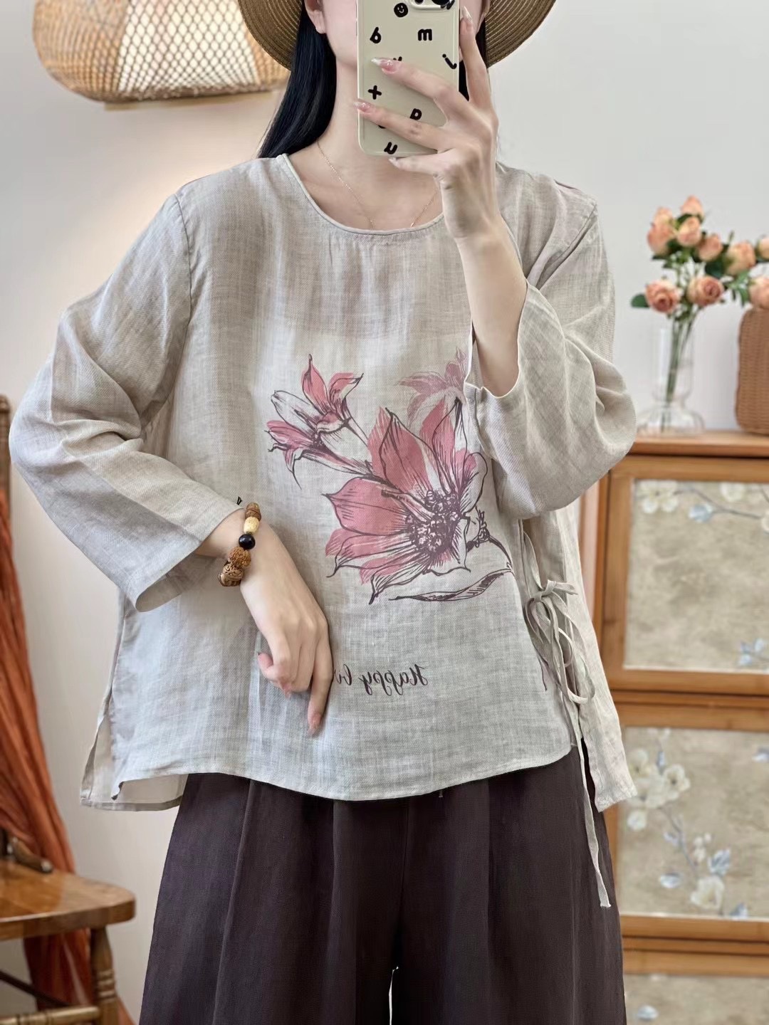 2024 봄과 여름 새로운 라운드 넥 풀오버 프린트 셔츠 여성용 예술적 티셔츠 캐주얼 탑 루즈 버전