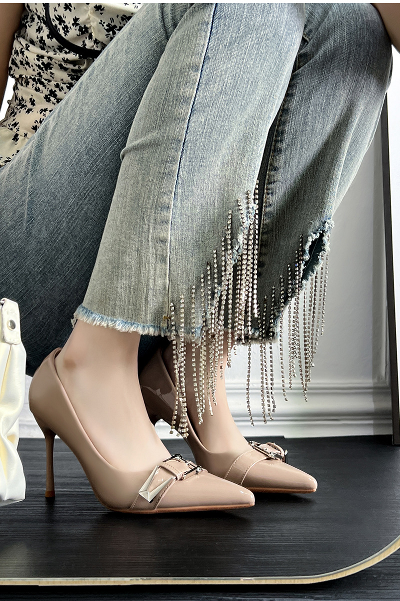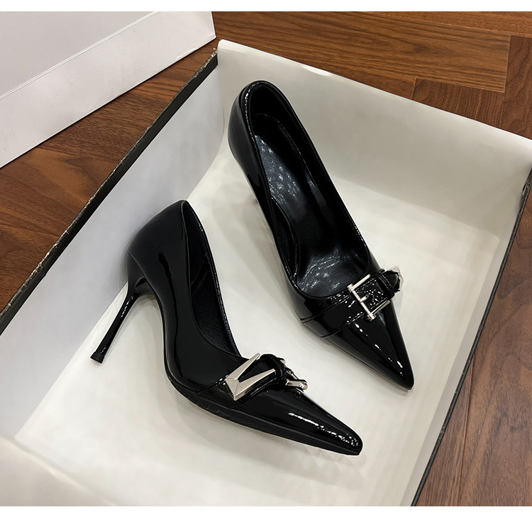 블랙 스틸레토 힐 신발 2024 봄 새로운 도착 금속 버클 포인팅 특허 가죽 섹시한 싱글 신발 여성 패션 올매치스토어 가기