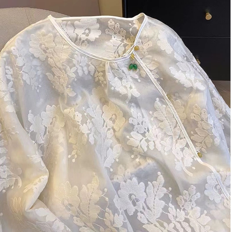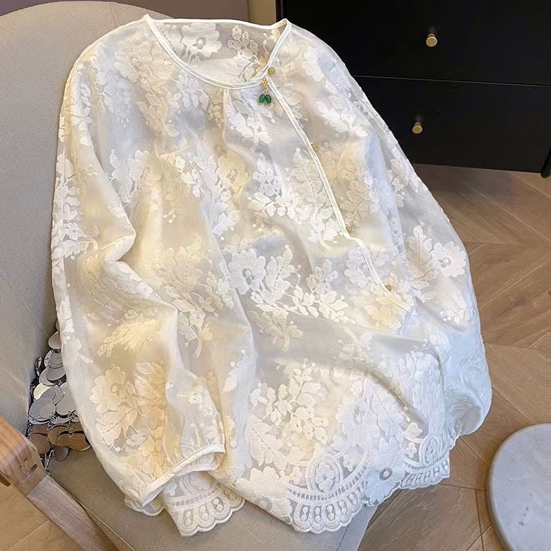 여성을위한 새로운 중국 스타일 국가 스타일 고급 연령 감소 셔츠 탑 2024 봄 새로운 레트로 Tangle 버클 자카드 시폰 셔츠스토어 가기
