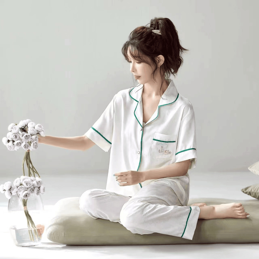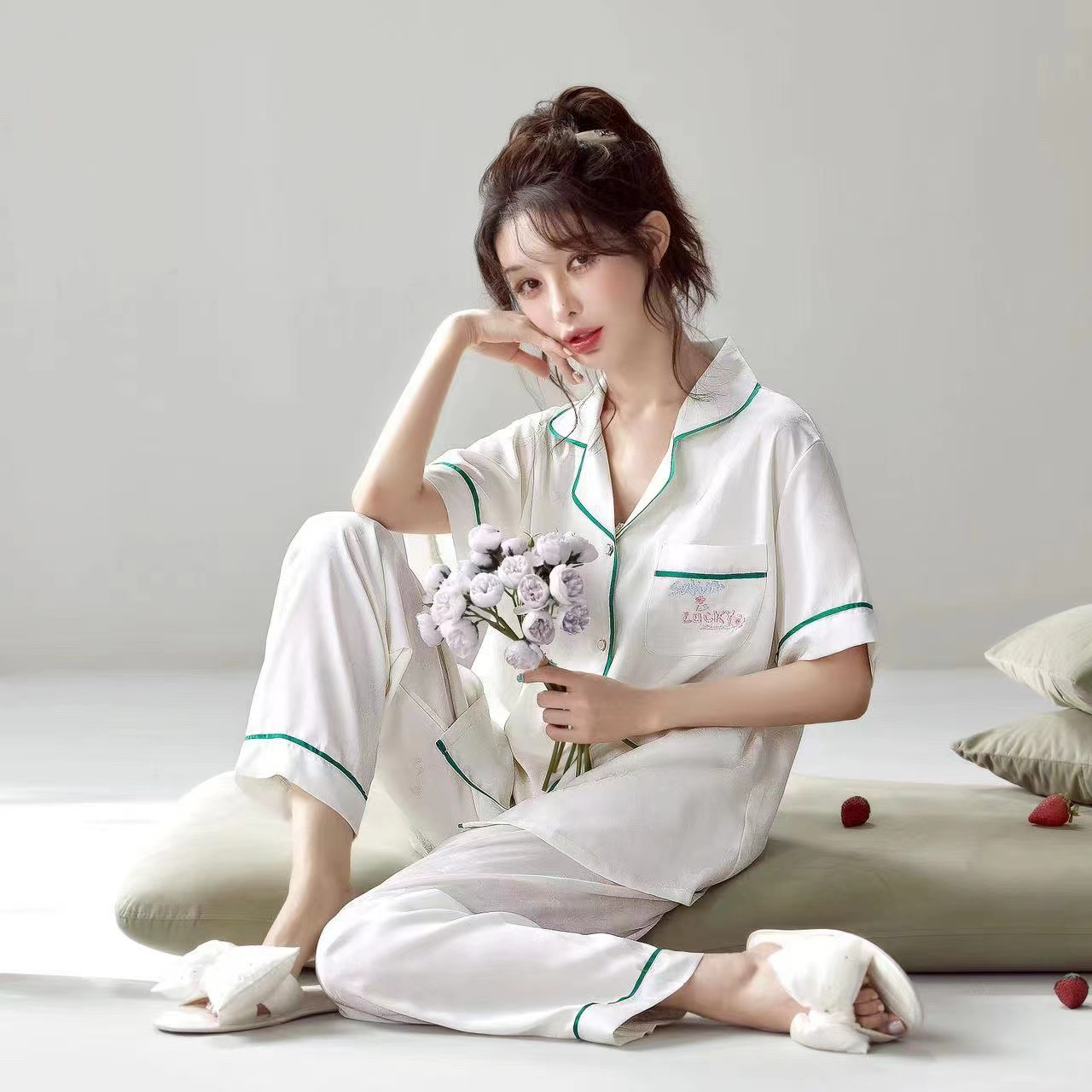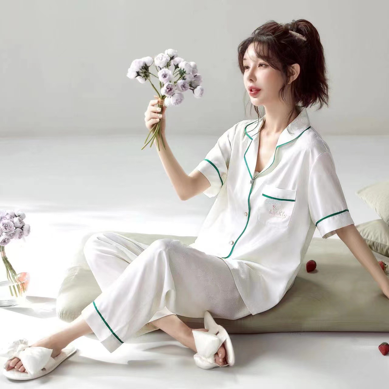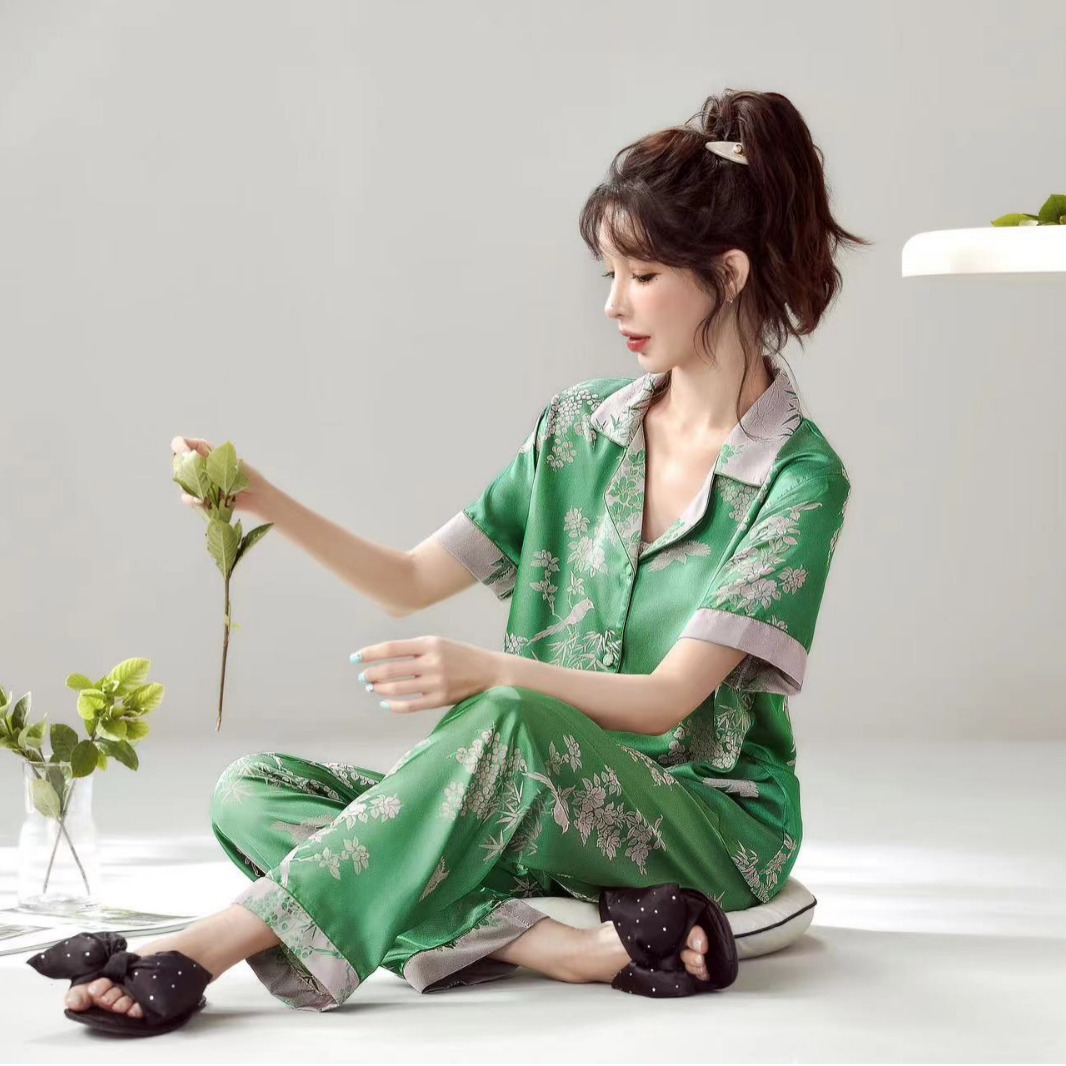 2024 새로운 집 옷 새틴 작은 시원한 짧은 소매 세트 아이스 실크 멋진 새로운 중국 잠옷 여성의 여름 느슨한스토어 가기