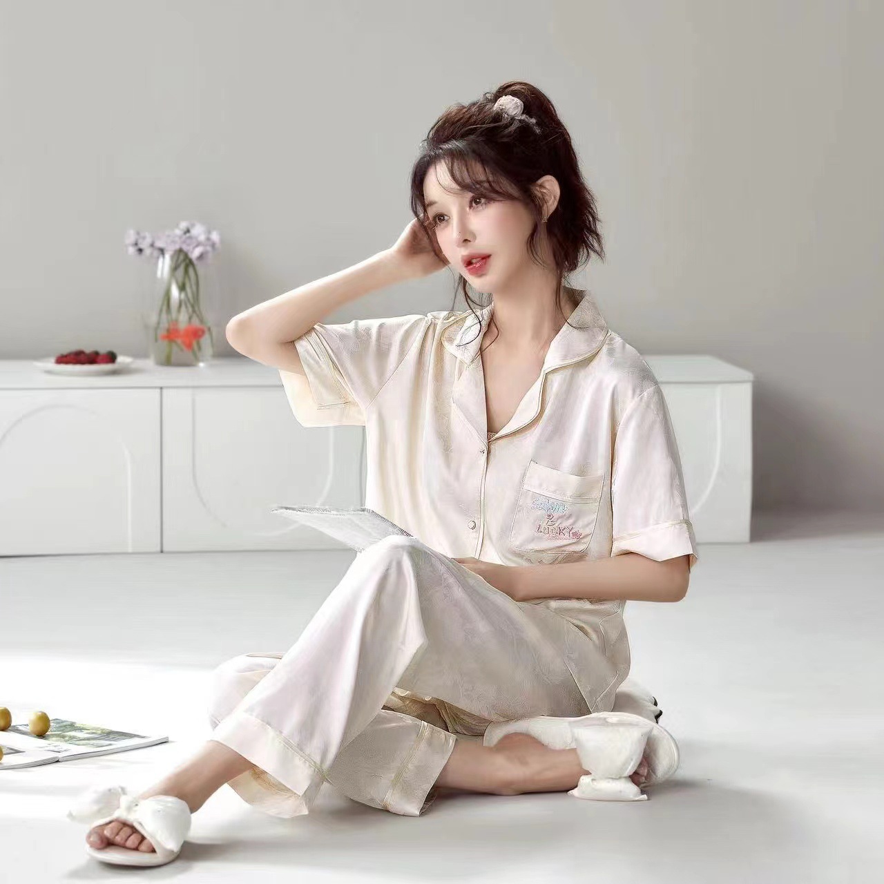 2024 새로운 집 옷 새틴 작은 시원한 짧은 소매 세트 아이스 실크 멋진 새로운 중국 잠옷 여성의 여름 느슨한