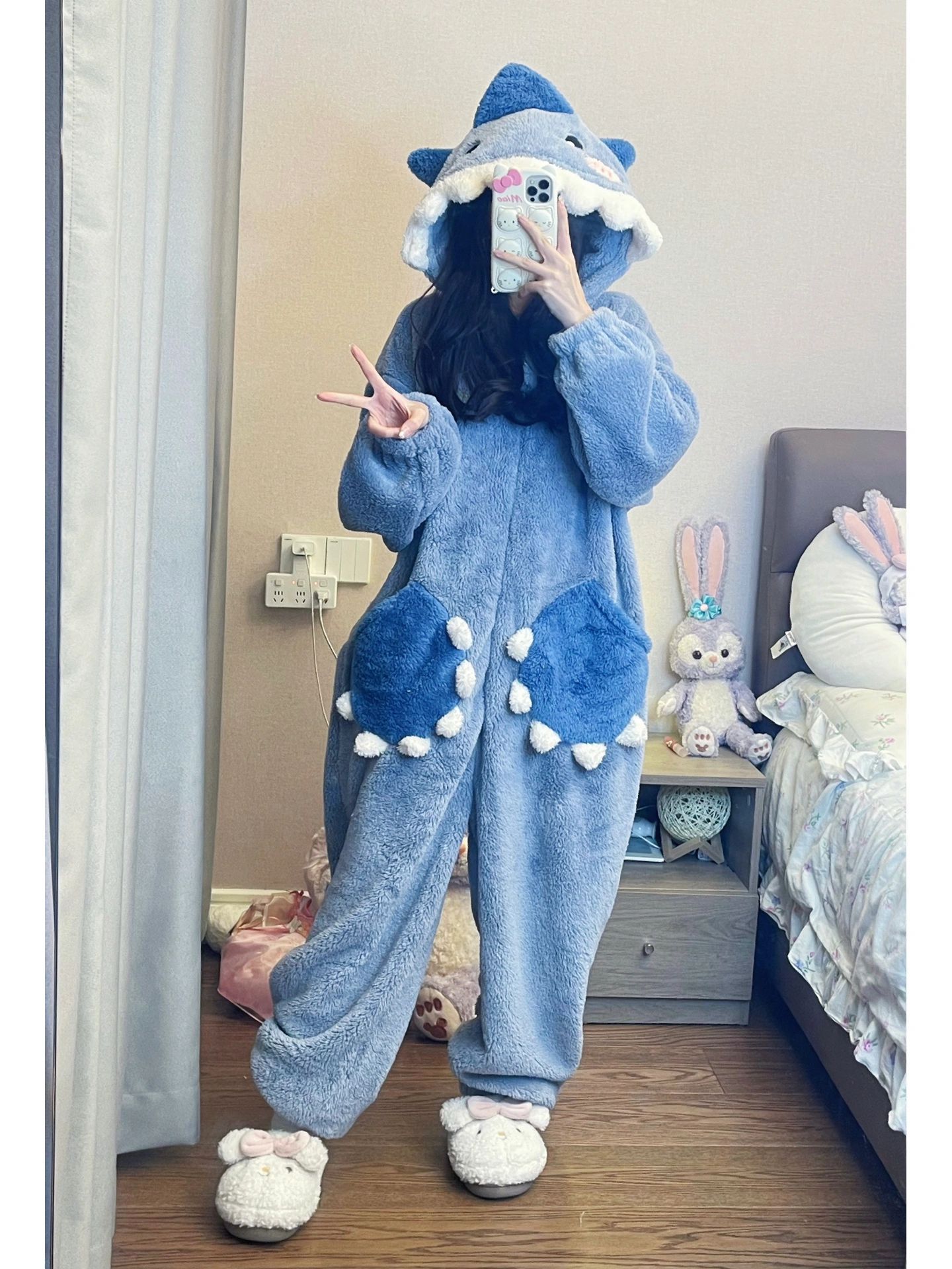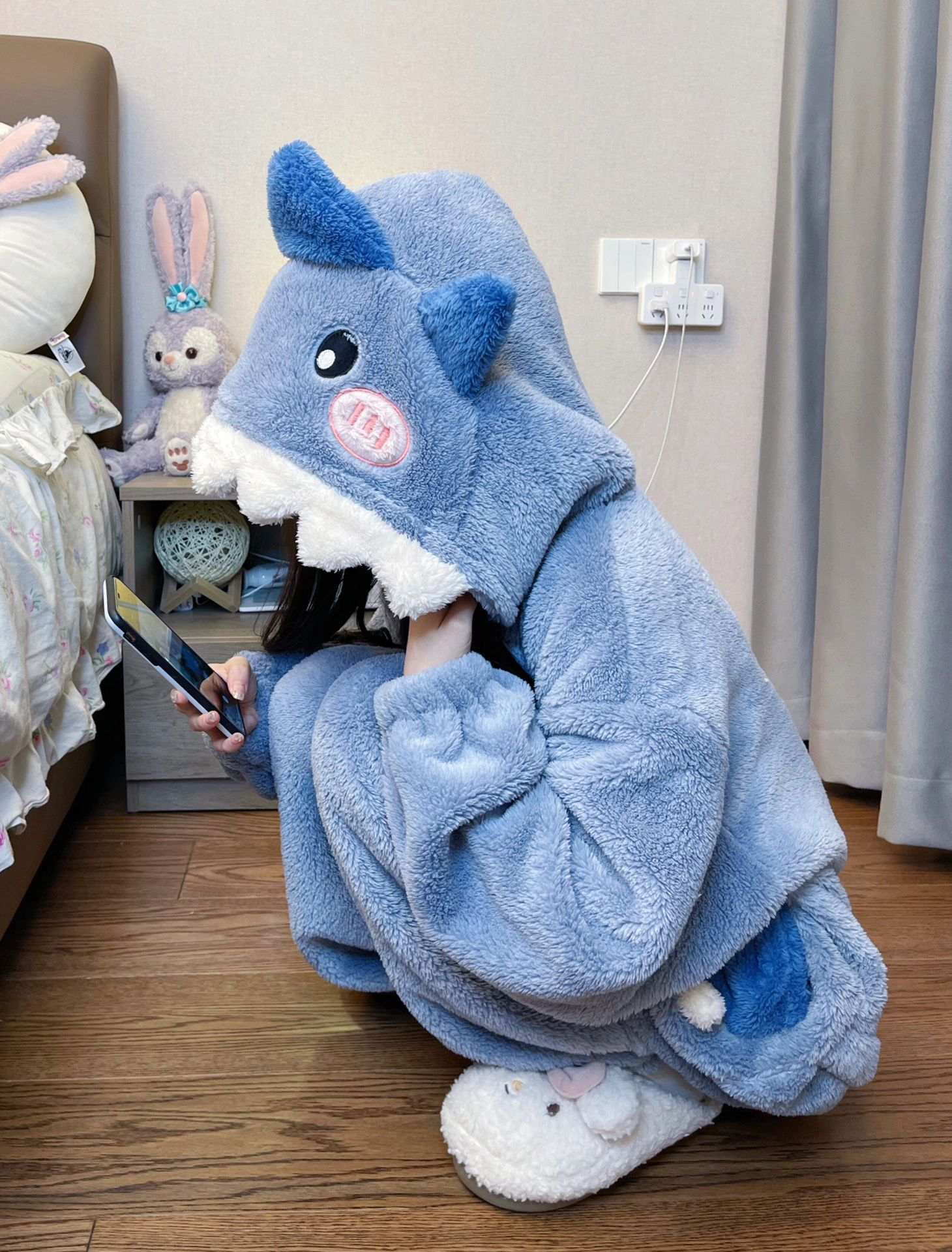 여성을위한 달콤하고 귀여운 상어 후드 산호 벨벳 잠옷 가을, 겨울 스타일 플러스 벨벳 두꺼운 따뜻한 원피스는 외부에서 착용 가능