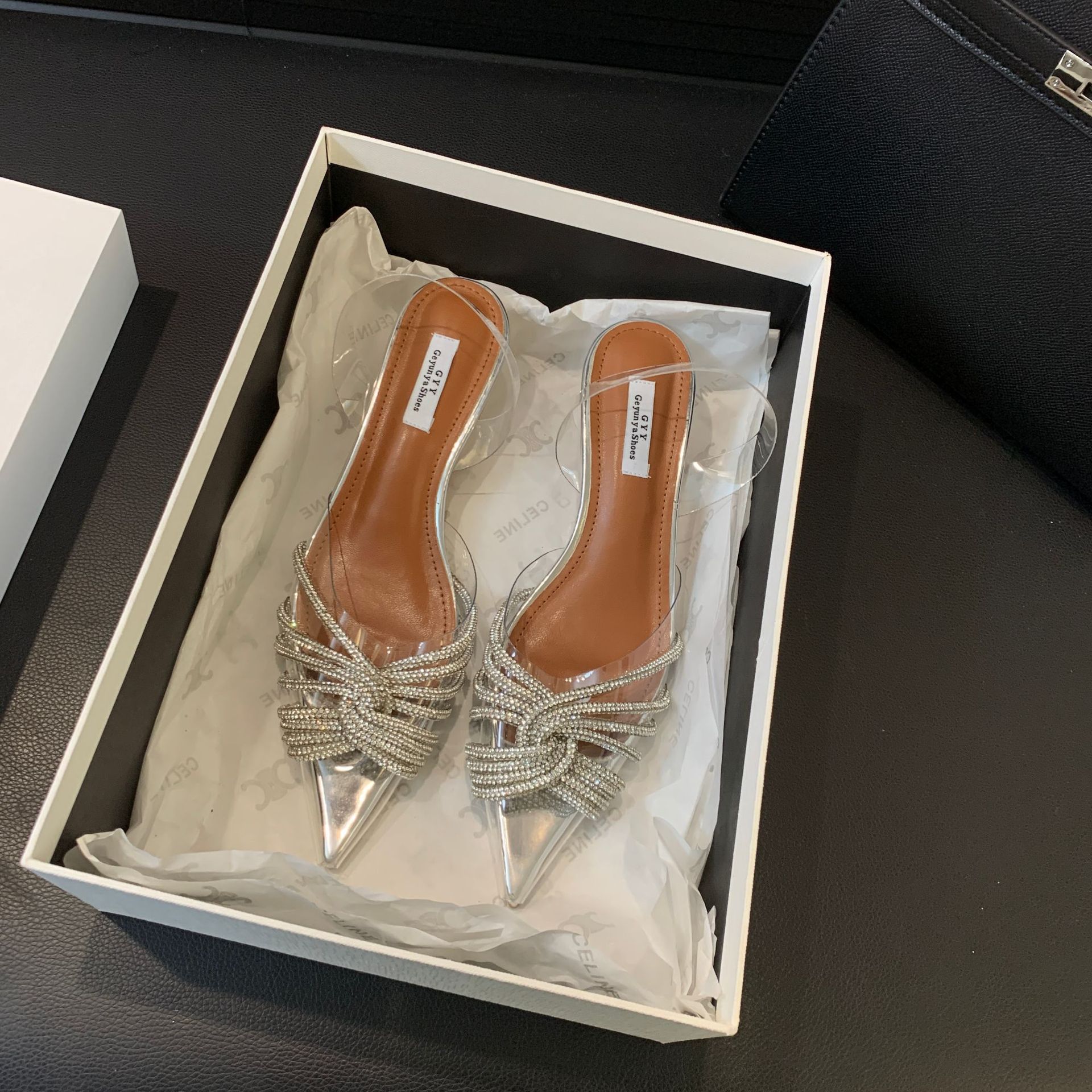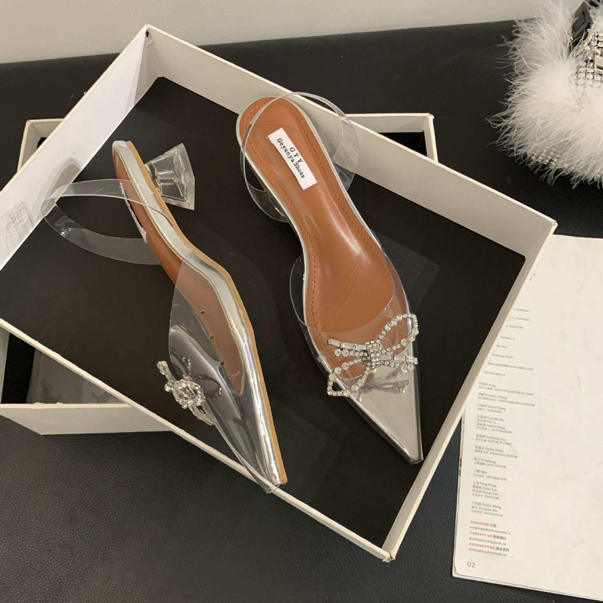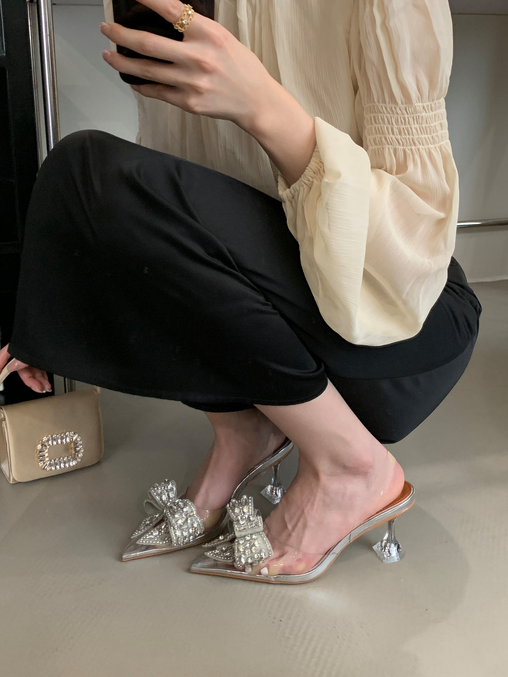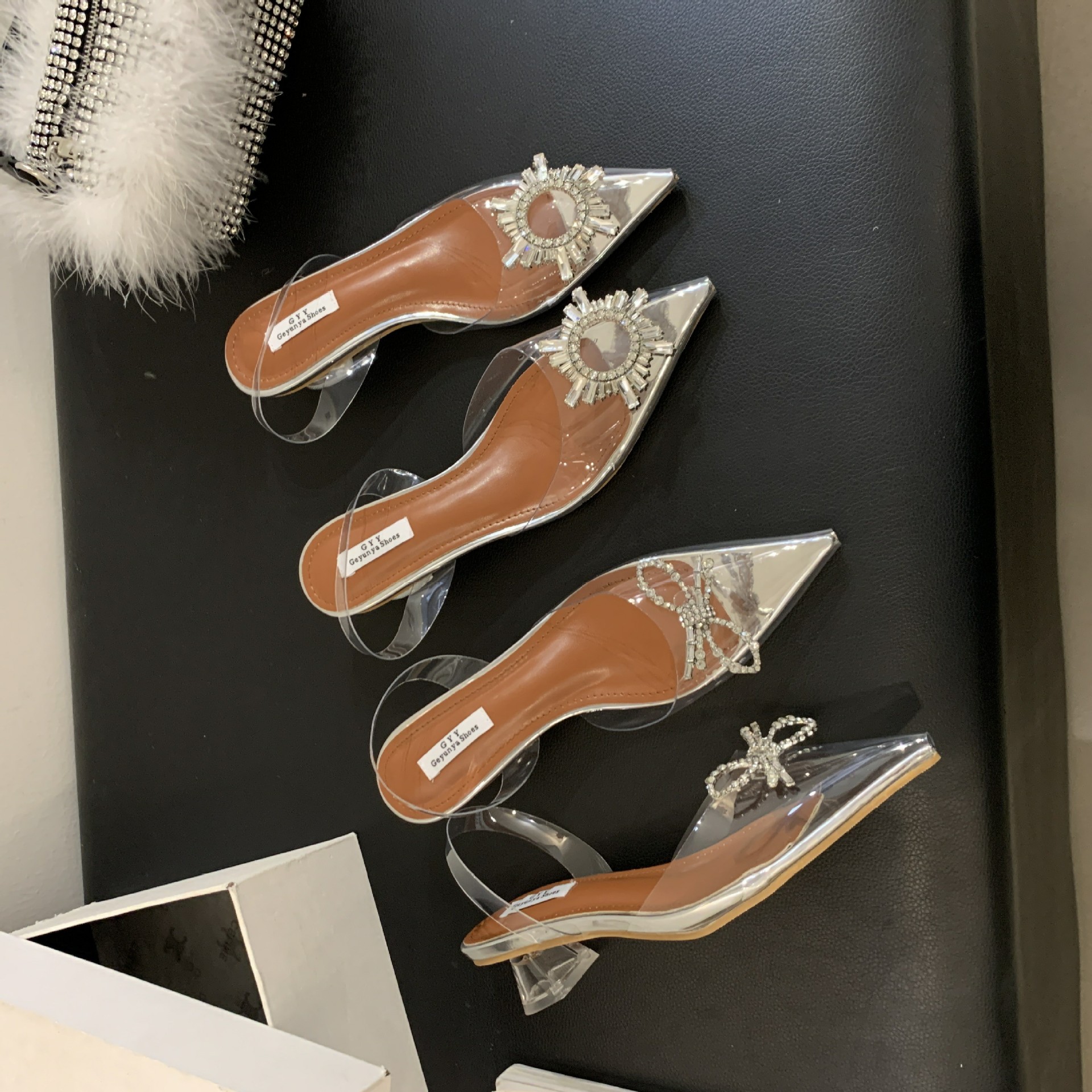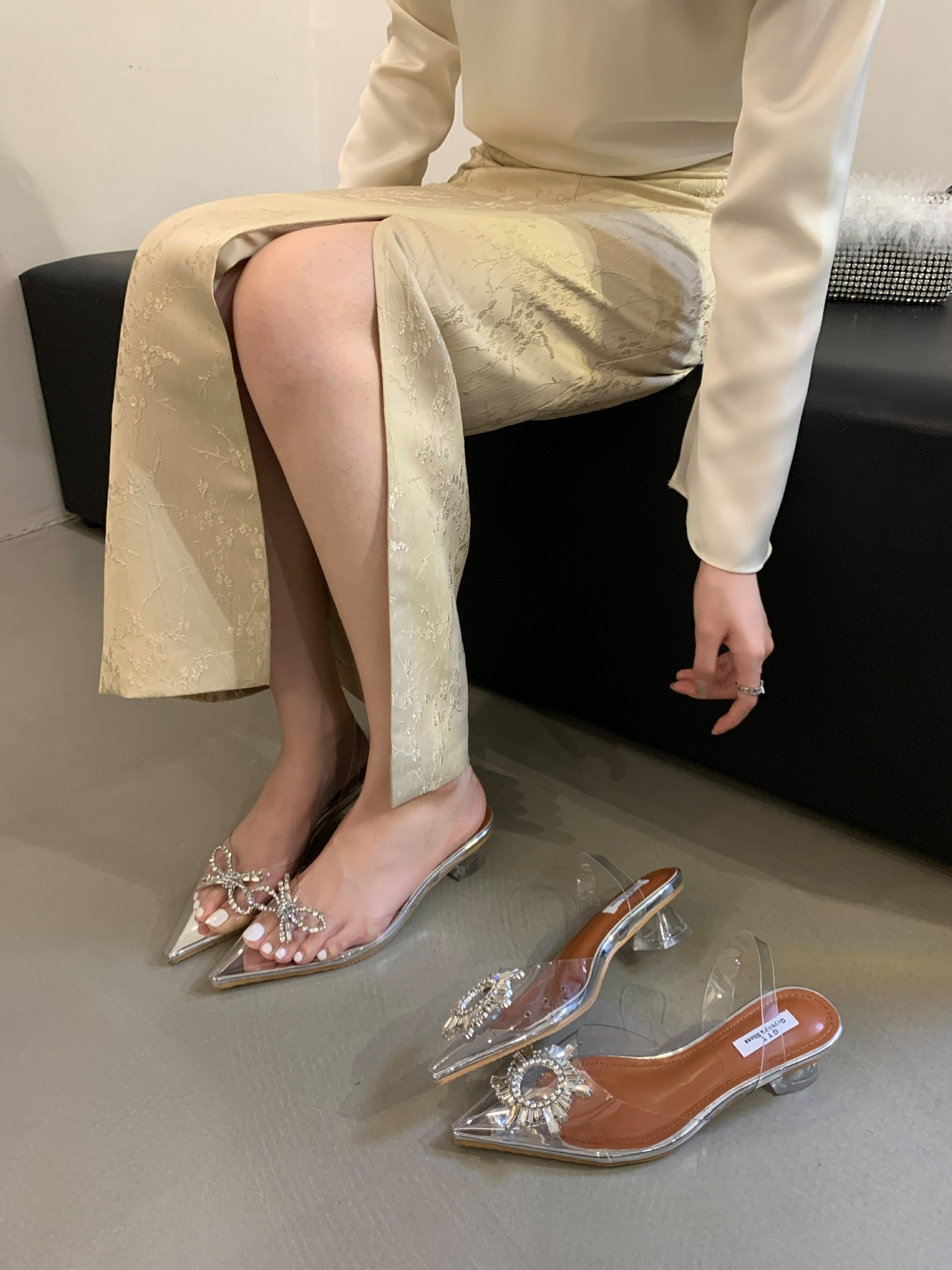 Baotou 투명 미드 힐 샌들 여성의 우아한 활 크리스탈 두꺼운 뒤꿈치 뾰족한 섹시한 라인스톤 하이힐 신발스토어 가기