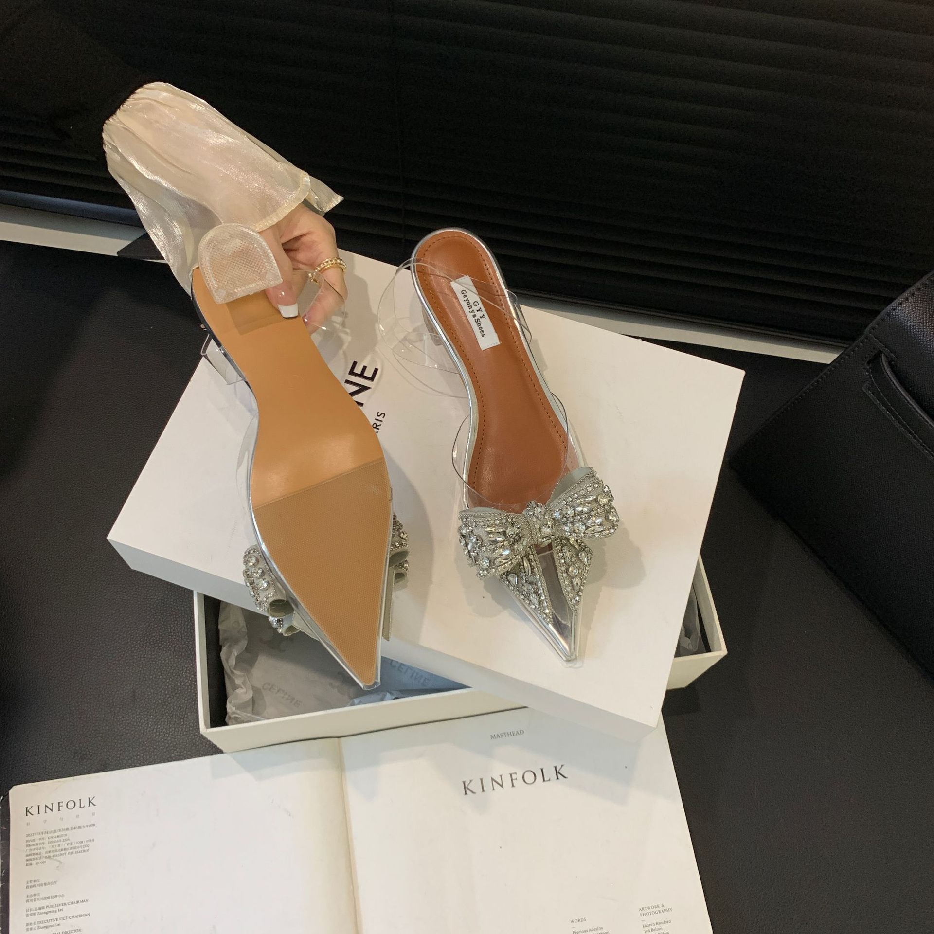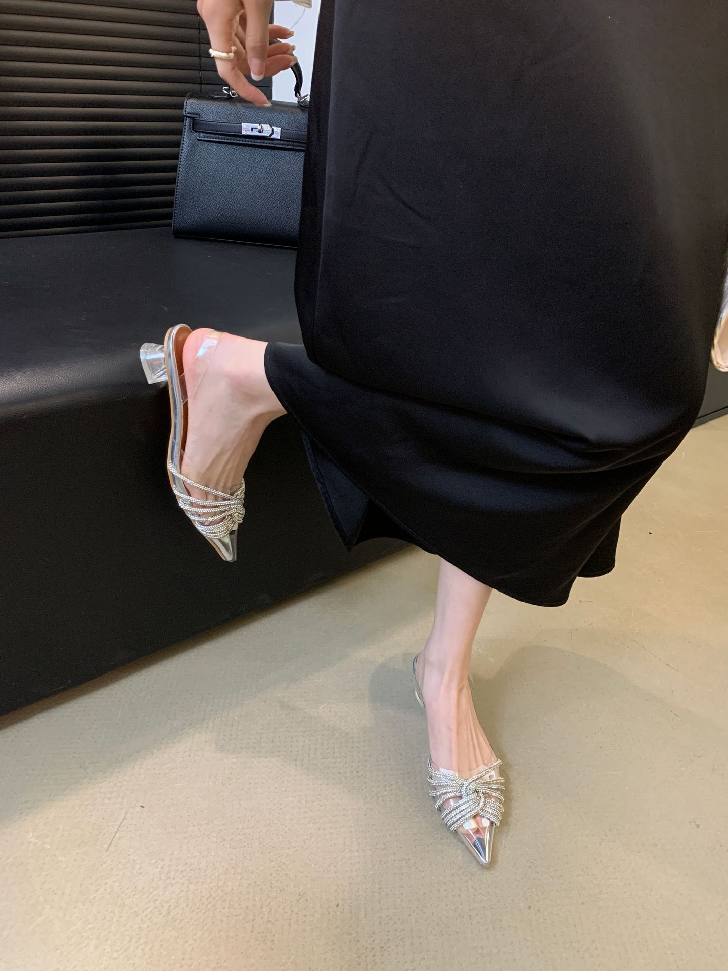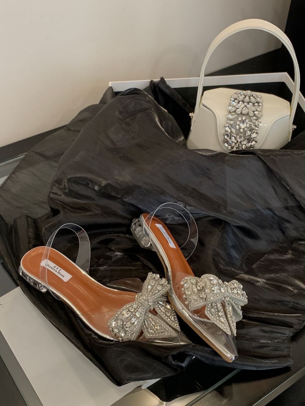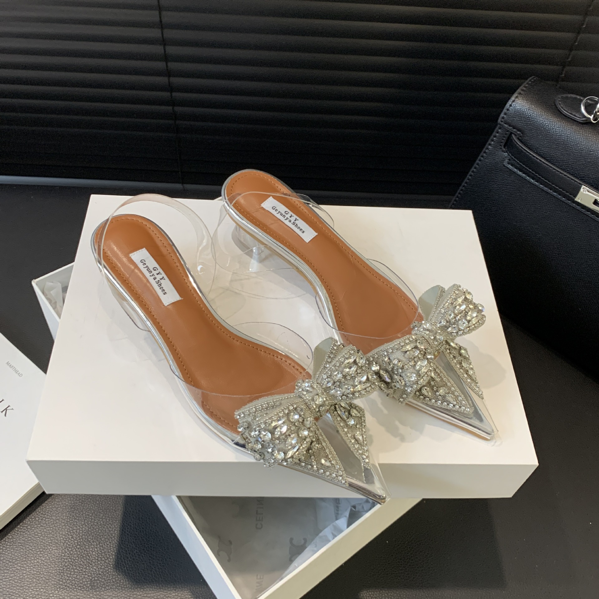 Baotou 투명 미드 힐 샌들 여성의 우아한 활 크리스탈 두꺼운 뒤꿈치 뾰족한 섹시한 라인스톤 하이힐 신발스토어 가기
