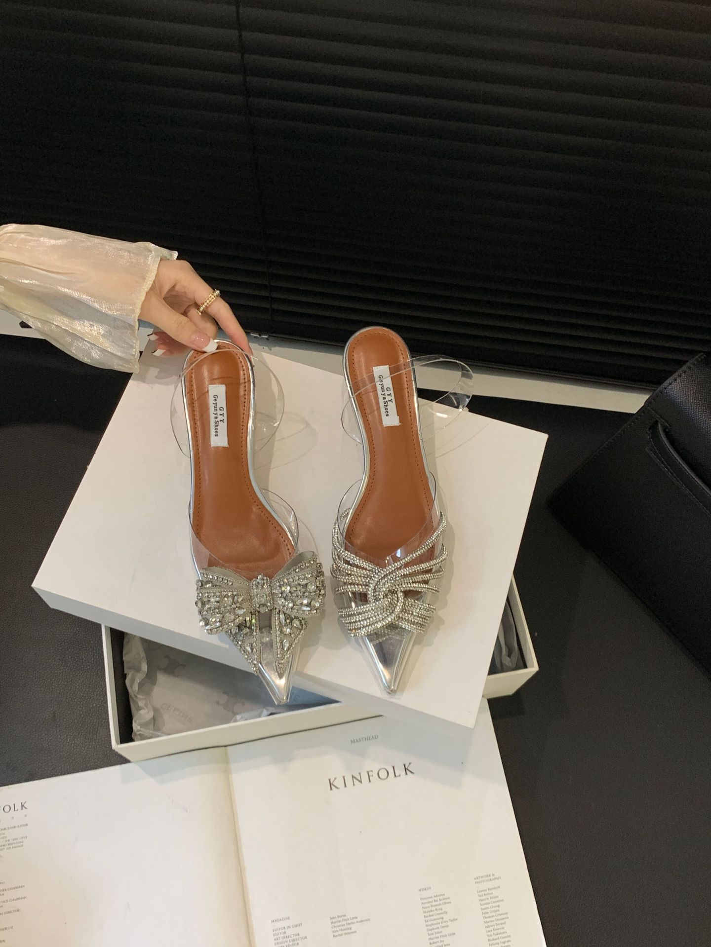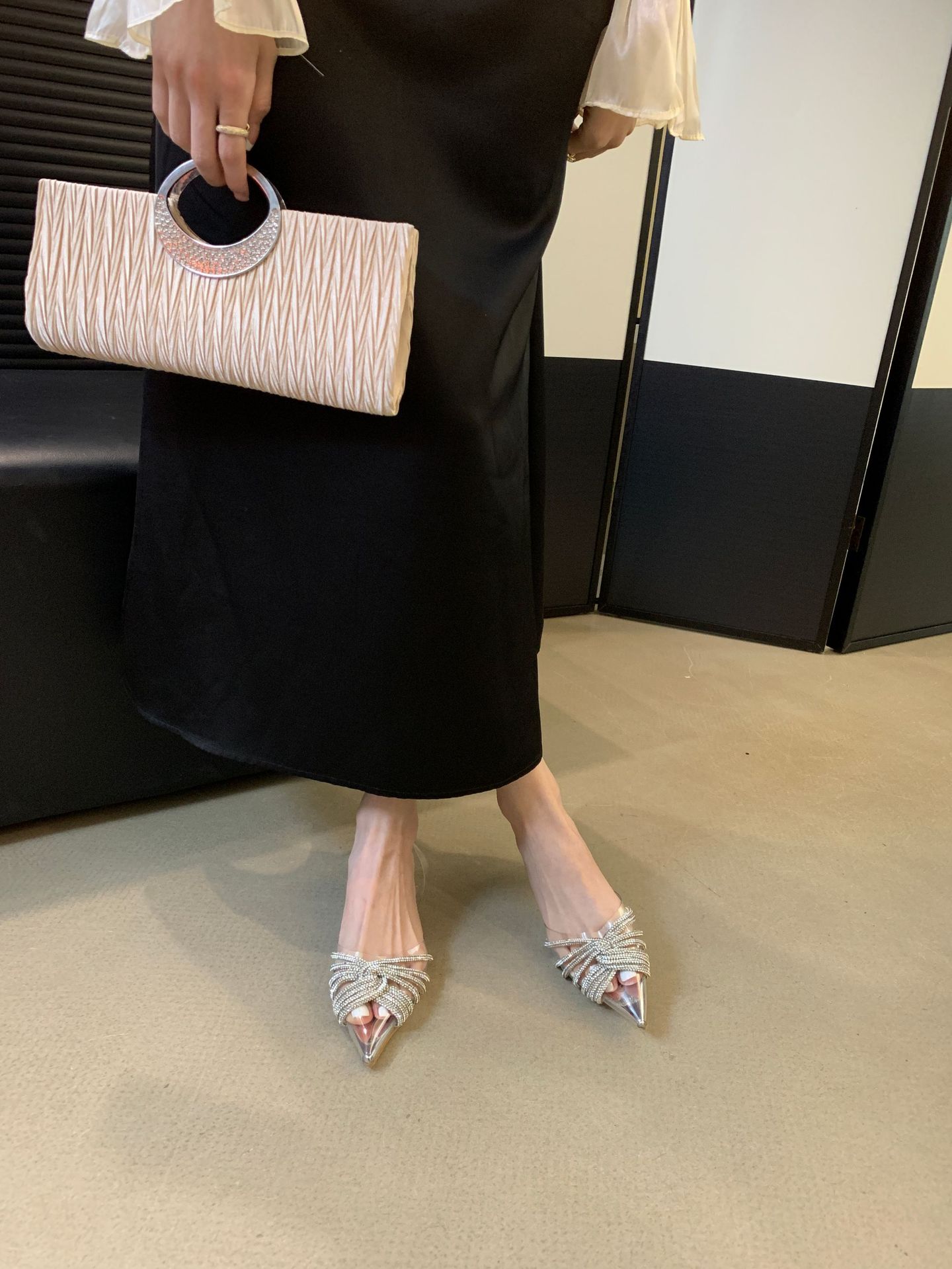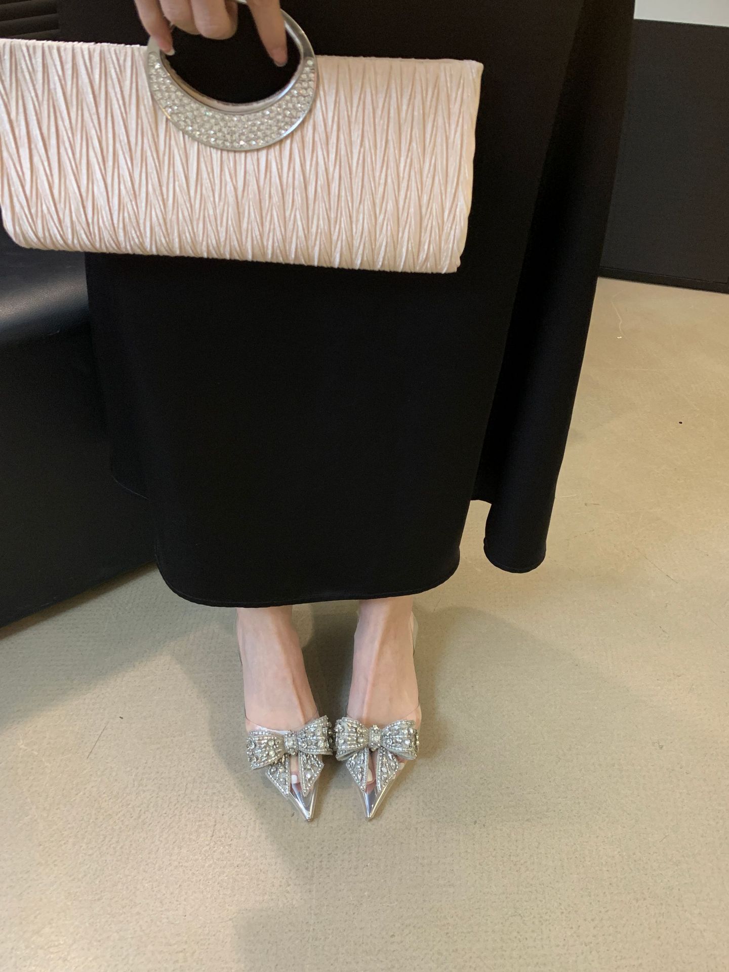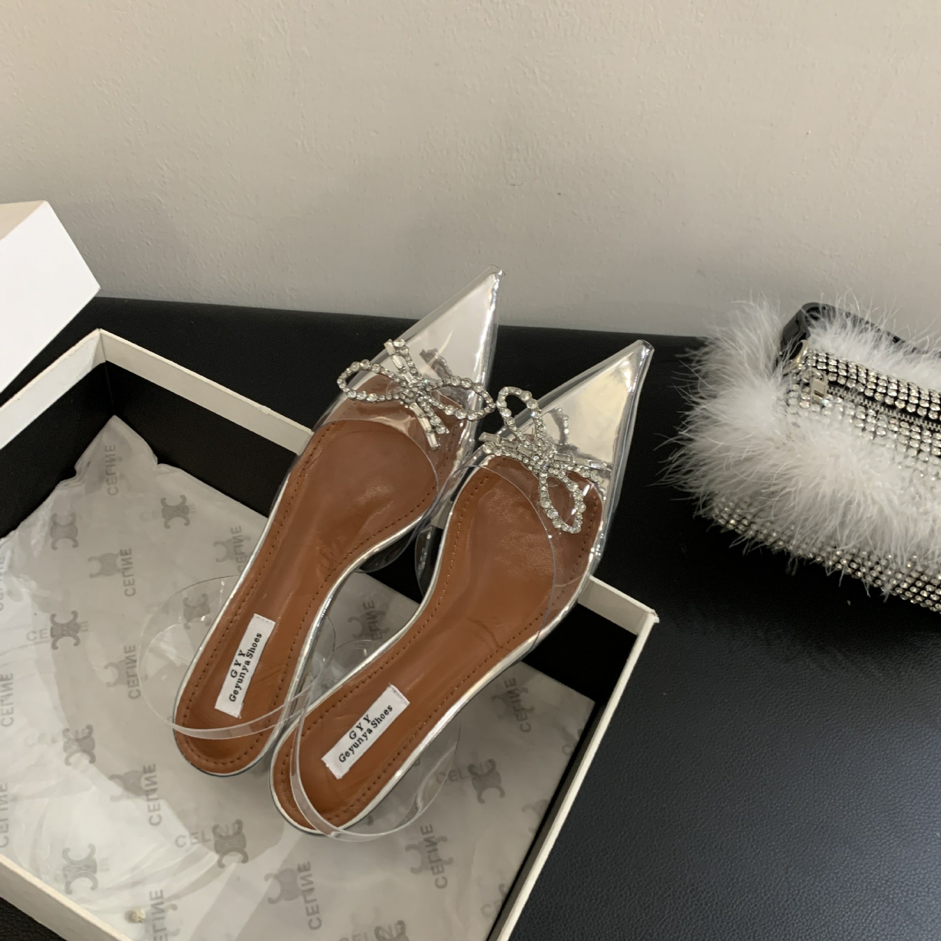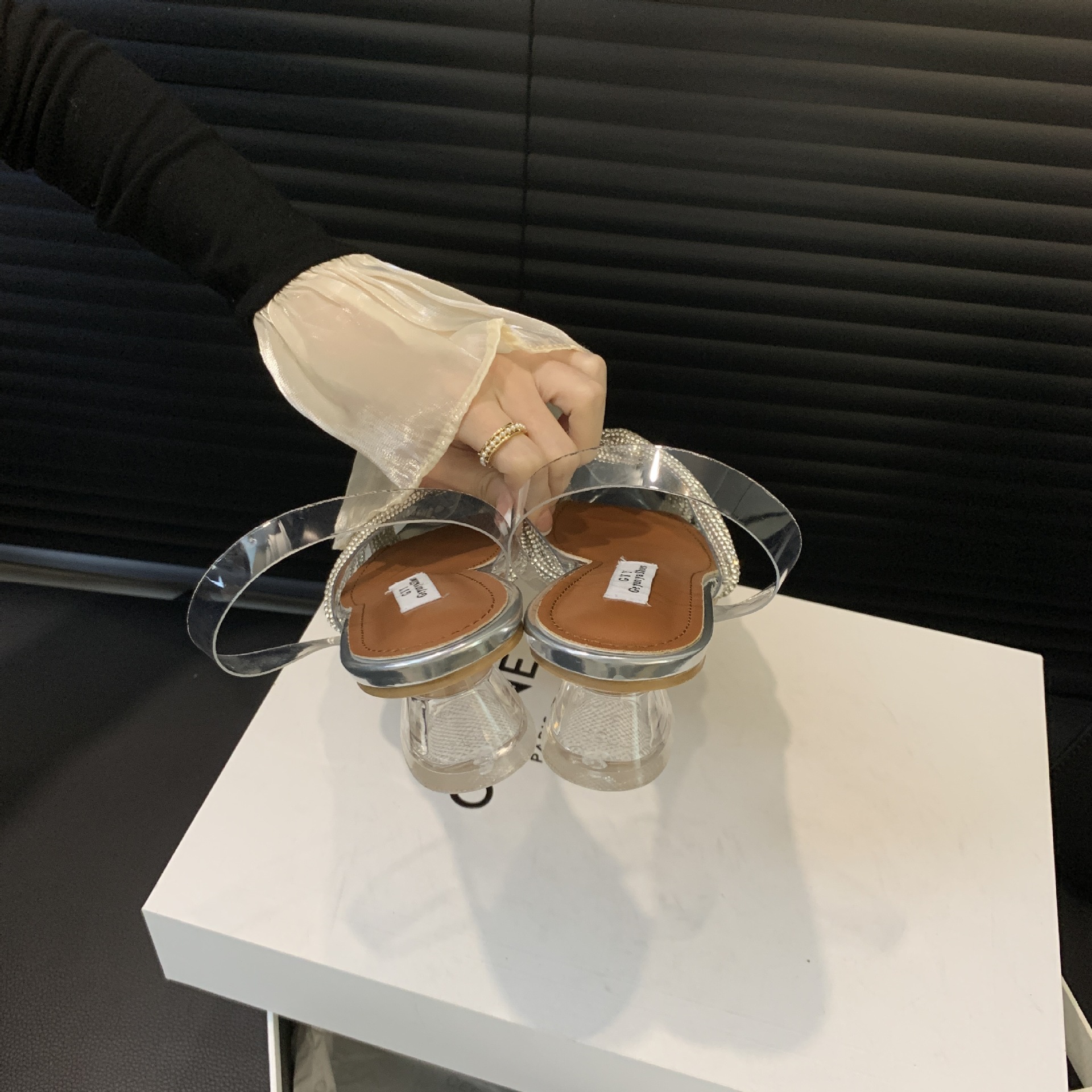 Baotou 투명 미드 힐 샌들 여성의 우아한 활 크리스탈 두꺼운 뒤꿈치 뾰족한 섹시한 라인스톤 하이힐 신발스토어 가기