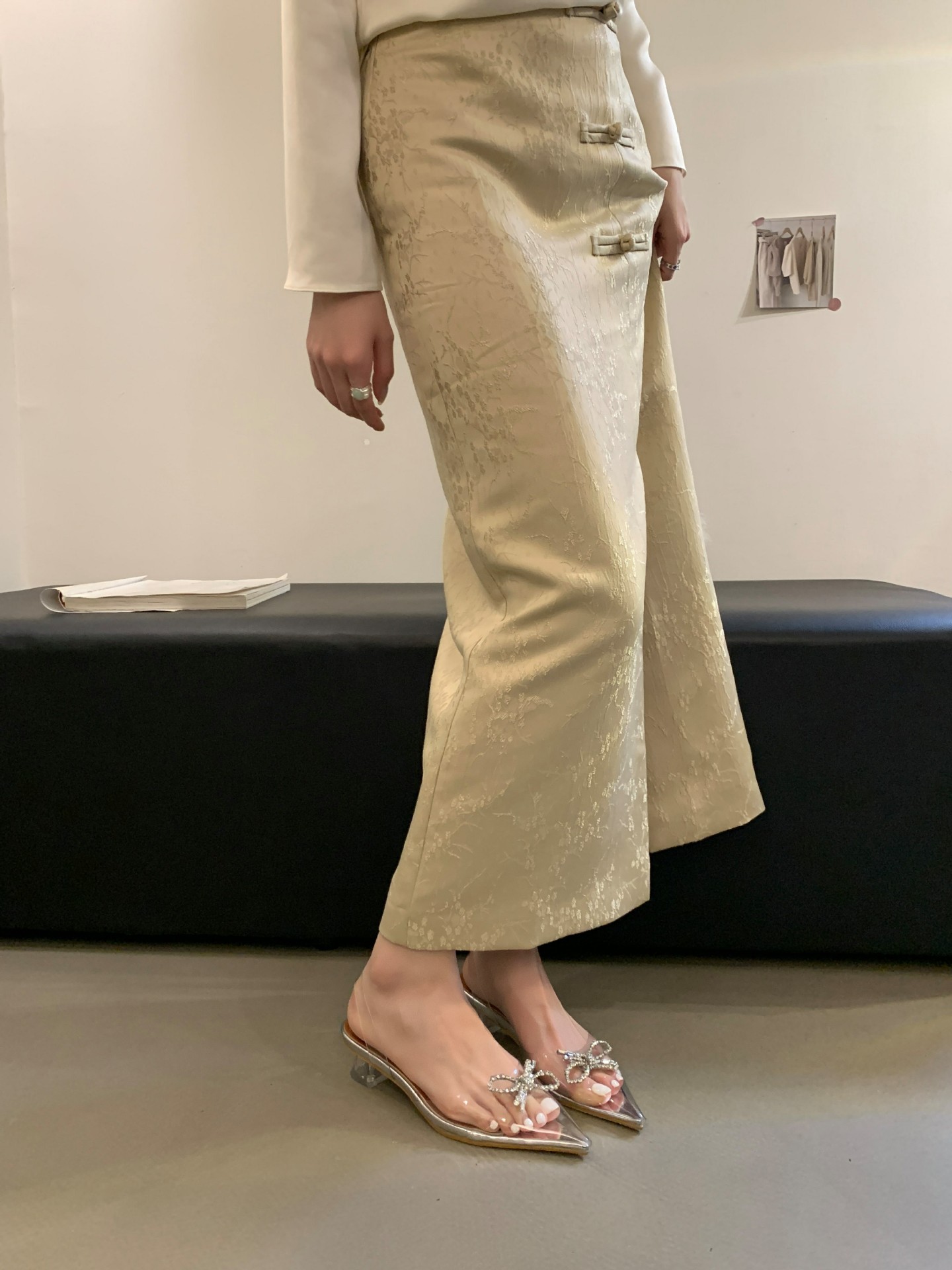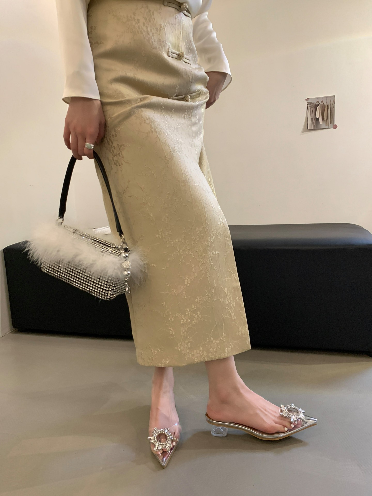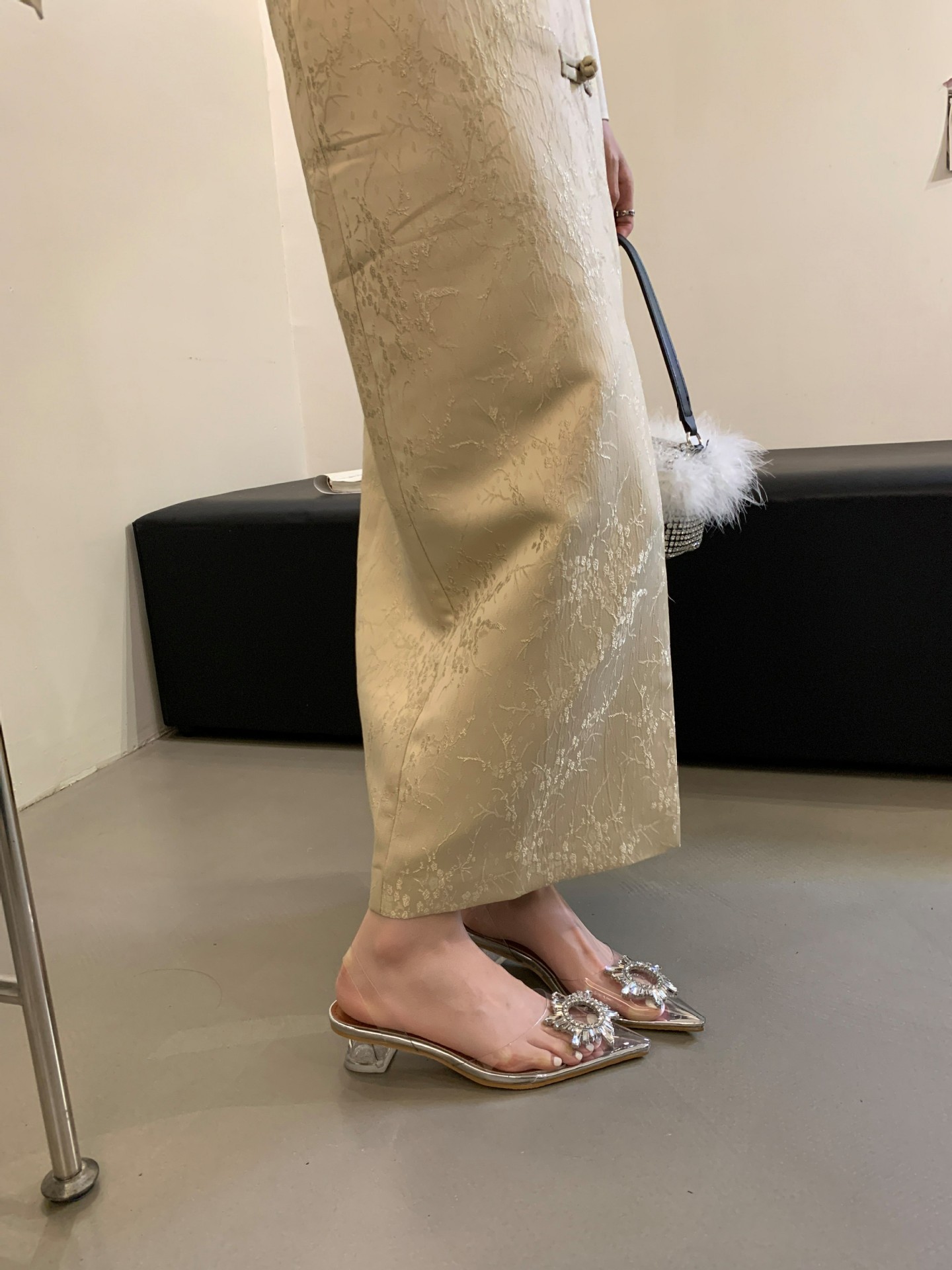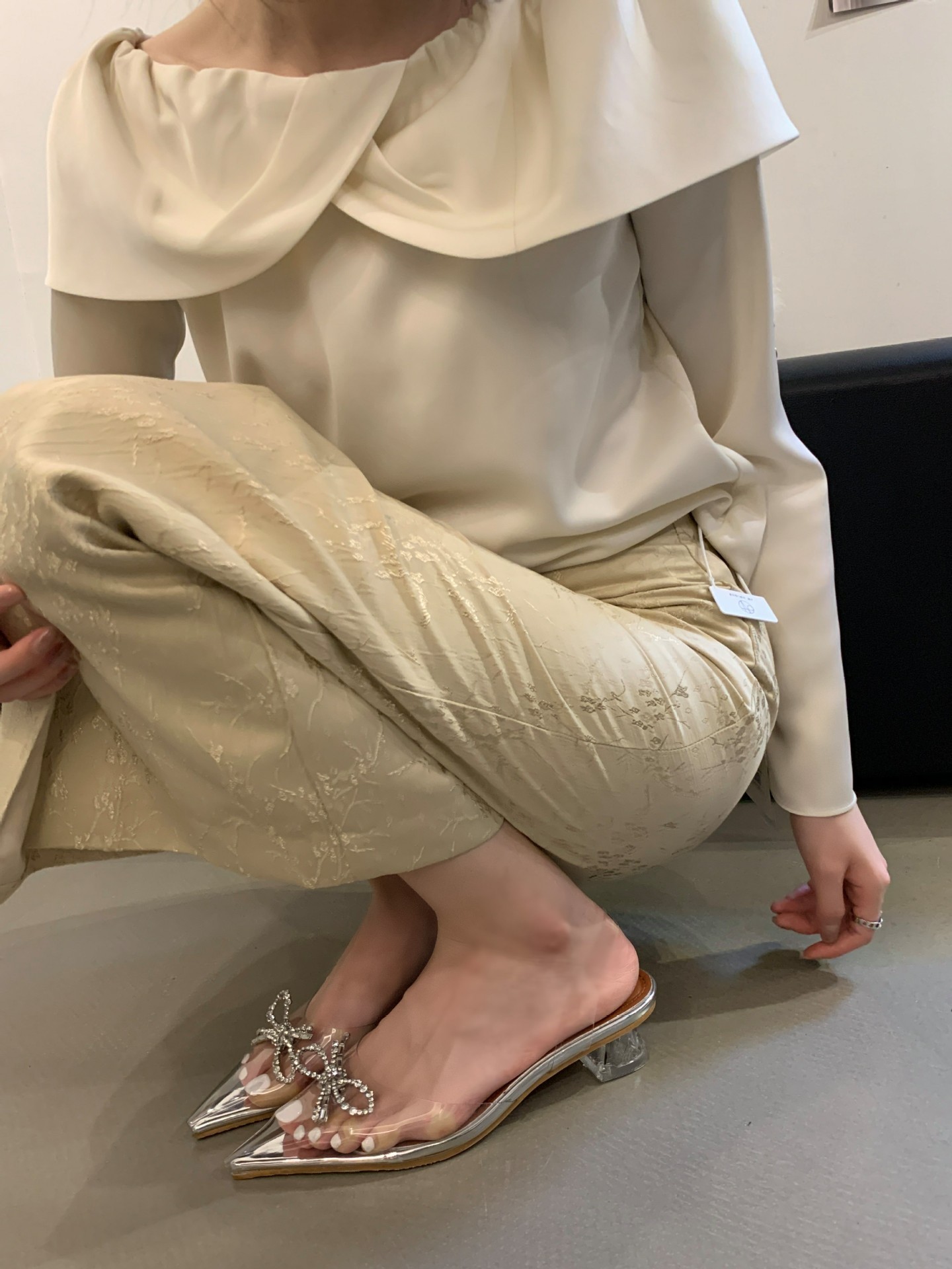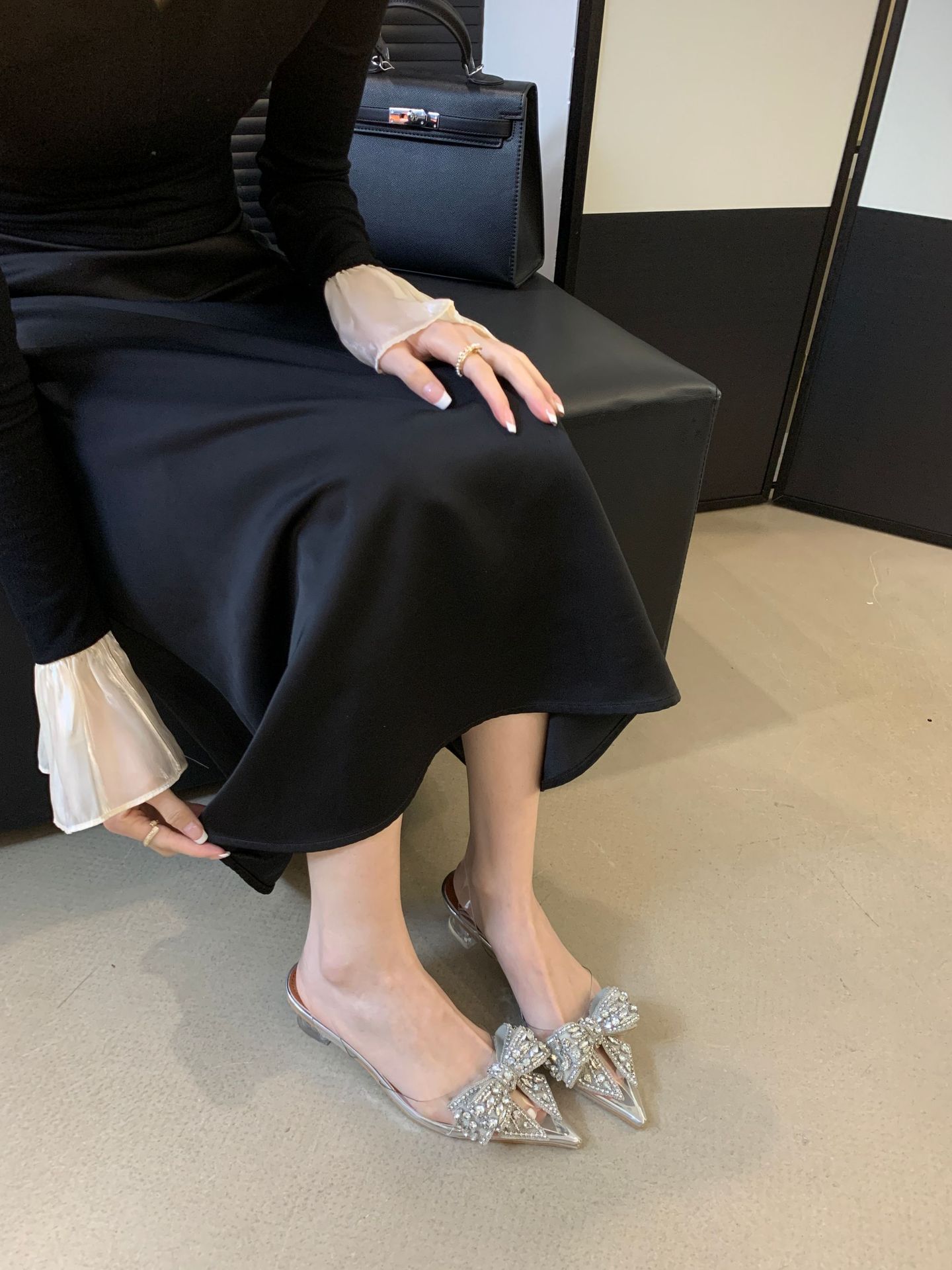 Baotou 투명 미드 힐 샌들 여성의 우아한 활 크리스탈 두꺼운 뒤꿈치 뾰족한 섹시한 라인스톤 하이힐 신발스토어 가기