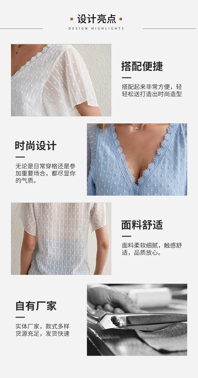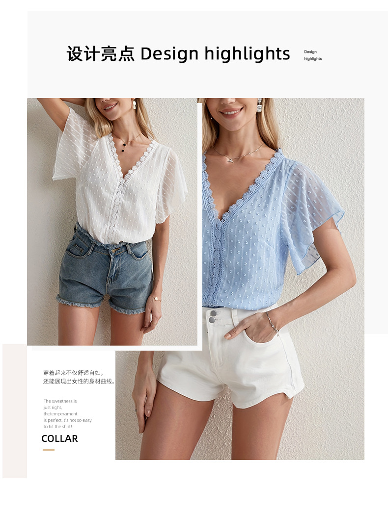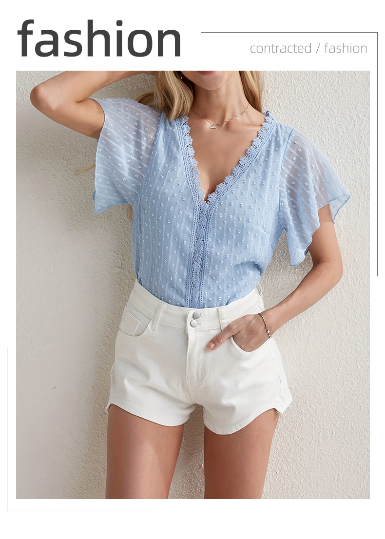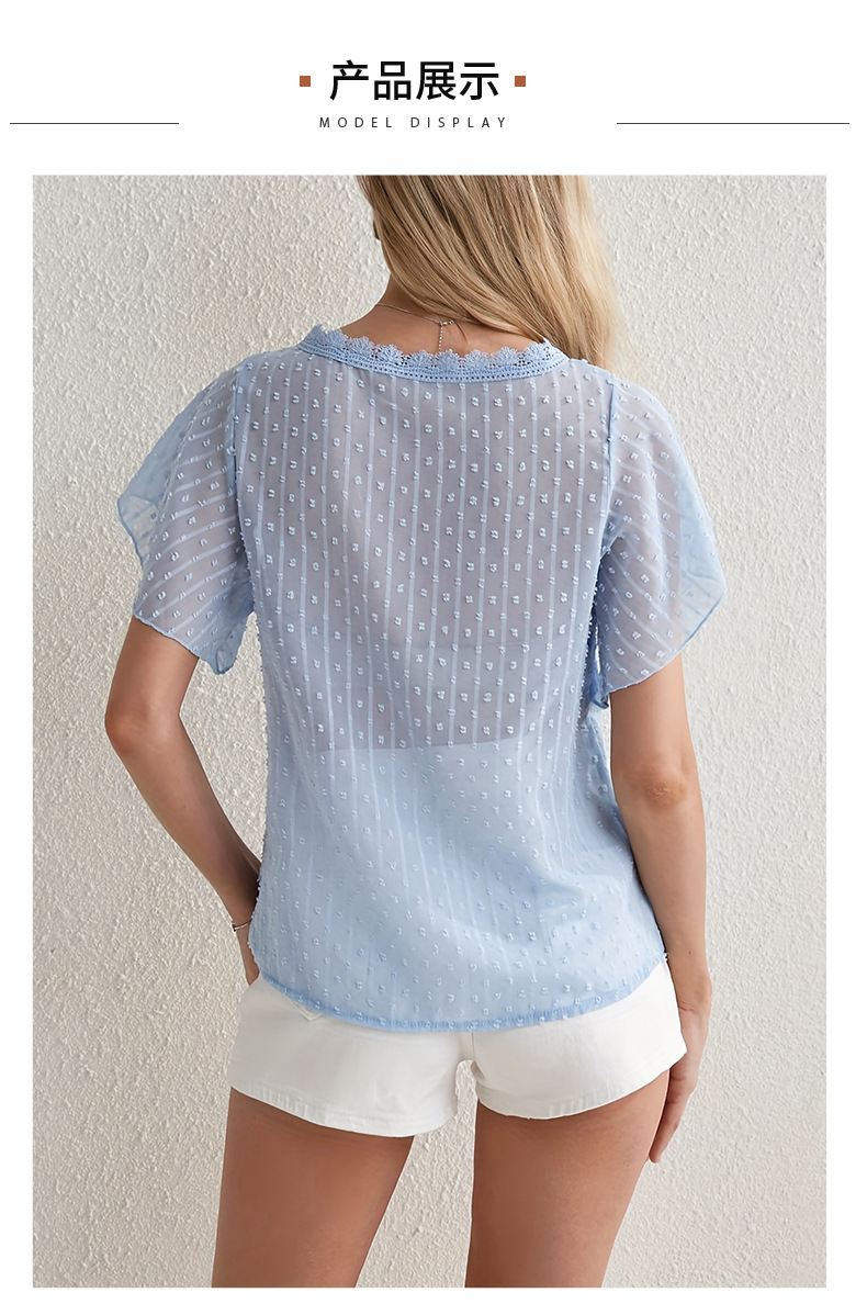 2024 유럽 및 미국 여성 의류 여성 통근 단색 크로스 보더 깊은 V 넥 쉬폰 셔츠 자수 레이스 반팔 탑 여성스토어 가기