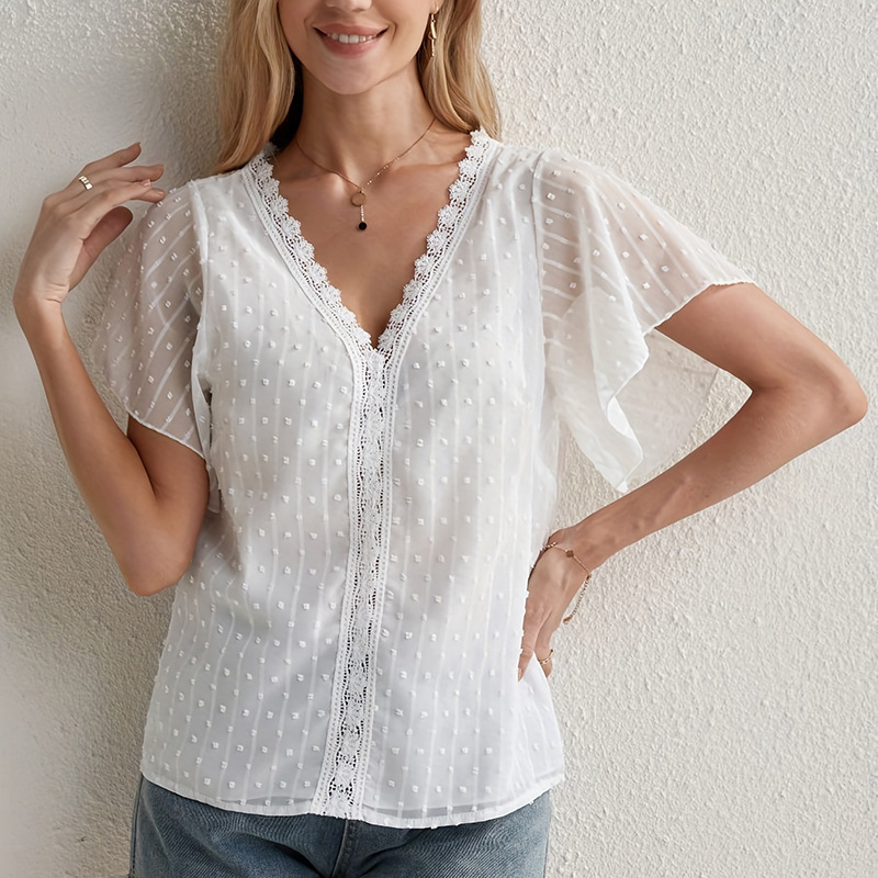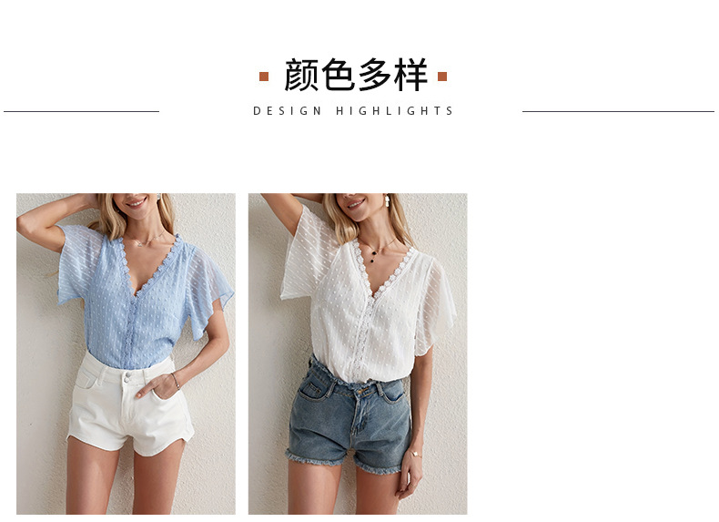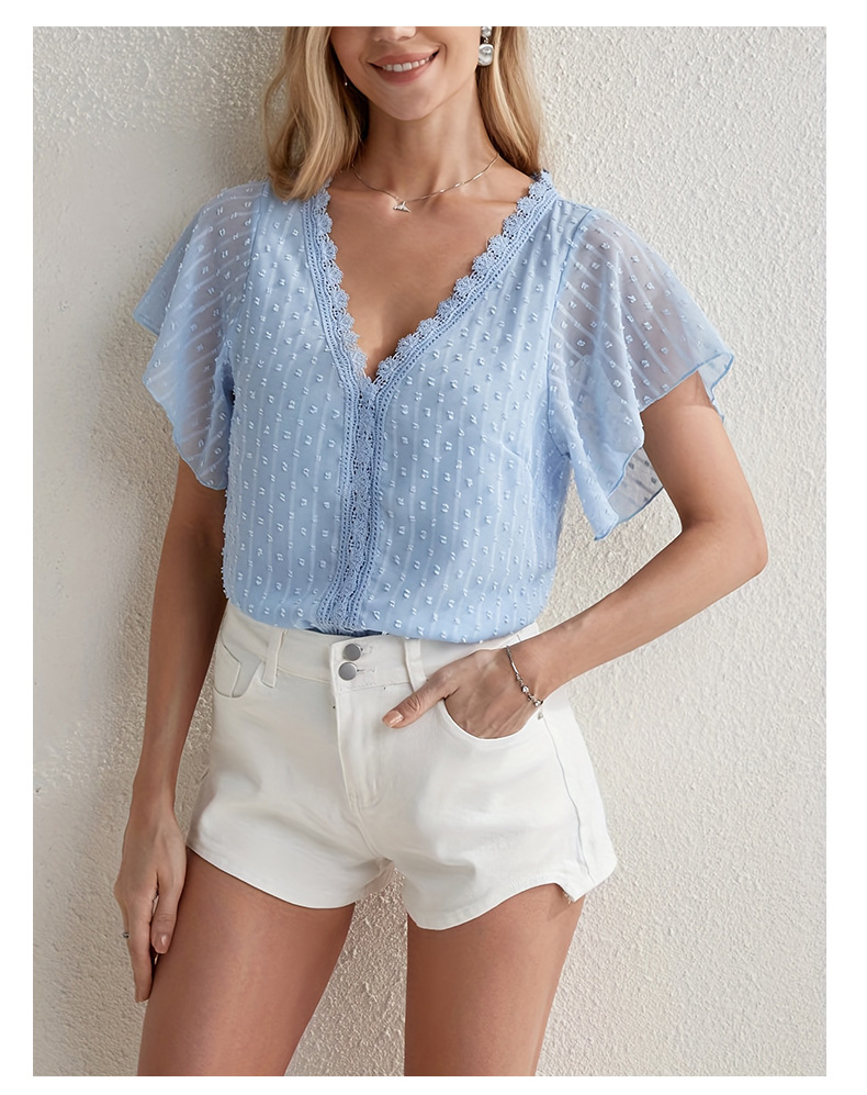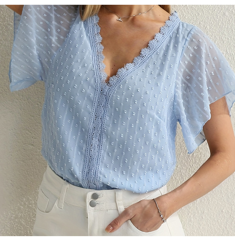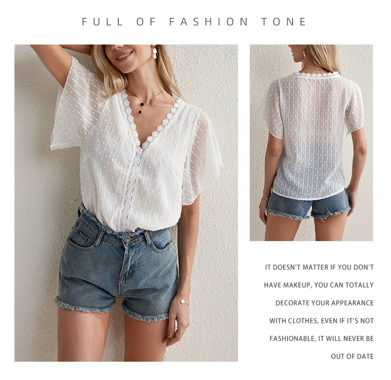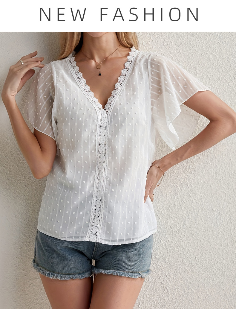 2024 유럽 및 미국 여성 의류 여성 통근 단색 크로스 보더 깊은 V 넥 쉬폰 셔츠 자수 레이스 반팔 탑 여성스토어 가기