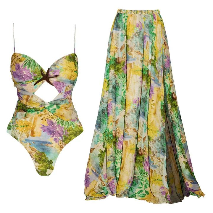 2024 유럽과 미국의 새로운 아마존 AliExpress 다크 그린 인쇄 불가사리 장식 원피스 수영복 여성의 국경 폭발스토어 가기