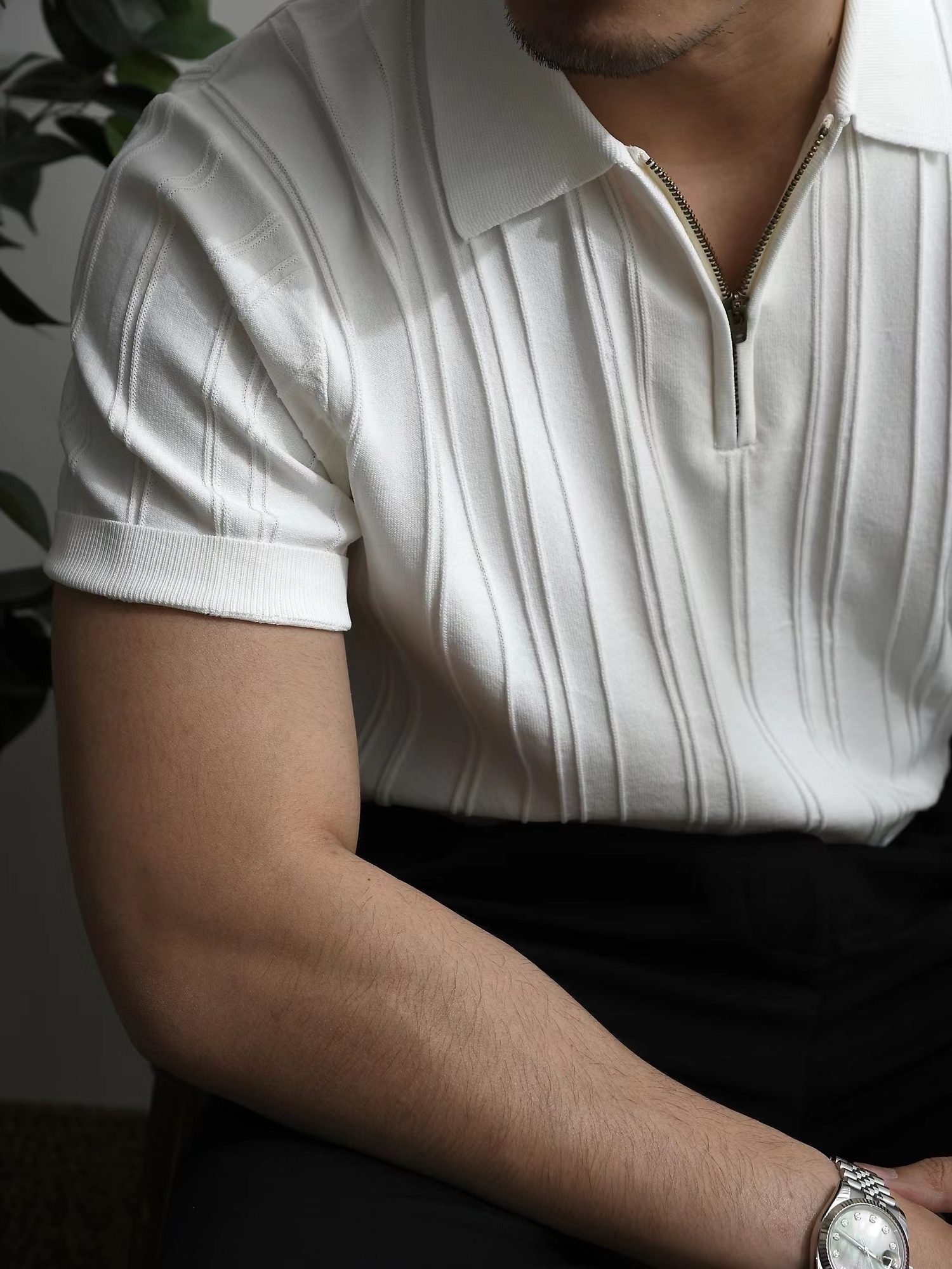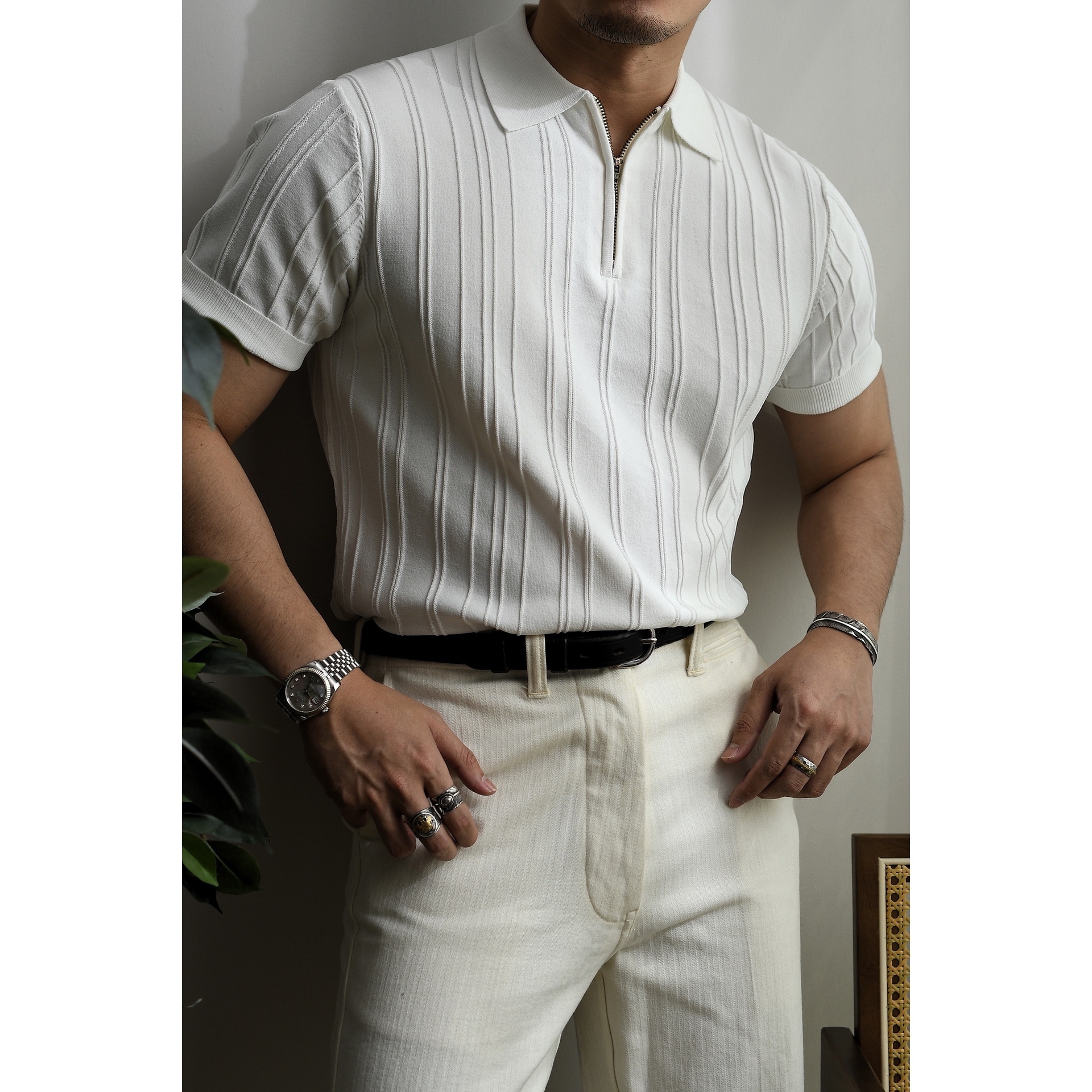 지퍼 니트 반팔 폴로 셔츠 남자의 여름 아메리칸 스타일 복고풍 느슨한 수직 줄무늬 구덩이 옷깃 티셔츠 남자스토어 가기