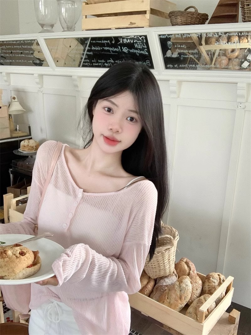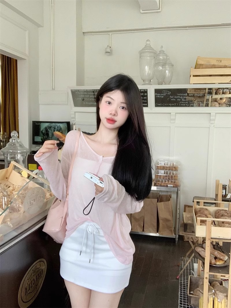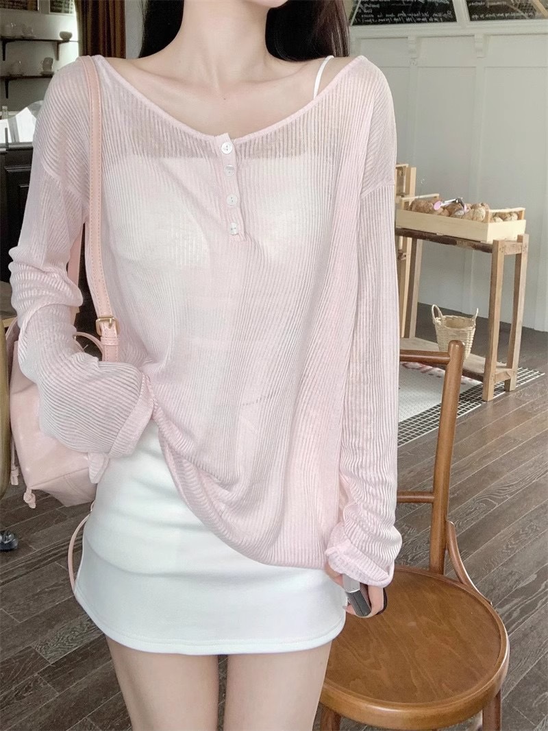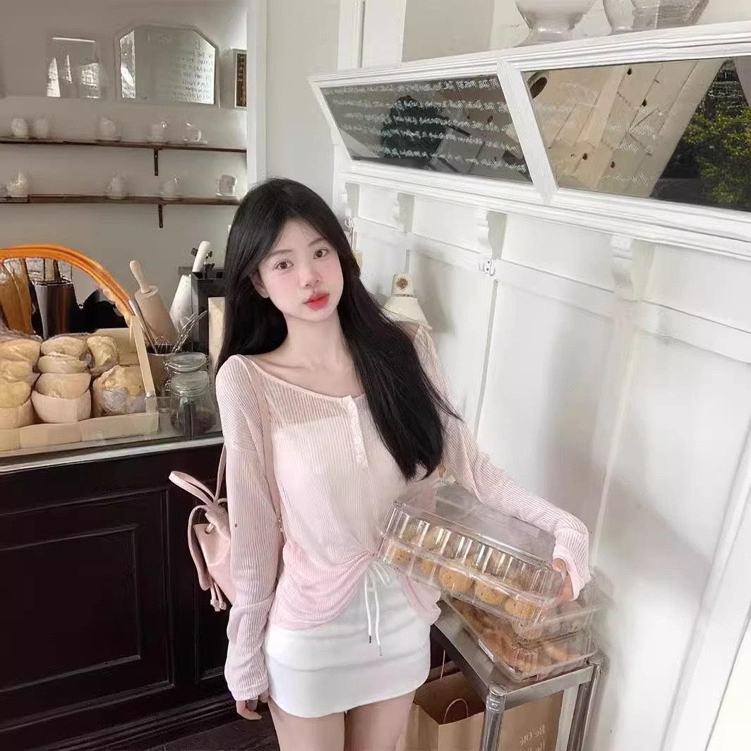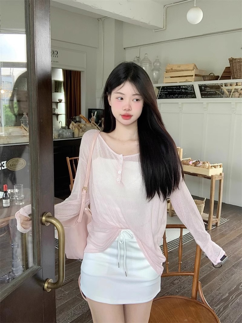 Le Ding ~ Lazy Wind Loose Slim Outer Top 순수 백리스 핑크 선 스크린 블라우스 여성용 레이스 업 블라우스스토어 가기