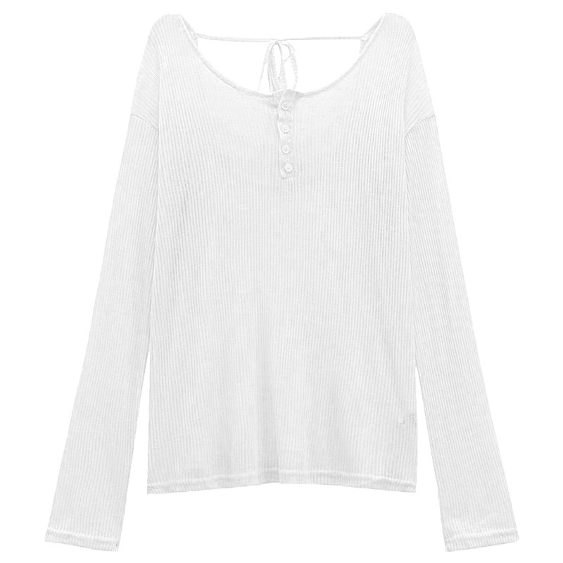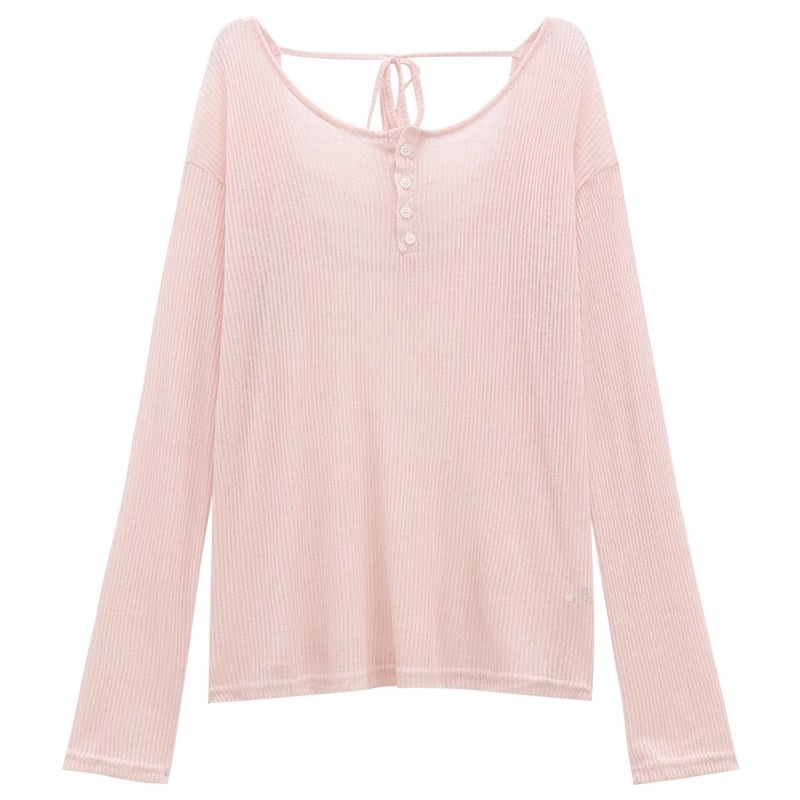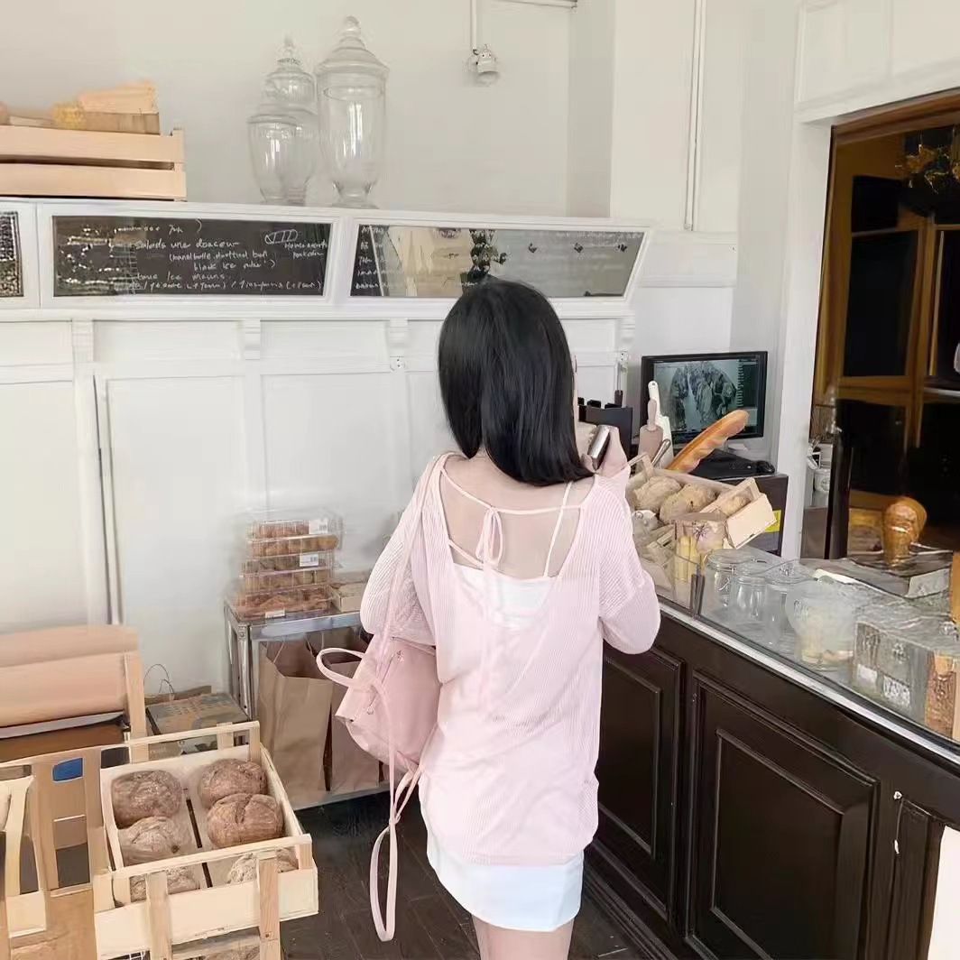 Le Ding ~ Lazy Wind Loose Slim Outer Top 순수 백리스 핑크 선 스크린 블라우스 여성용 레이스 업 블라우스
