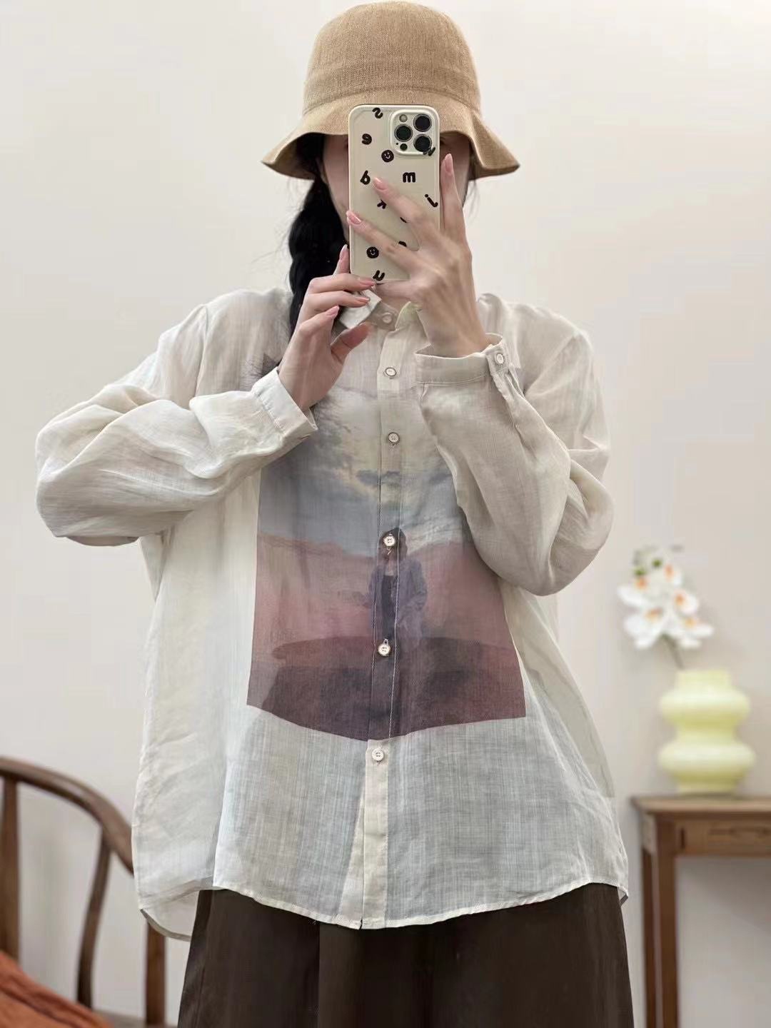 가을 2024 새로운 레트로 캐주얼 인쇄 된 대마 셔츠 옷깃 긴 소매 셔츠 탑스토어 가기