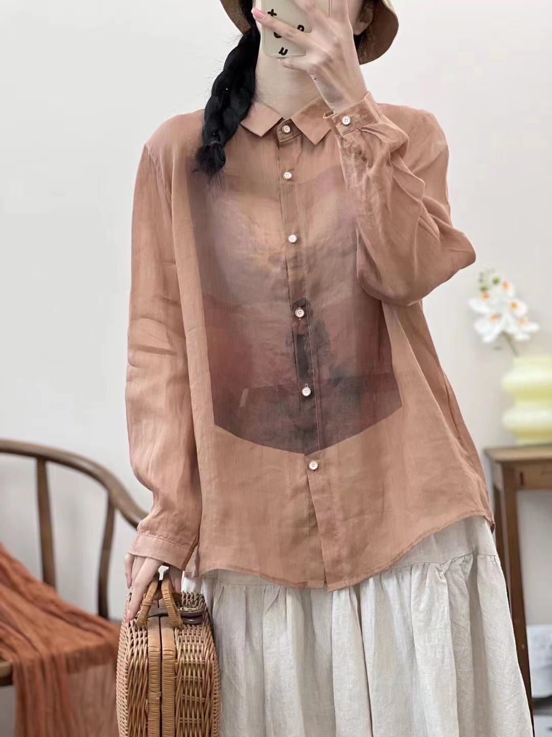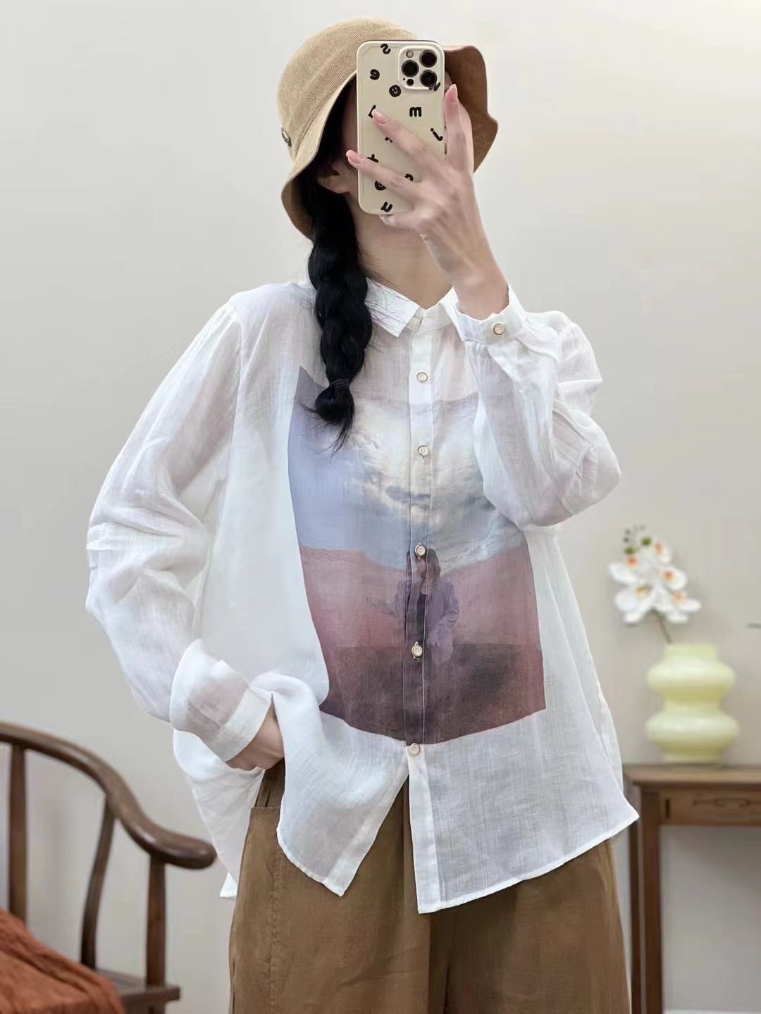 가을 2024 새로운 레트로 캐주얼 인쇄 된 대마 셔츠 옷깃 긴 소매 셔츠 탑