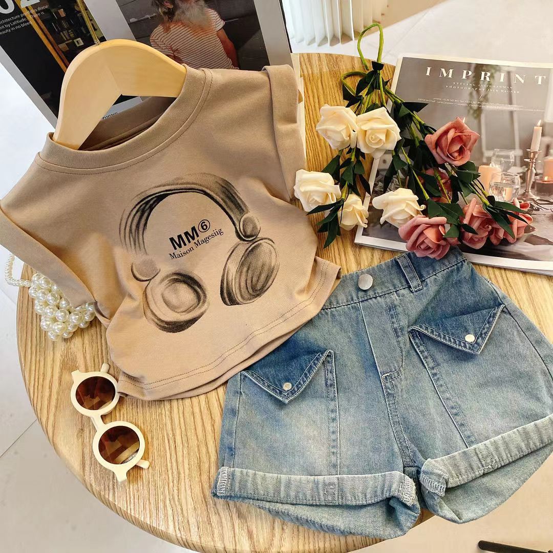 여자 세트 2024 여름 새 어린이 민소매 티셔츠 스타일 투피스 아기 소녀 여름 데님 반바지 세트