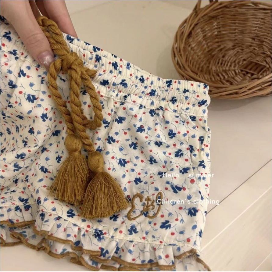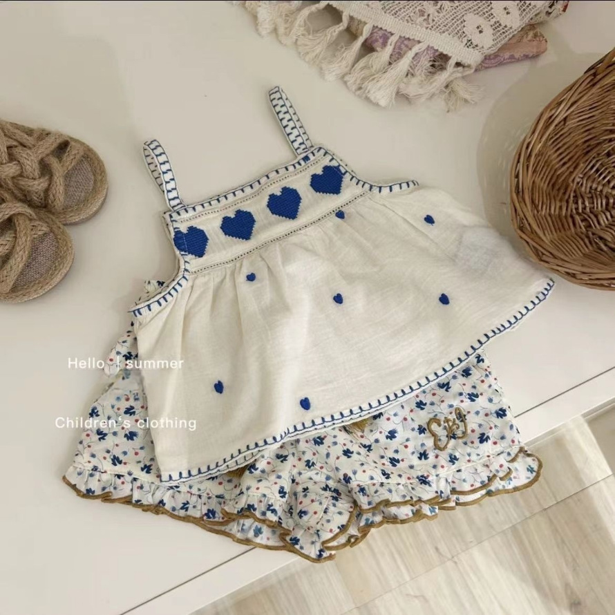 한국 아동복 슈퍼 귀여운 2024 여자 새로운 스타일 서스펜더 반바지 투피스 어린이 여름 폭발 세트 조수