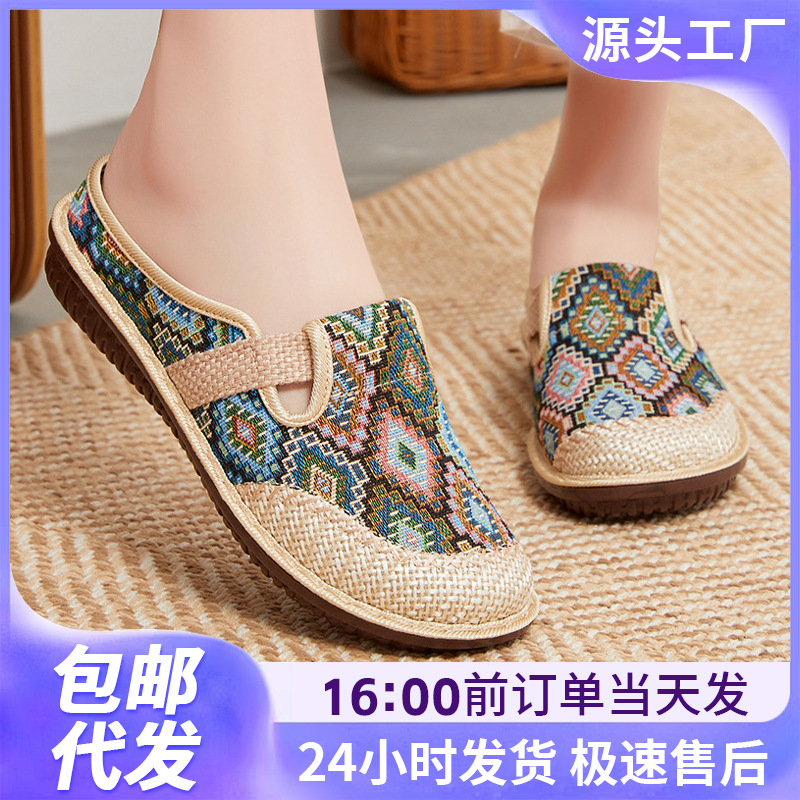 여름 새로운 민족 스타일 반 슬리퍼 오래 된 베이징 천 신발 리넨 캐주얼 어머니 신발 소프트 단독 홈 신발 여성용 슬리퍼