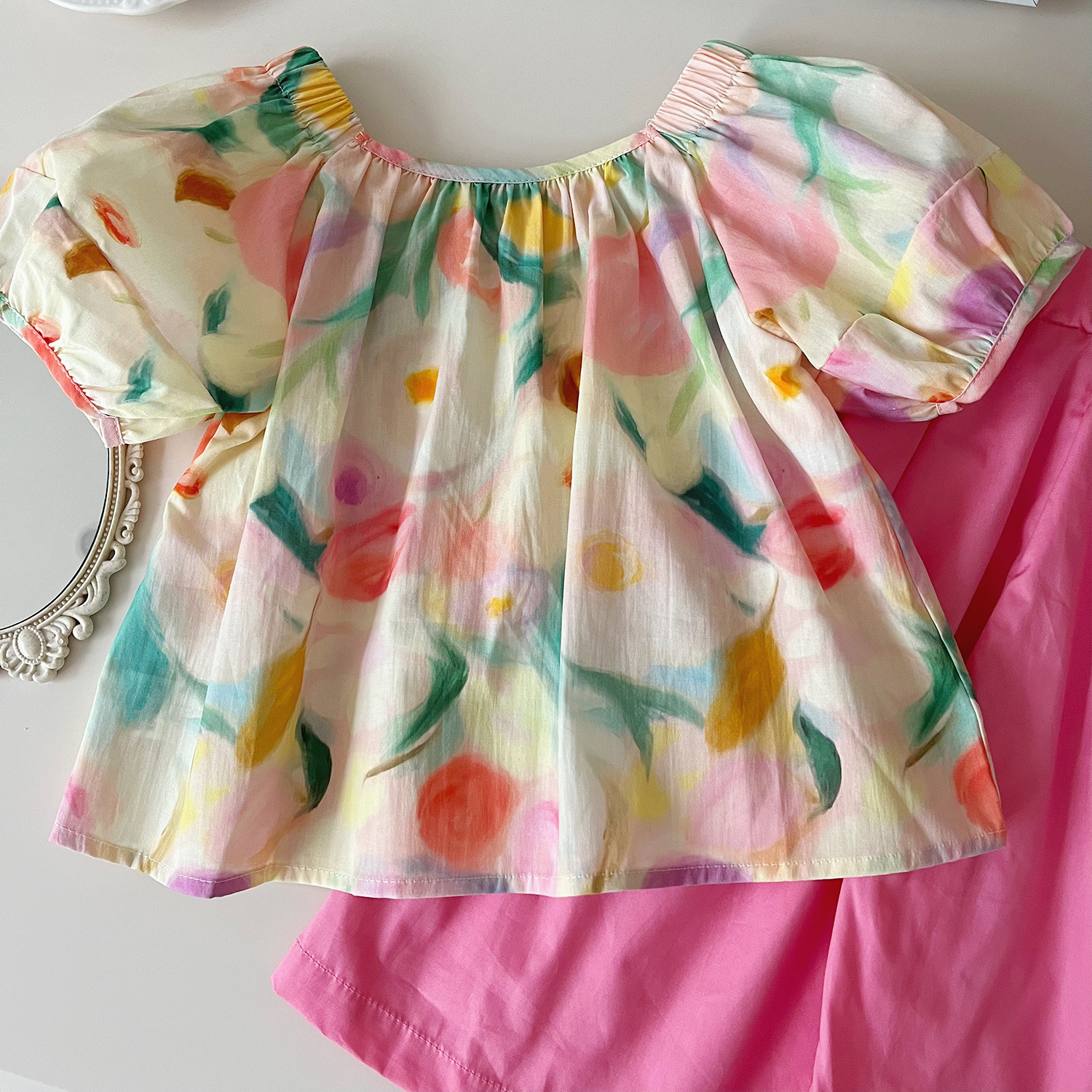 여자 세트 2024 여름 새로운 한국식 반팔 꽃 인형 셔츠 와이드 레그 바지 투피스 크로스 보더 헤어