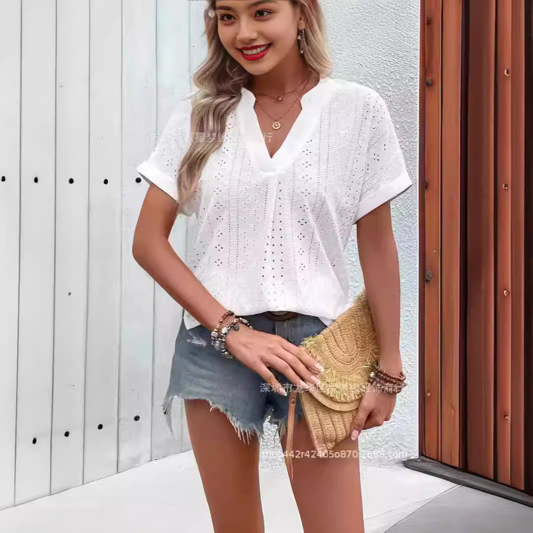 2024 아마존 유럽과 미국 국경 기본 단색 티셔츠 여성을위한 최고 V 넥 텍스처 자카드 짧은 소매 탑