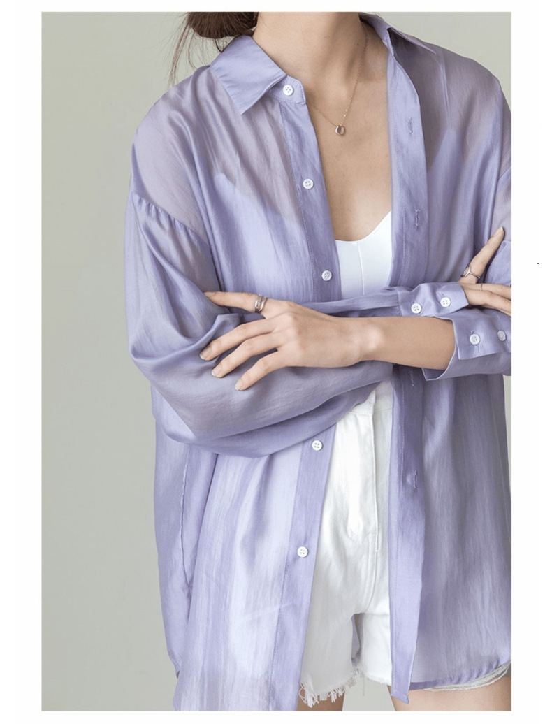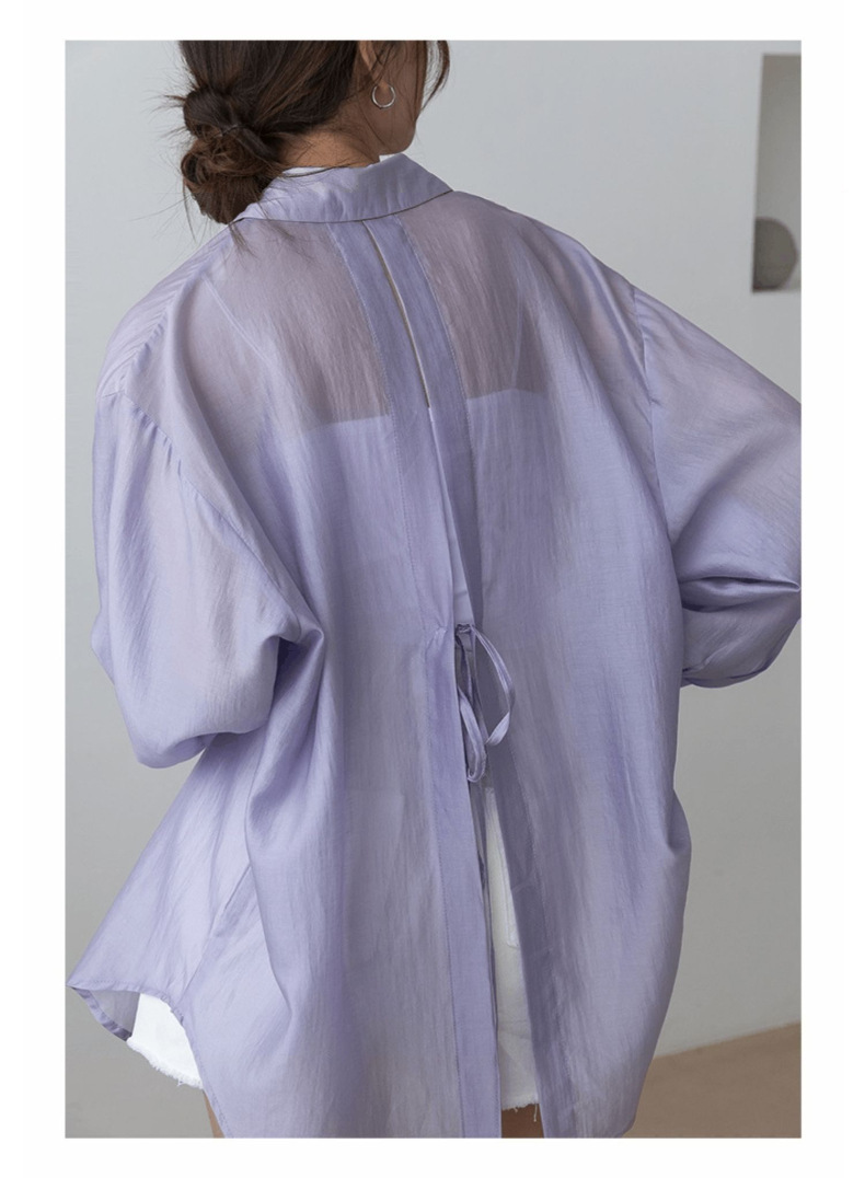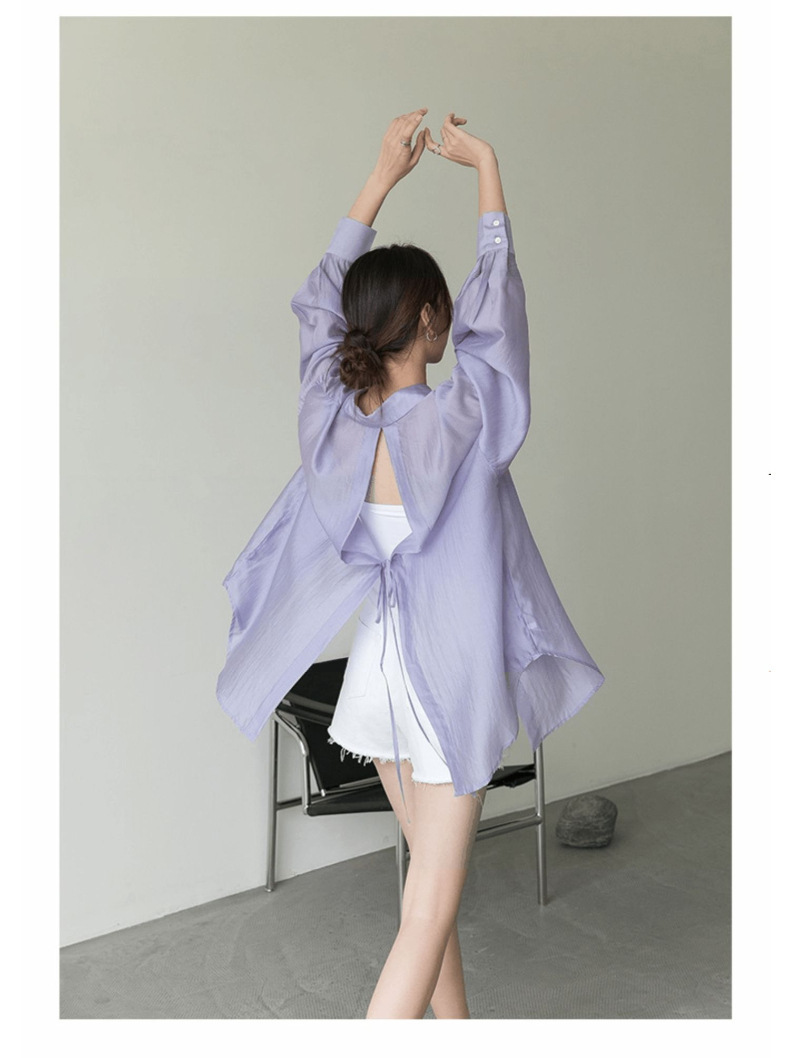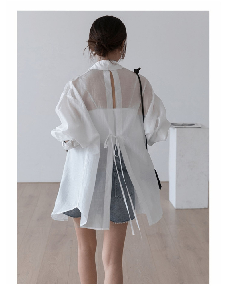 선스크린 셔츠 여성의 여름 2024 새로운 얇은 코트 프랑스 디자인 틈새 백리스 쉬폰 탑