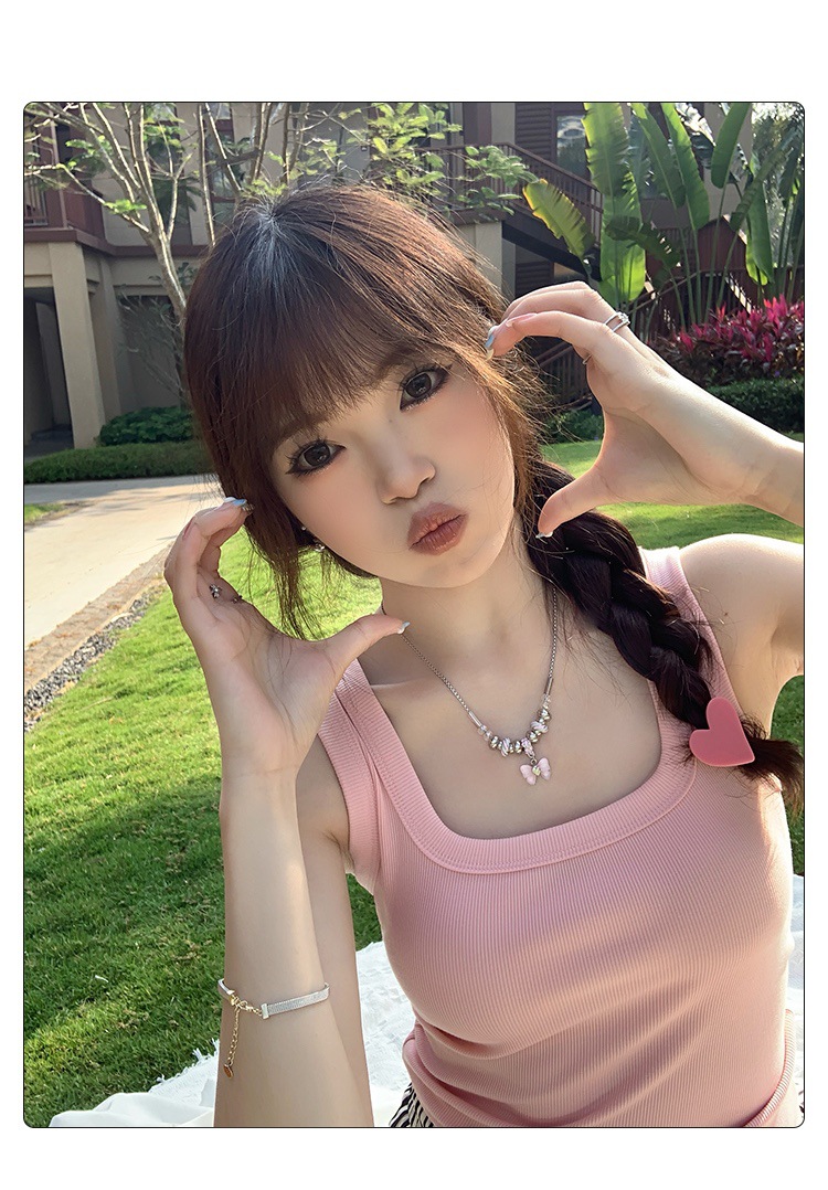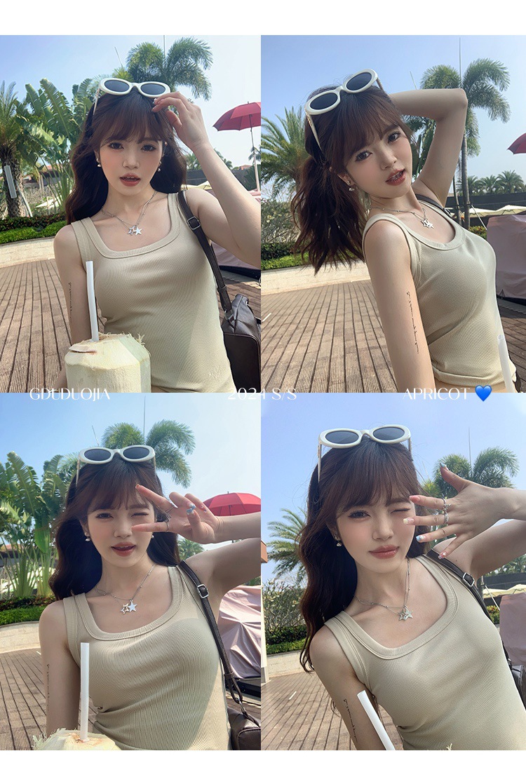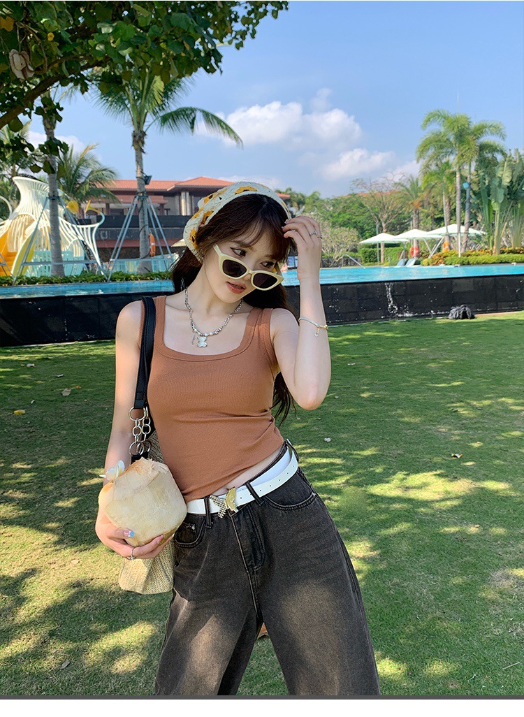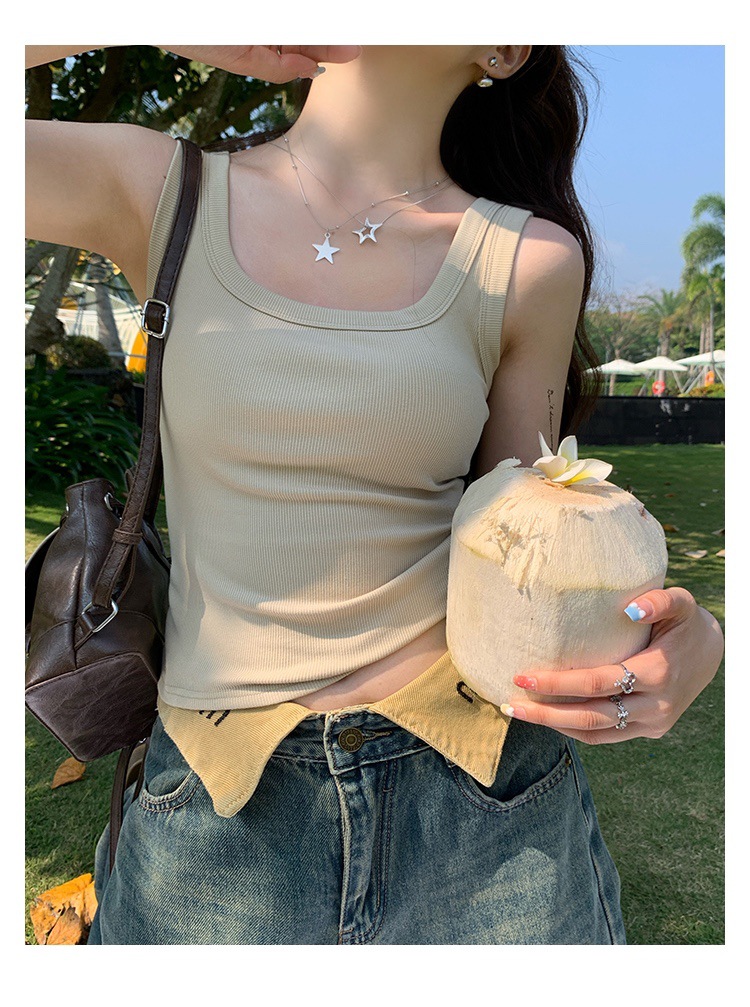 한국식 스퀘어 칼라 카미솔 간단한 올매치 편안한 유방 커버 가슴 패드베이스 핫 걸 슬림핏 민소매 탑