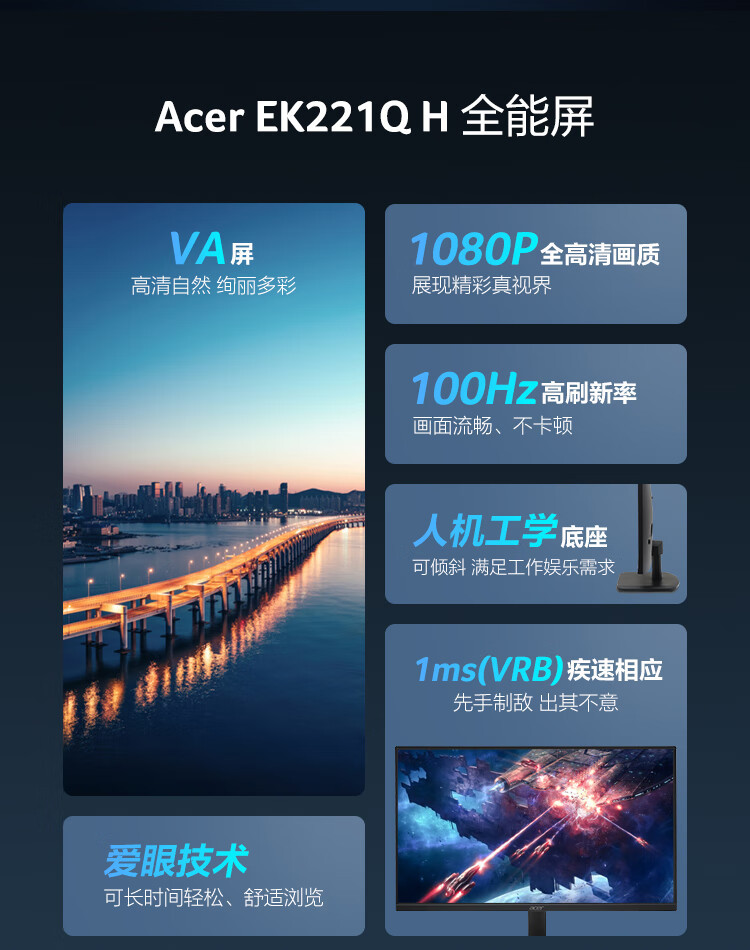 에이서 에이서 모니터 21.5inch 풀 HD 로우 블루라이트 벽걸이형 100HZ 고주사율 스크린 EK221Q스토어 가기