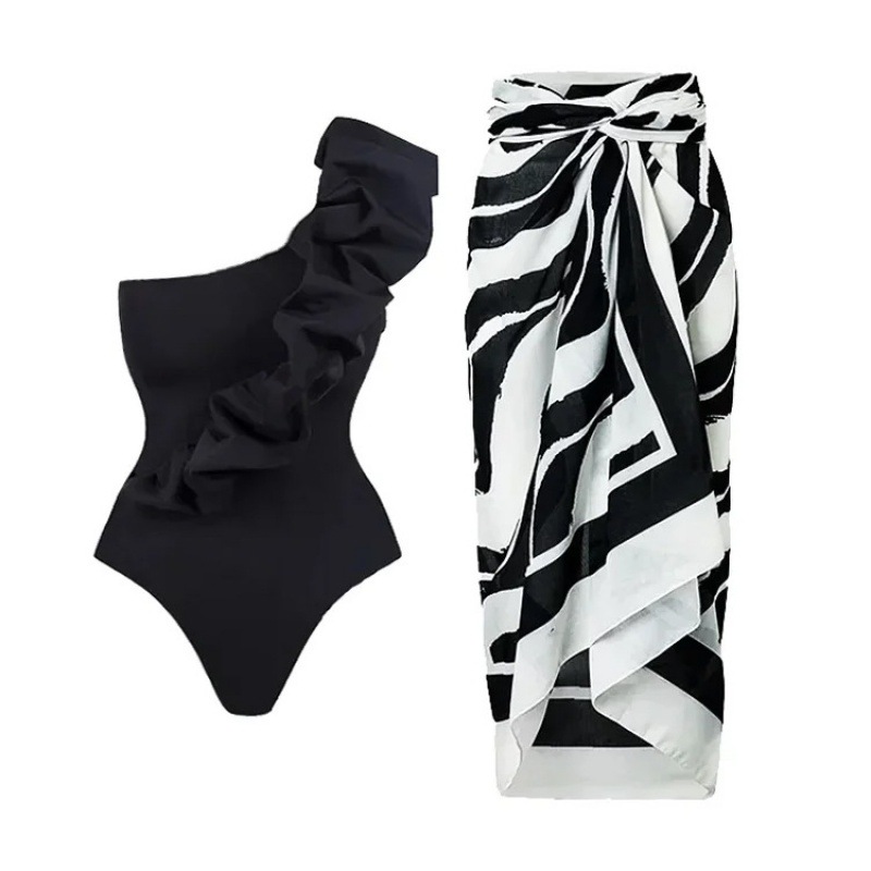 2024 유럽과 미국의 아마존 AliExpress 원피스 수영복 에어 레이어 장식 솔리드 컬러 고급 수영복 세트 여성