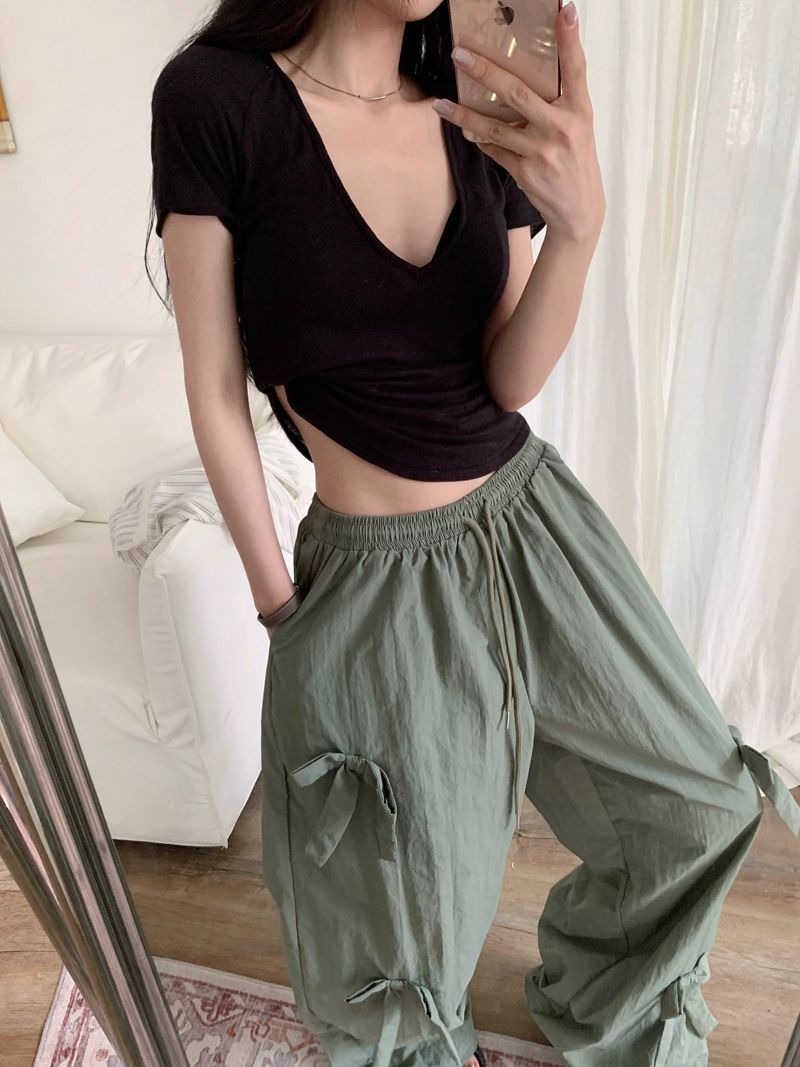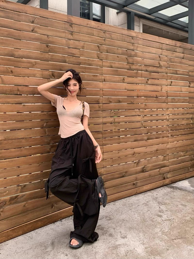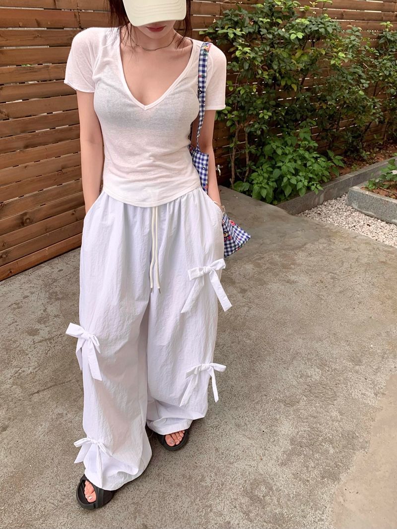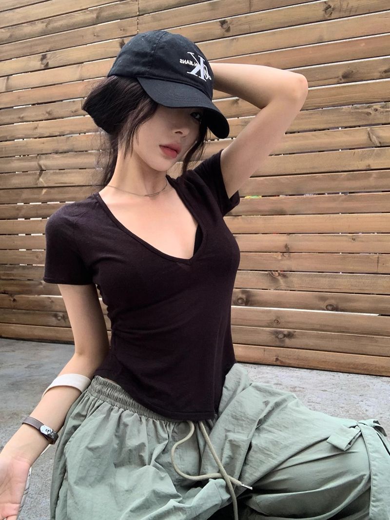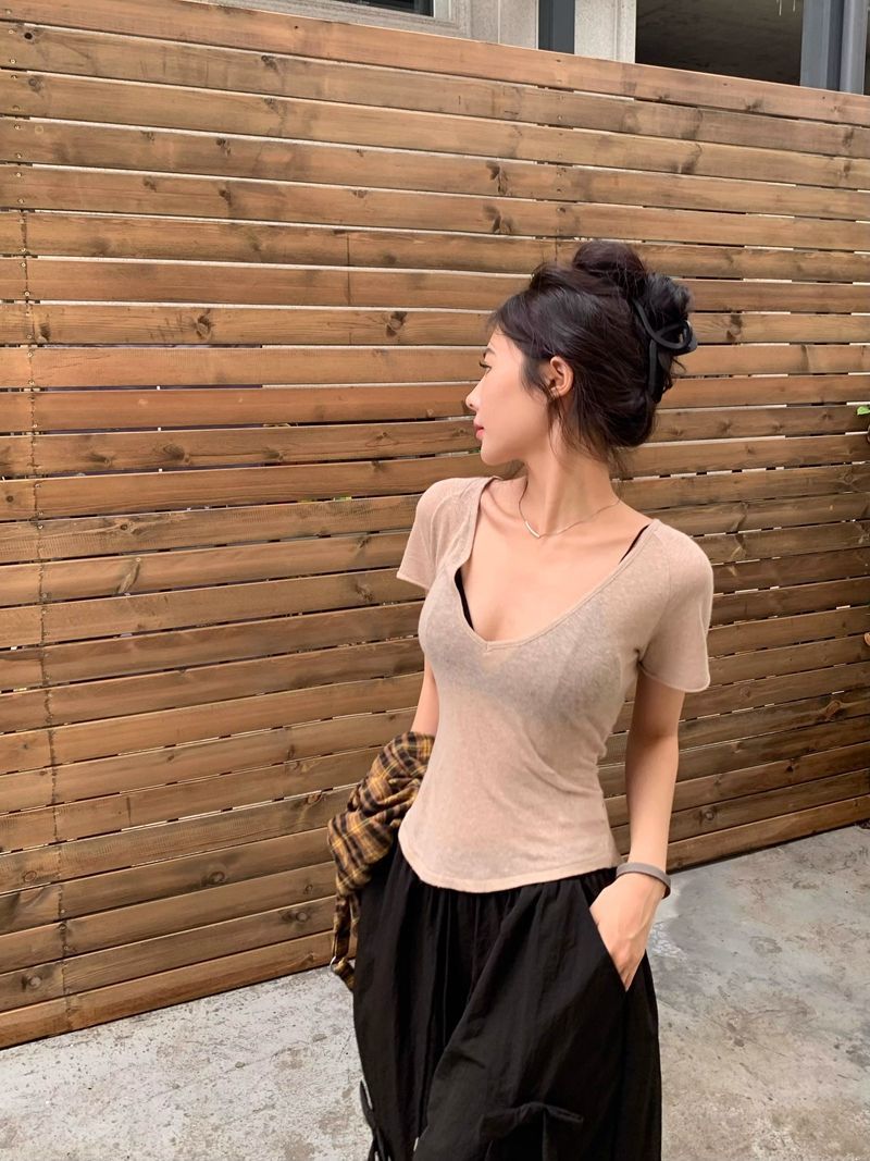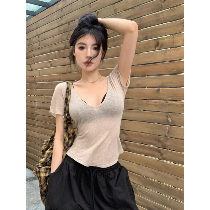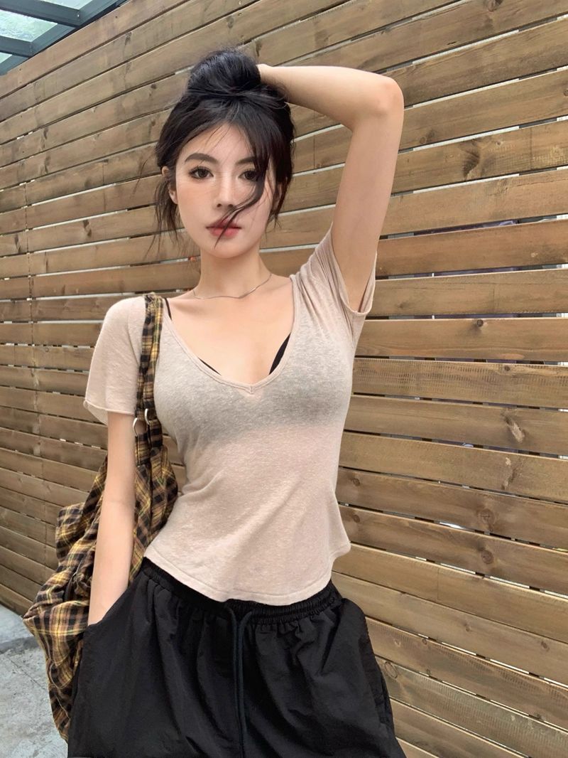 얇은 마이크로 투명 V 넥 반팔 티셔츠 여성용 여름 슬림 핏 슬리밍 올 매치 스파이스 걸스 캐주얼베이스 셔츠 솔리드 컬러 탑