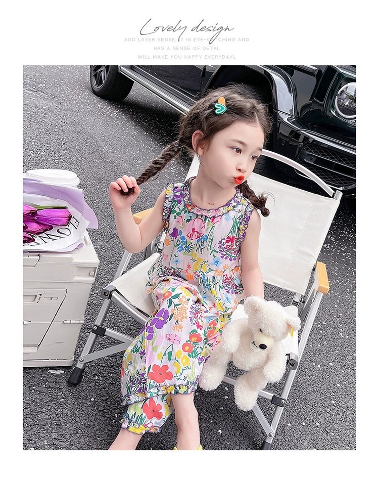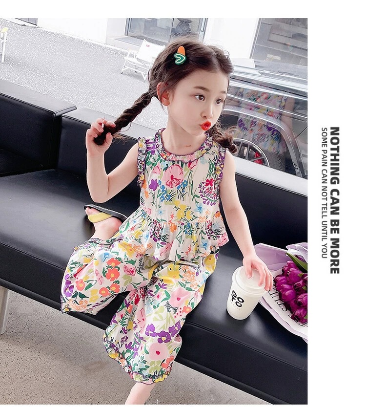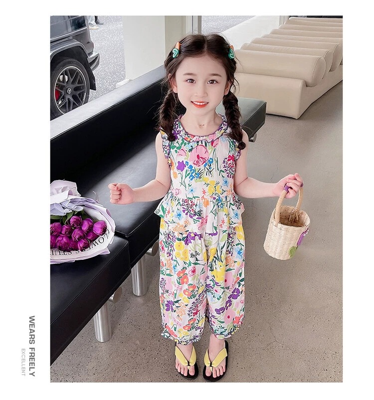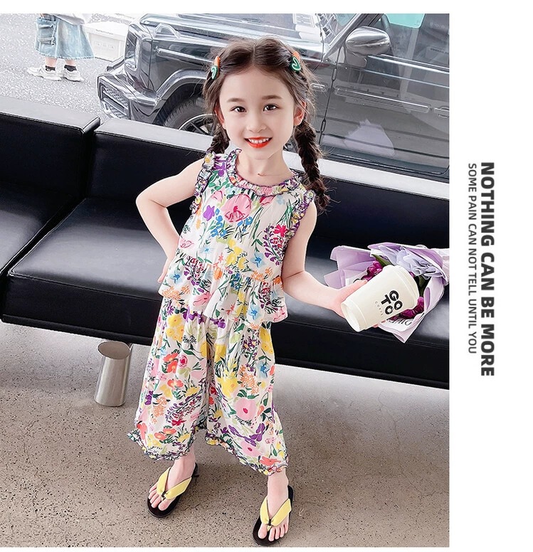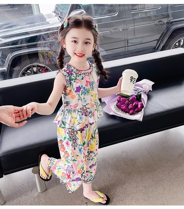 소녀 코튼 실크 세트 2024 아기 소녀 꽃을위한 여름 얇은 옷-프린트 민소매 조끼 넓은 다리 바지 투피스 유행 세트스토어 가기