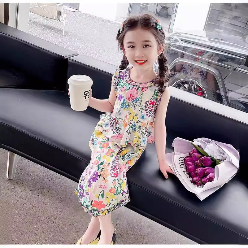소녀 코튼 실크 세트 2024 아기 소녀 꽃을위한 여름 얇은 옷-프린트 민소매 조끼 넓은 다리 바지 투피스 유행 세트