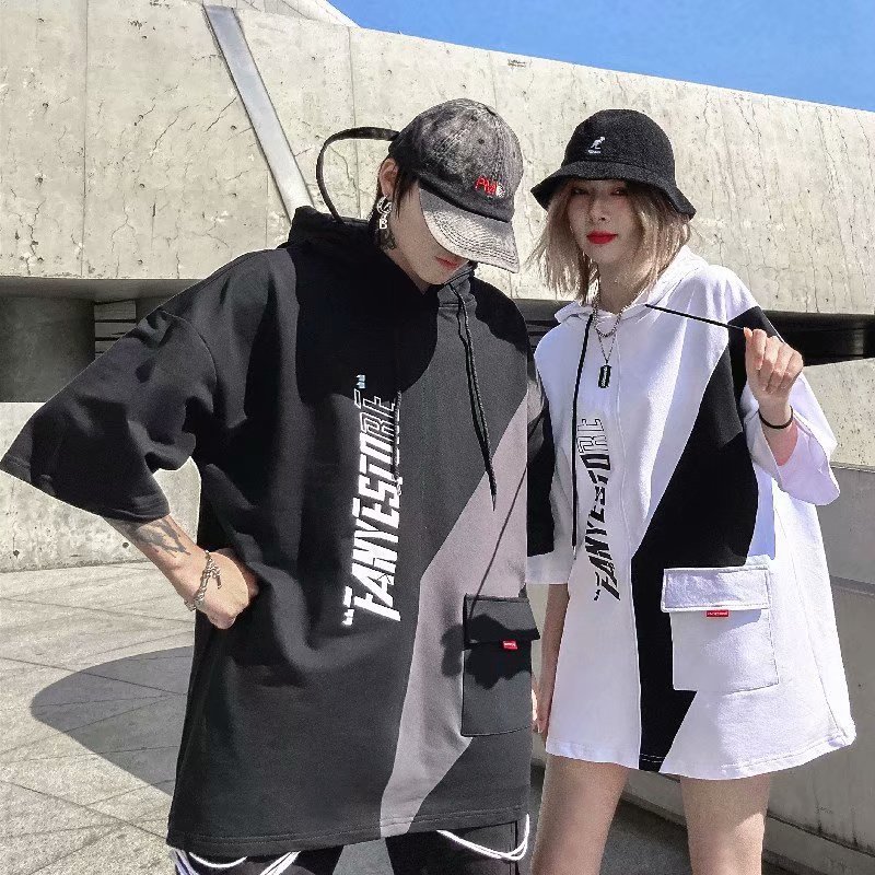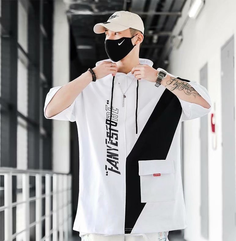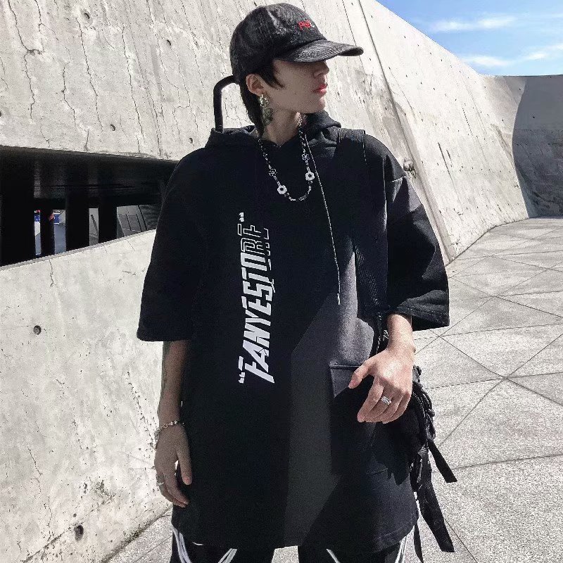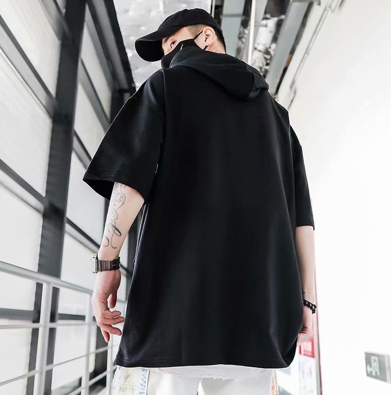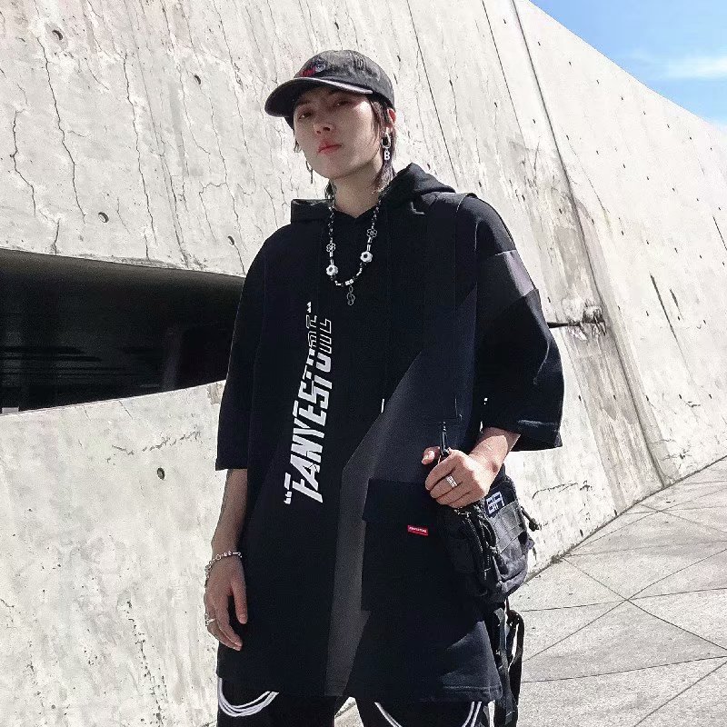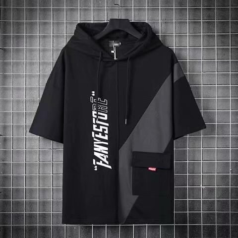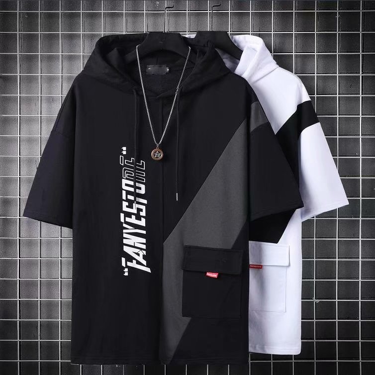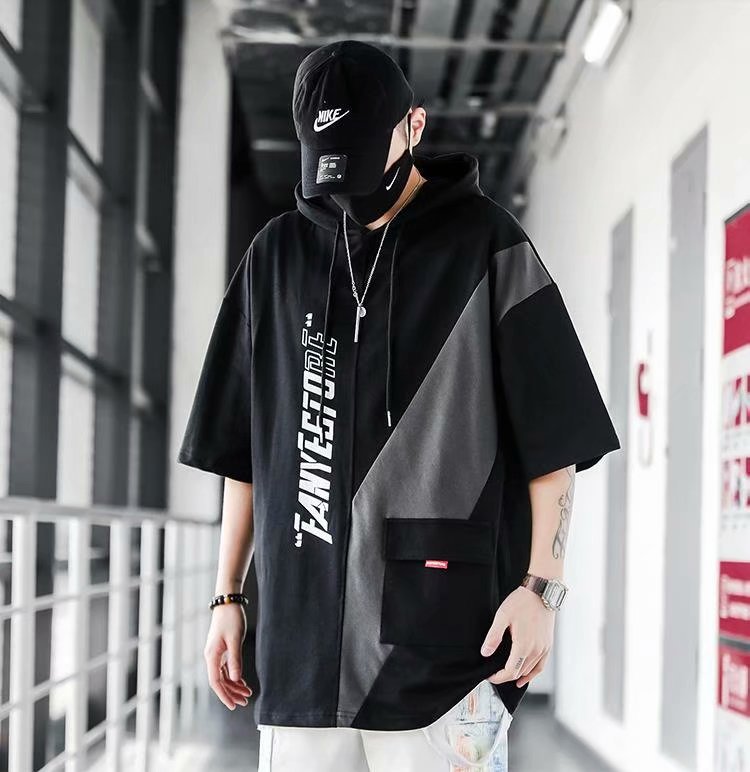 여름 후드 얇은 반소매 남성용 반소매 스웨터 티셔츠 트렌디 한 브랜드 미국식 루스와 핸섬 바느질 티셔츠