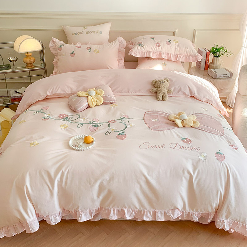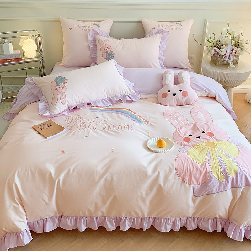 클래스 만화 스타일 면화 4 피스 세트 귀여운 토끼 자수 면화 소녀의 심장 퀼트 커버 침구