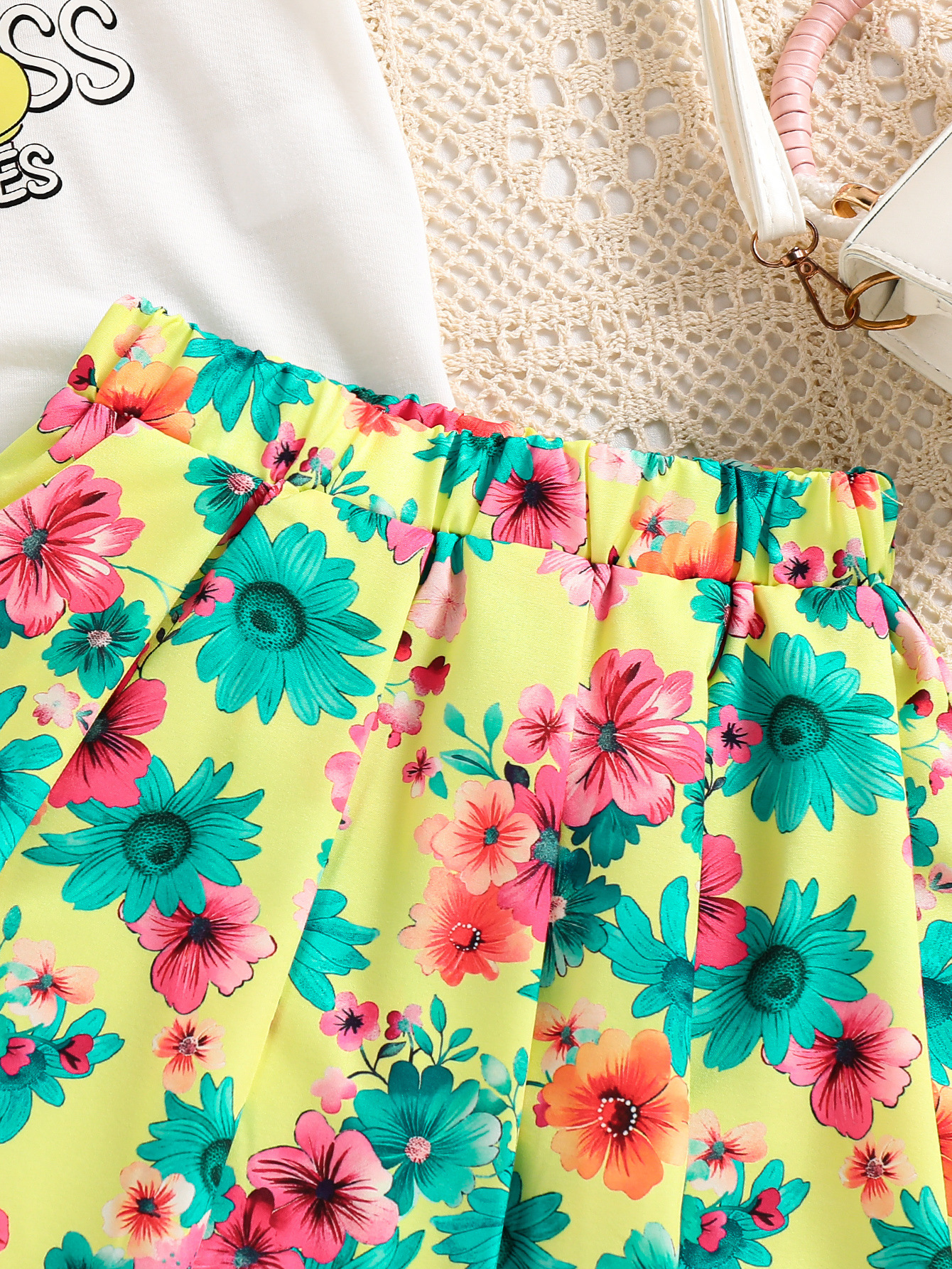 여아 여름 만화 프린트 반팔 티셔츠 + 유럽풍 꽃무늬 플리츠 스커트 투피스 세트 도매스토어 가기