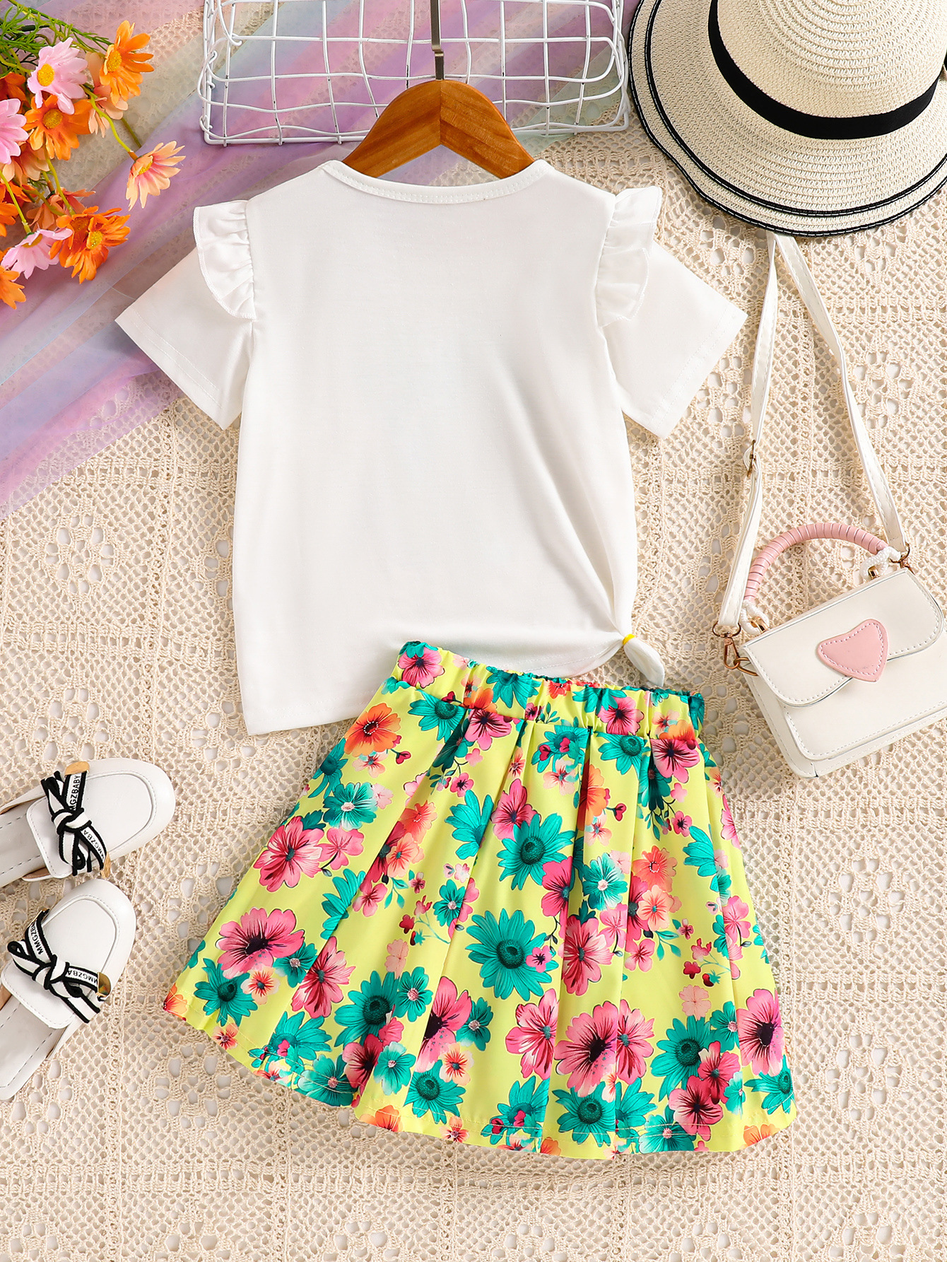 여아 여름 만화 프린트 반팔 티셔츠 + 유럽풍 꽃무늬 플리츠 스커트 투피스 세트 도매