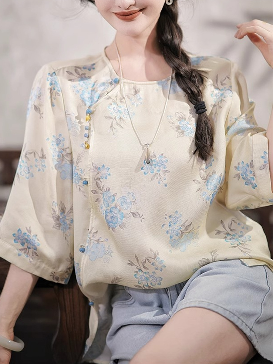 | Zhen 실크 꽃 Luo. 프린트 코트 | 2024 새로운 블루 프린트 새로운 중국 스타일의 작은 셔츠