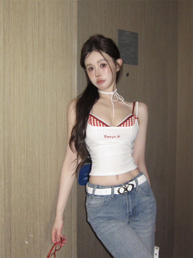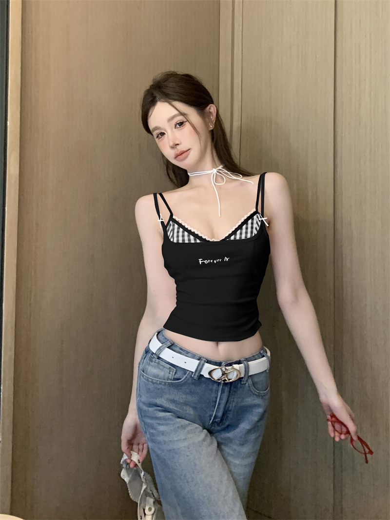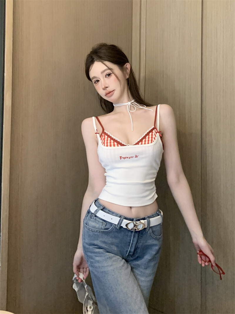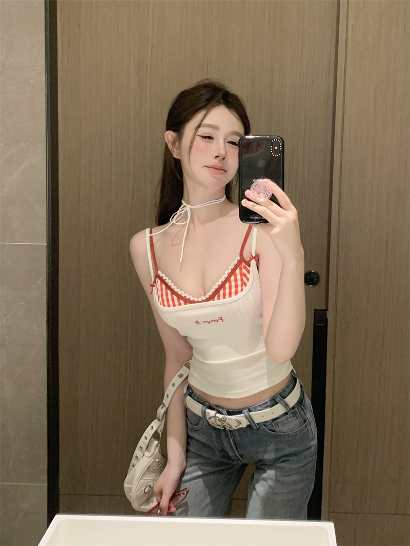 미국식 핫 체크 무늬 가짜 투피스 카미 솔 조끼 여성 아우터웨어 여름 태국 스타일의 스위트 스파이스 걸 튜브 탑 가슴