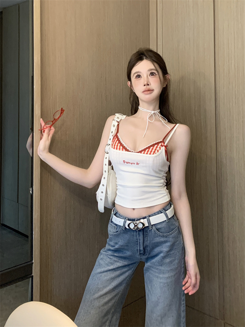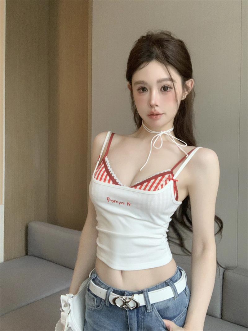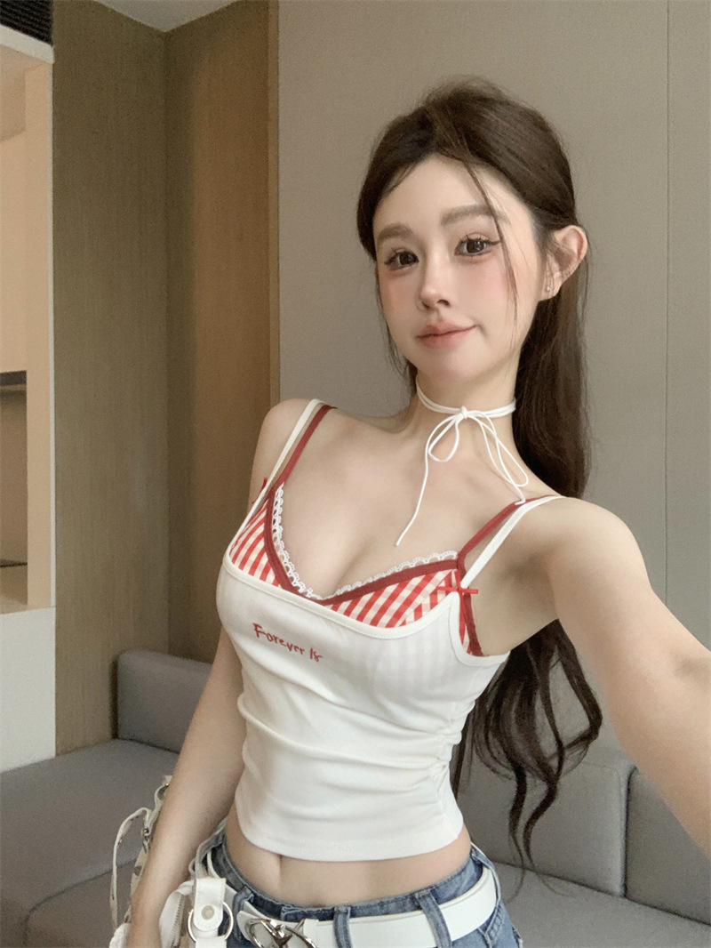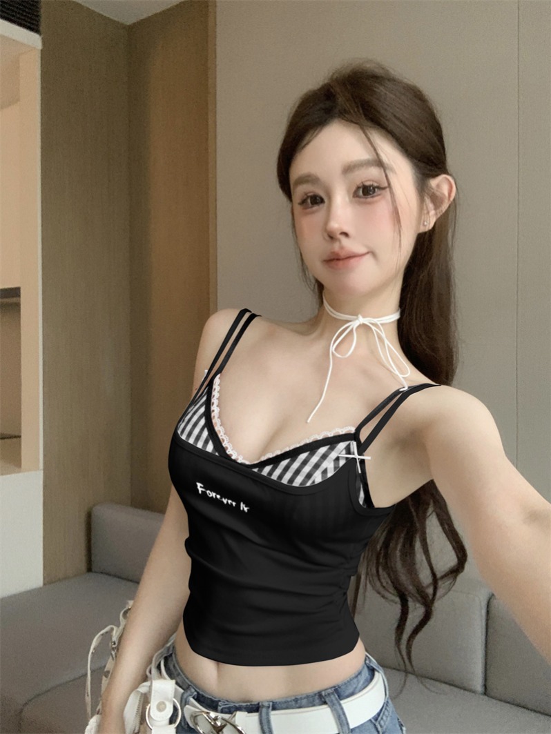 미국식 핫 체크 무늬 가짜 투피스 카미 솔 조끼 여성 아우터웨어 여름 태국 스타일의 스위트 스파이스 걸 튜브 탑 가슴