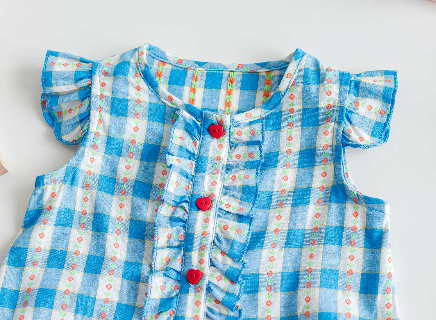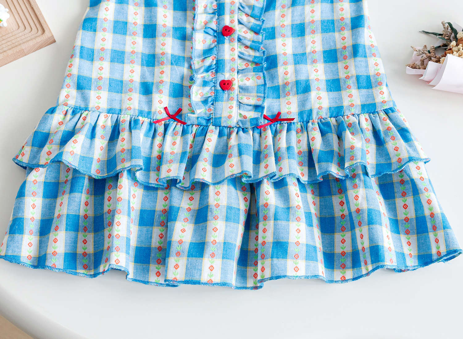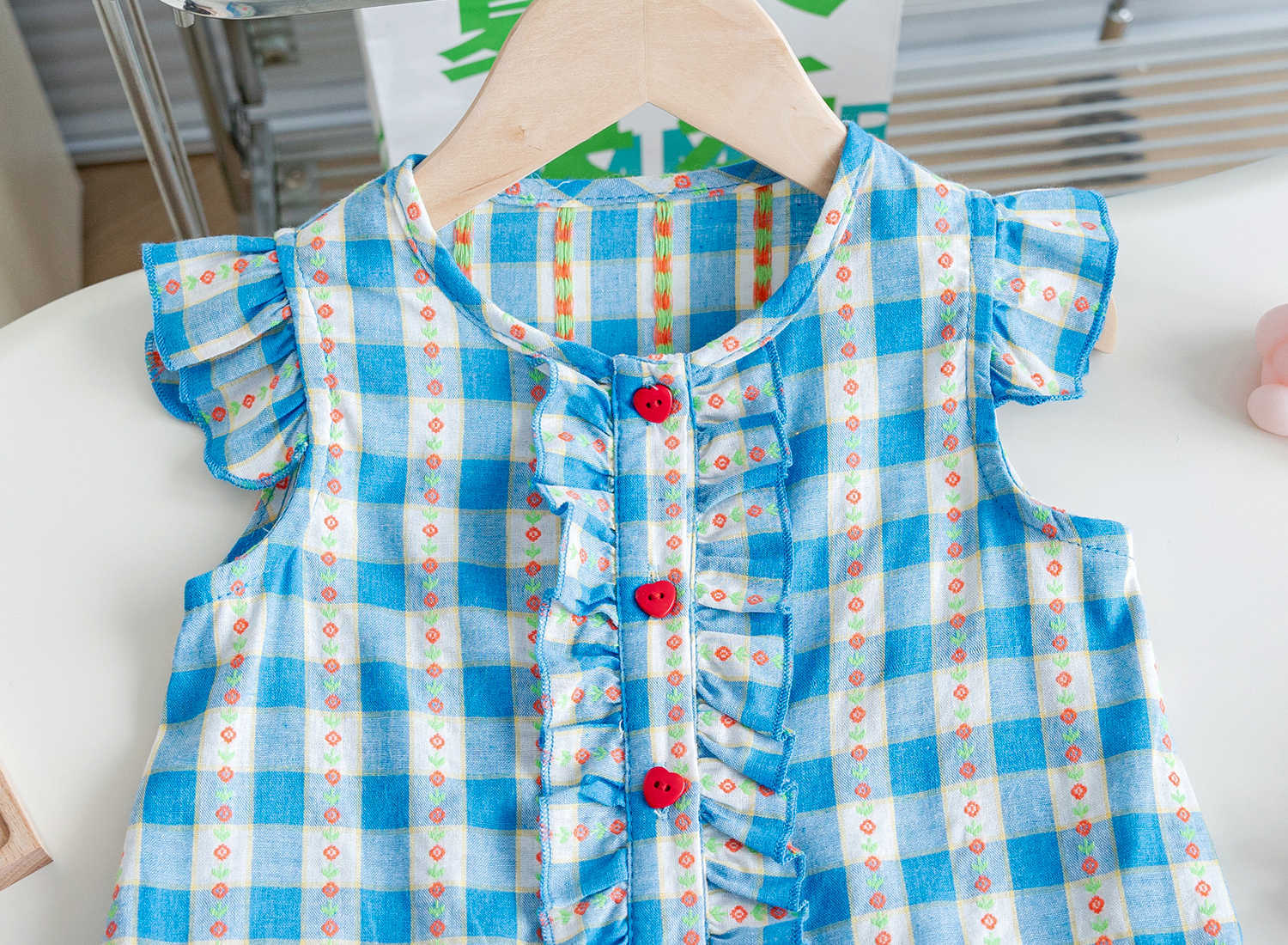 여아용 아동복 어린이 여름 세련 된 파란 격자 무늬 빈 치마 아기 소녀 유행 한국 공주 원피스