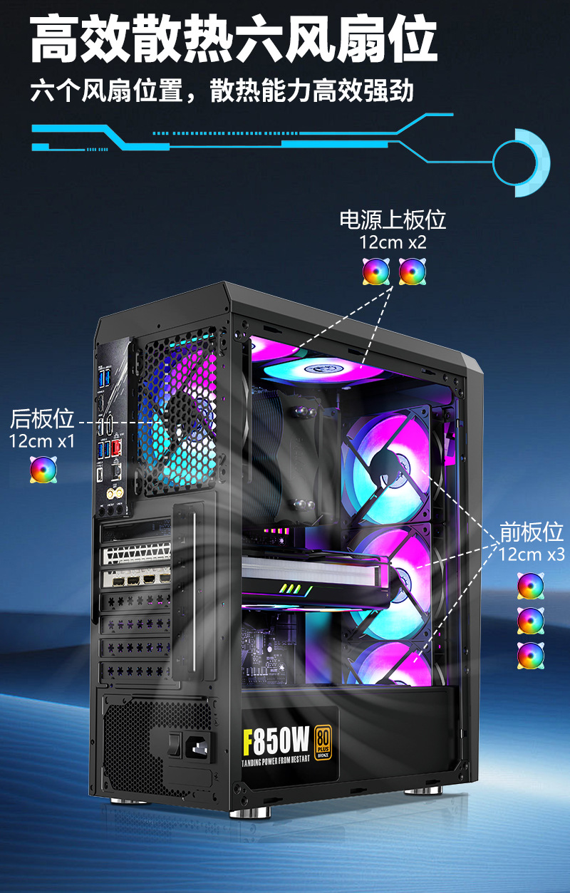 • 검정색 데스크탑 수냉식 게임 케이스(RGB 팬 6개 포함)