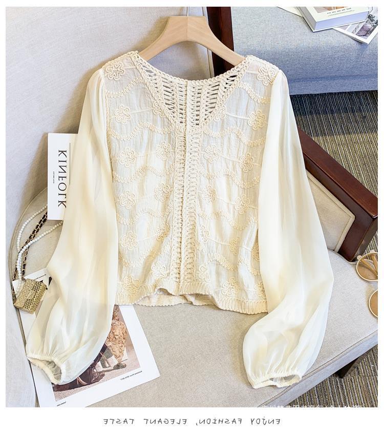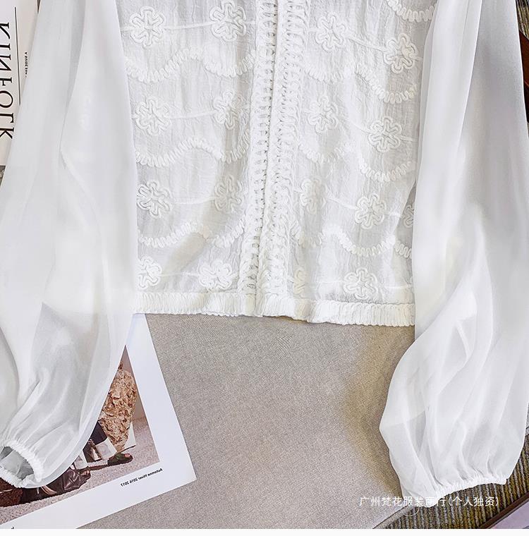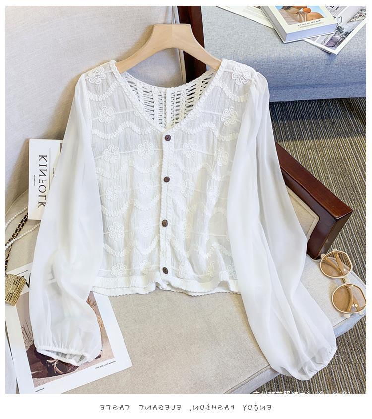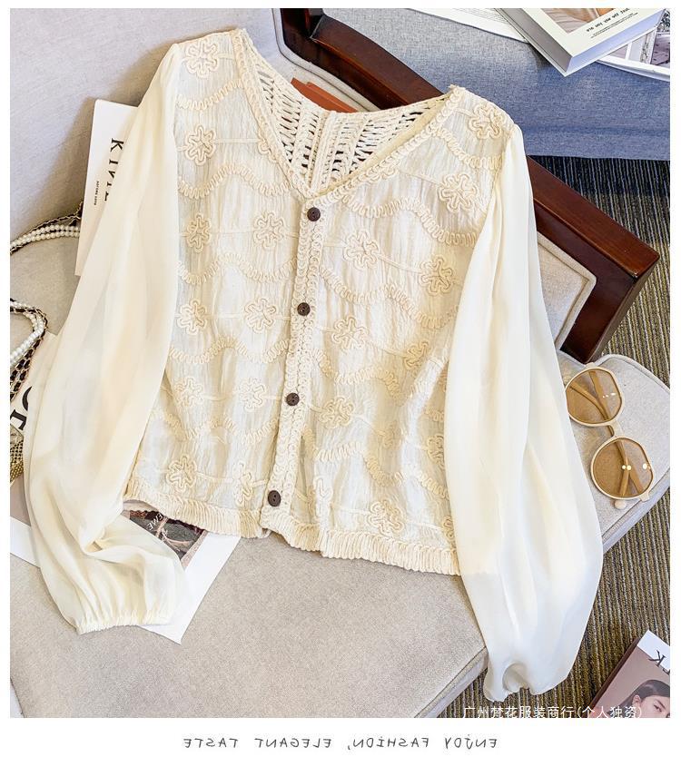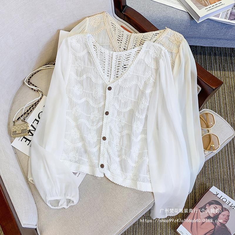 프랑스 스타일 레이스 셔츠 여성의 봄과 여름 세련된 디자인 센스 쇼트 탑 웨스턴 스타일 틈새 긴 소매 클랩 쉬폰 셔츠