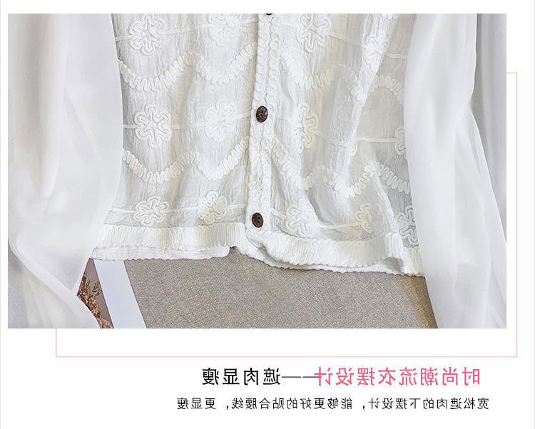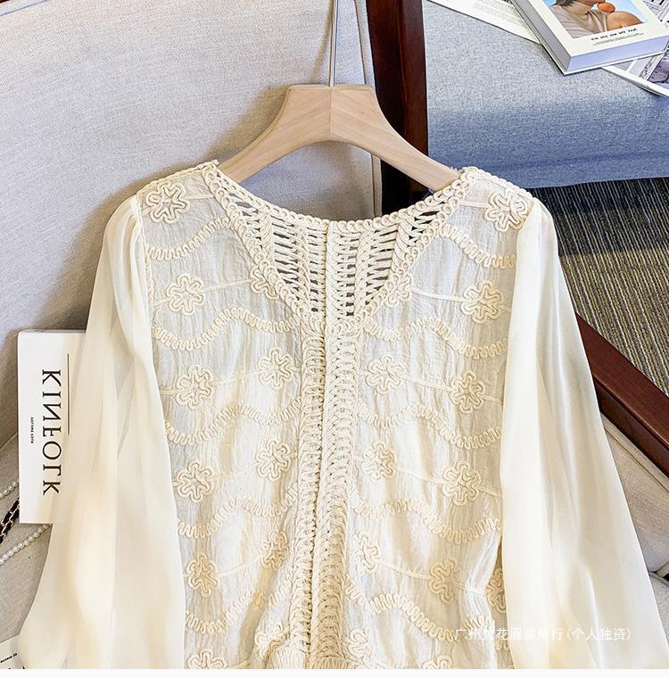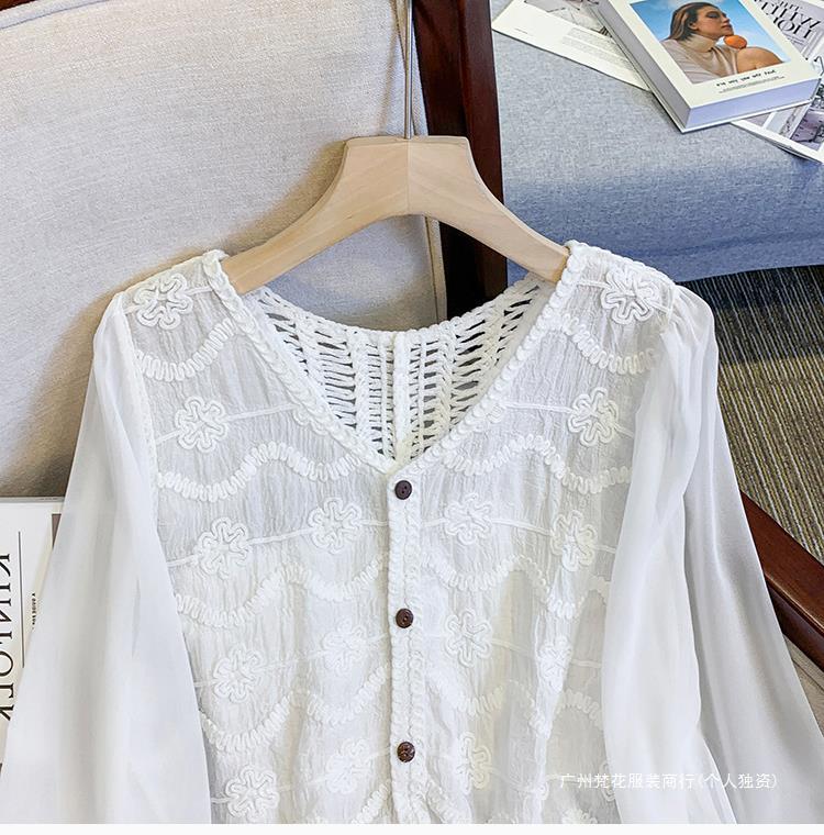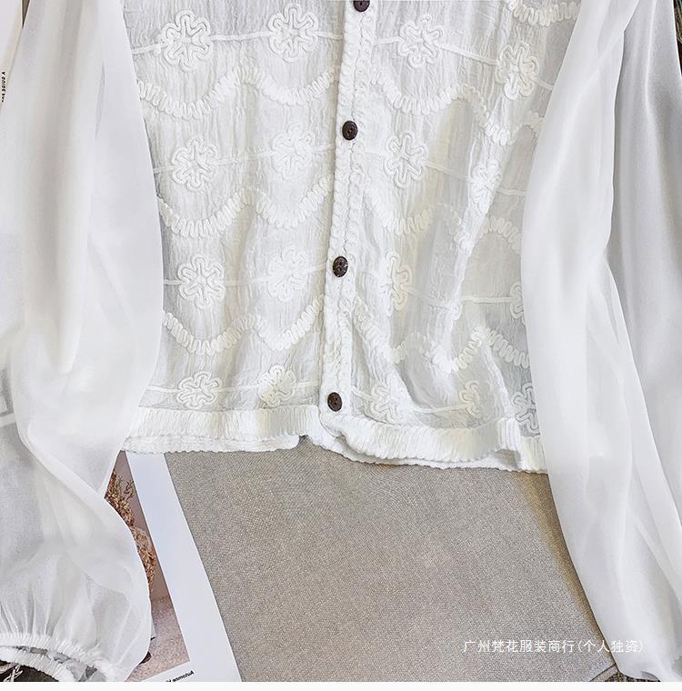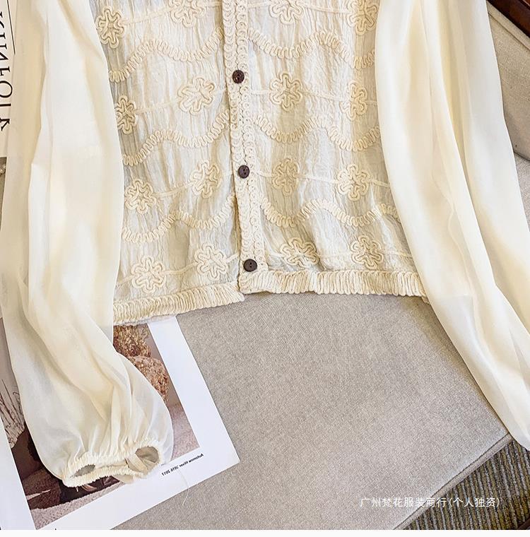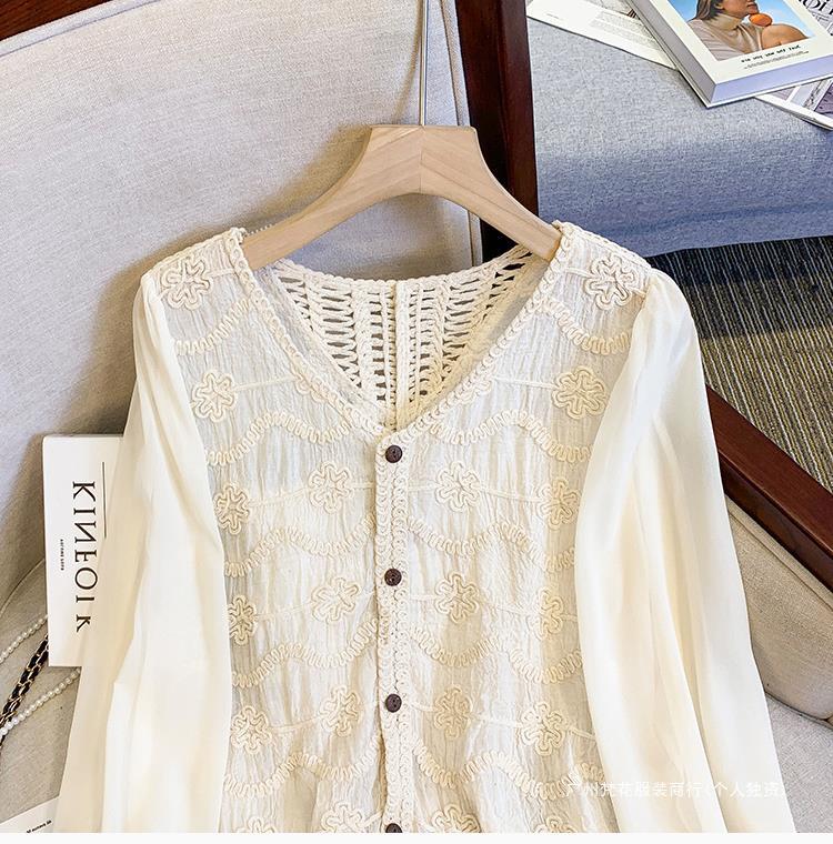 프랑스 스타일 레이스 셔츠 여성의 봄과 여름 세련된 디자인 센스 쇼트 탑 웨스턴 스타일 틈새 긴 소매 클랩 쉬폰 셔츠